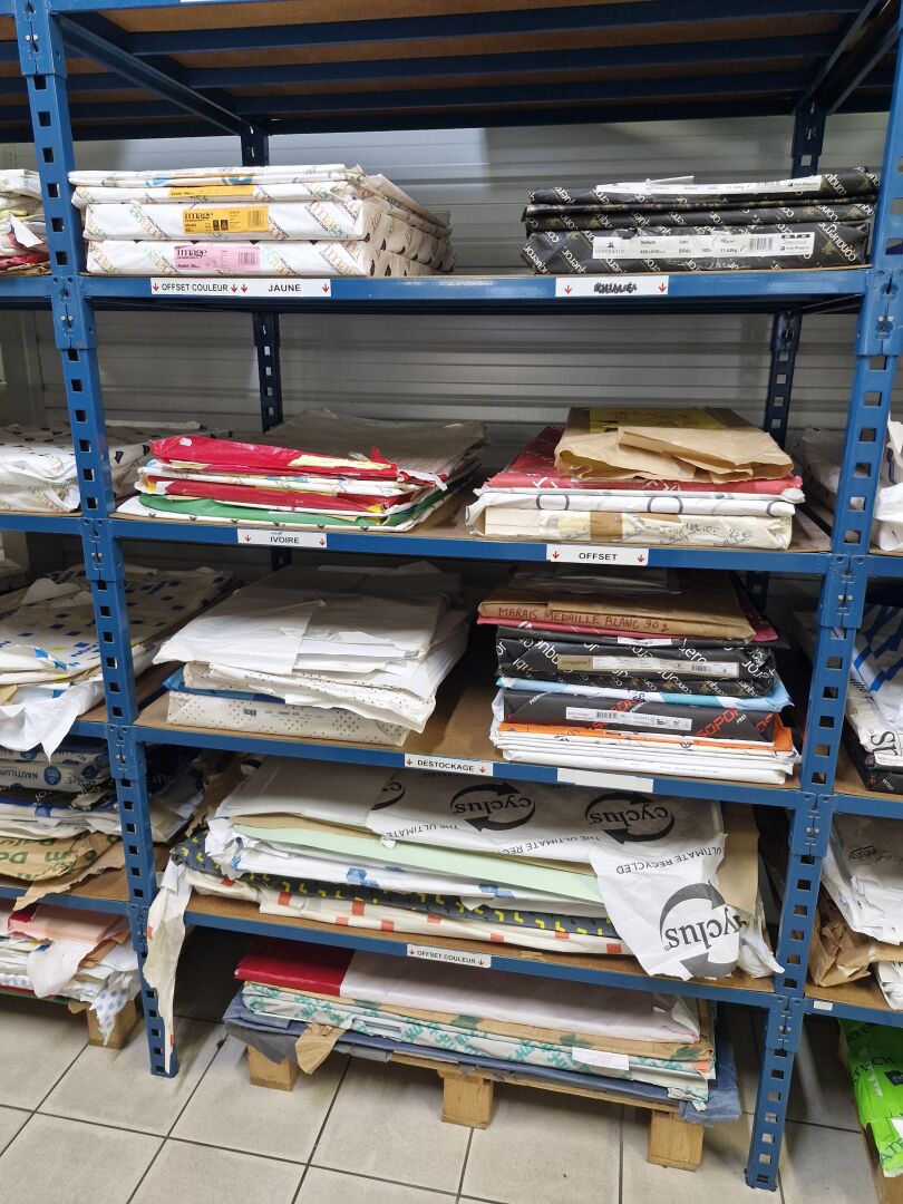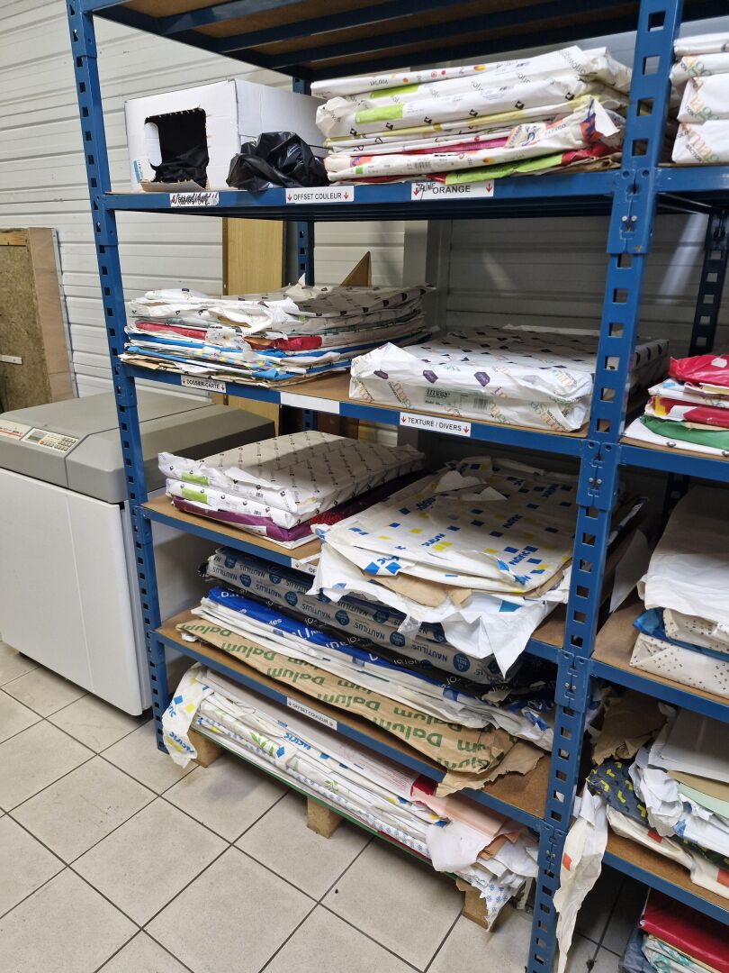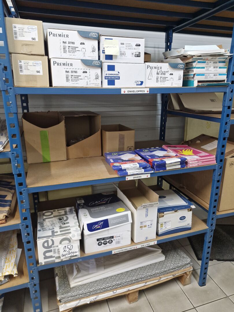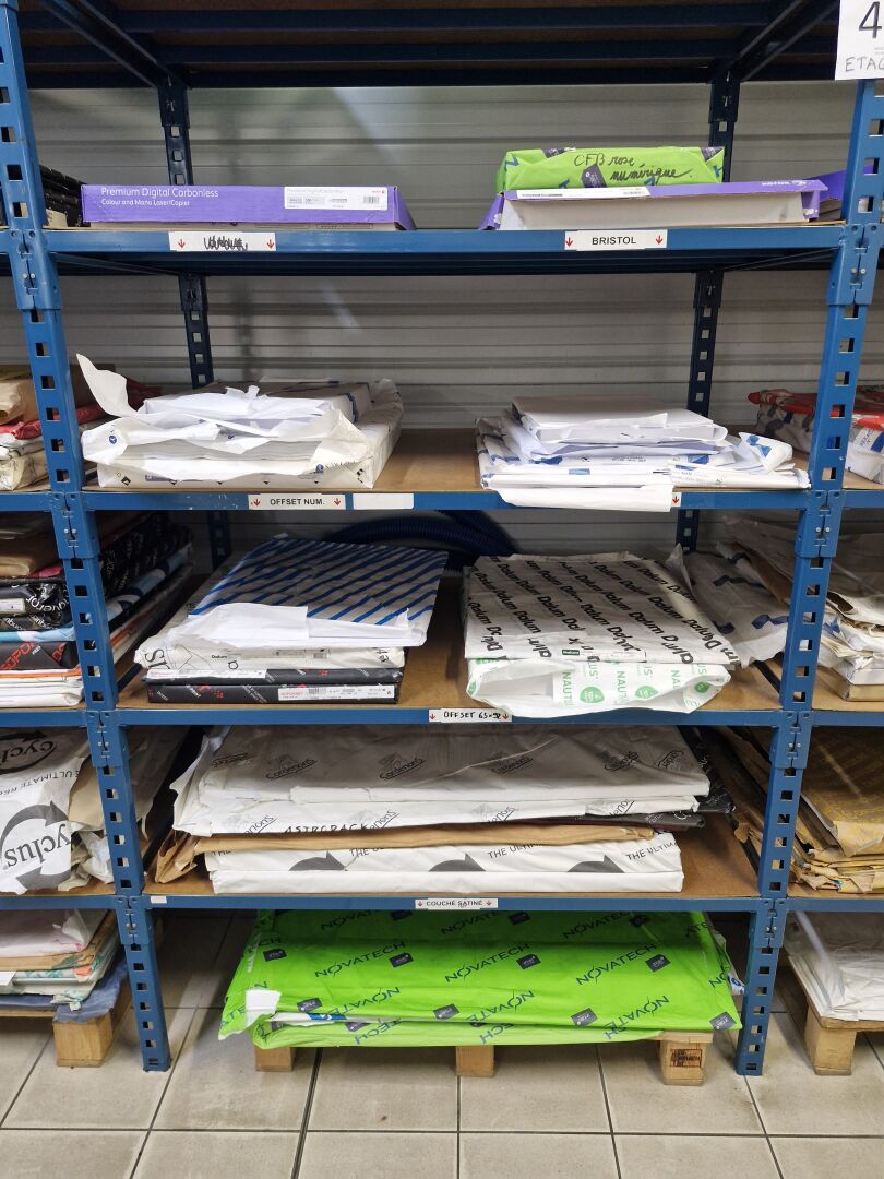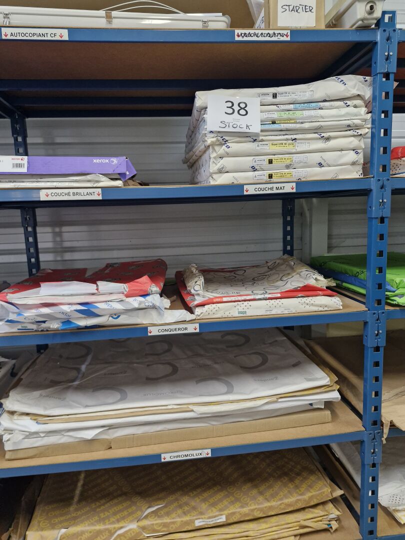 Dans 8 modules d'étagères : 1 stock de papier dont papier étiquettes, couché brillant, couché mat, couché satiné, chromolux, conqueror, offset, bristol, couché différents coloris, texturés ... boites d'enveloppes et 1 léger stock de cartons d'emballage