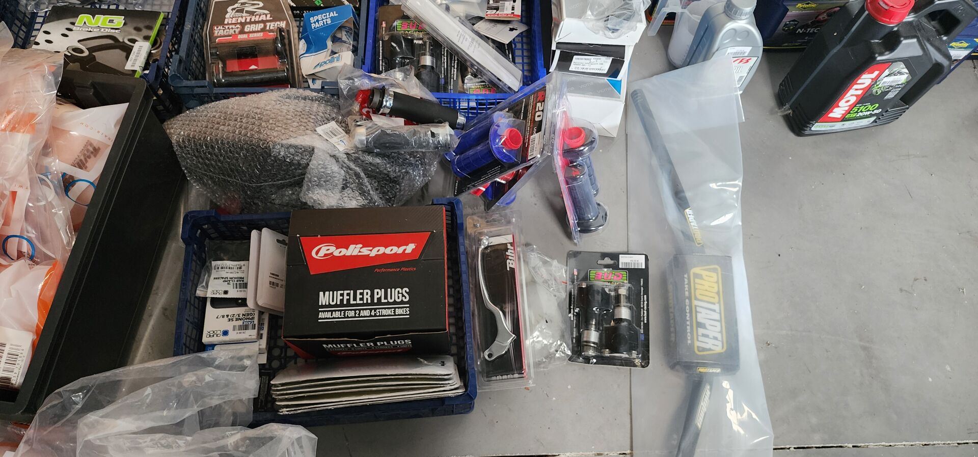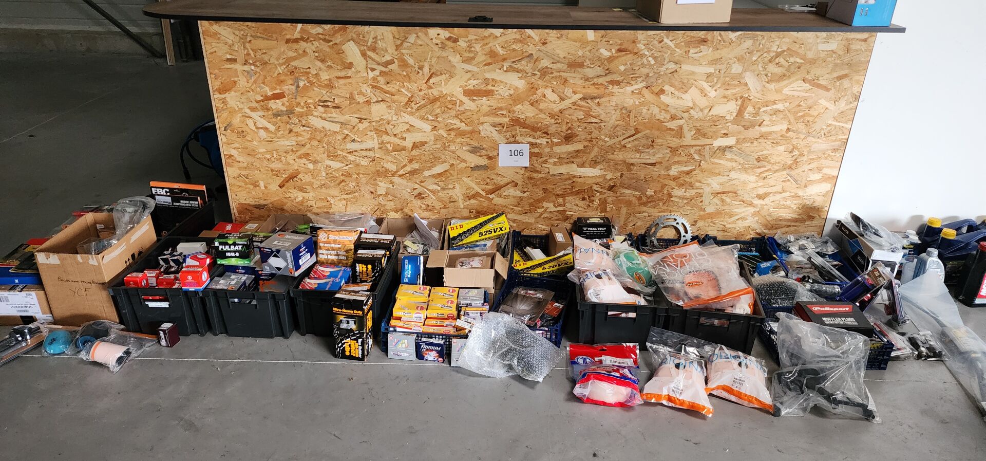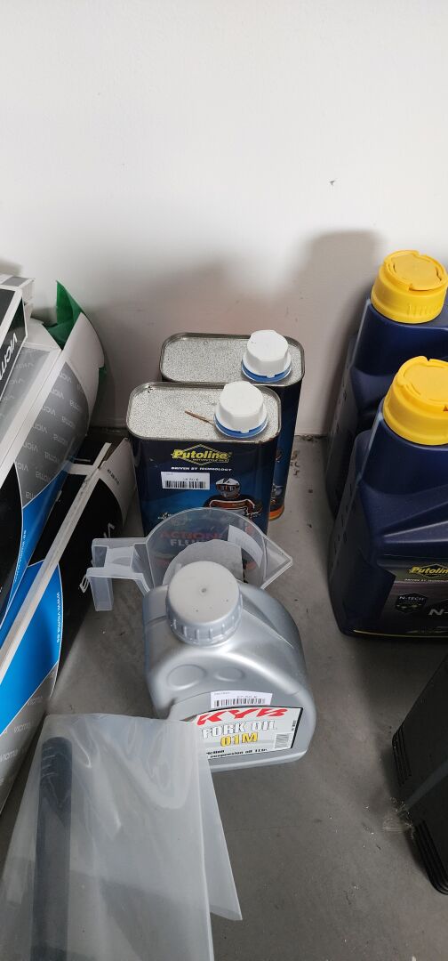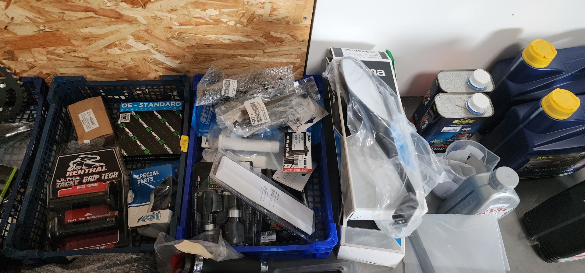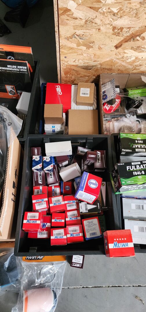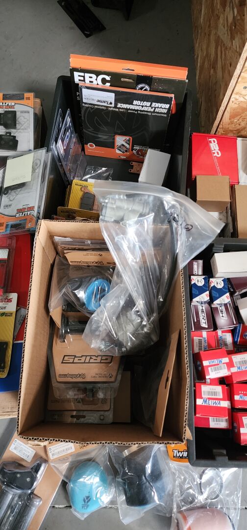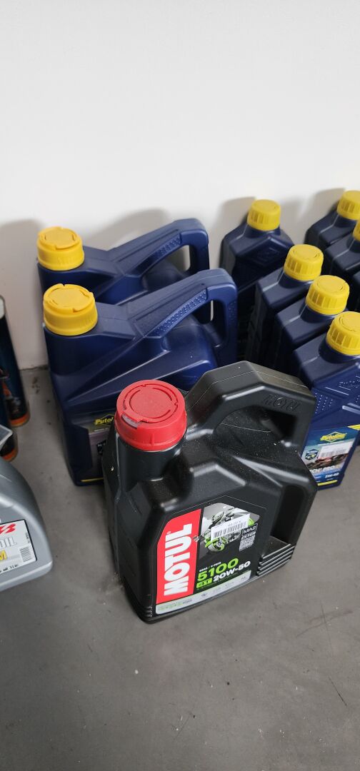 1 lot de pieces, accessoires et entretien pour 2 roues comprenant: plaquettes de frein dont SBS, BREMBO, filtres à air dont TWIN AIR, YCF, filtres à huile dont MEIWA, batteries dont FULBAT, TECNIUM, chambre à air dont VEE RUBBER, bougies dont NGK, câbles de transmission, différents types de joints dont: joint de couvercle de valve, joints de carter etc, 3 chaînes D.I.D 525VX3 et 520VX3, poignéees RENTHAL, YCF, levier de frein, rétroviseur VICMA, 2 bidons d'huile de filtre à air PUTOLINE de 1L, 1 bidon d'huile moteur MOTUL 4 temps 20W-50, 2 bidons d'huile moteur PUTOLINE 4 temps 5W-40 en 4L, 4 bidons d'huile moteur PUTOLINE 5W-40 en 1L, 4 bidons d'huile de boîte de vitesse PUTOLINE n-tech trans GP en 1L, huile de fourche, liquide d'embrayge etc...