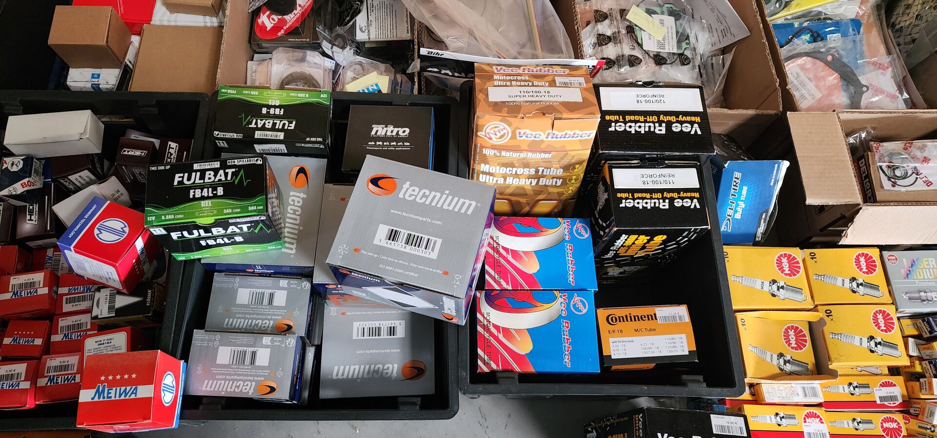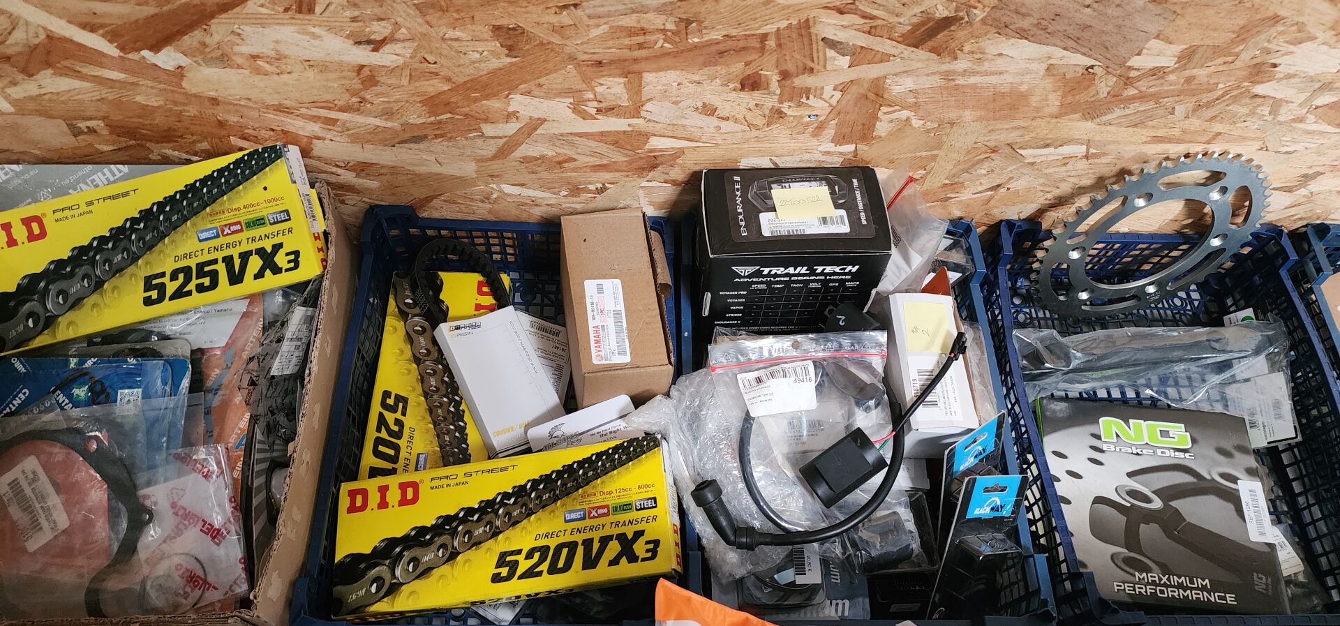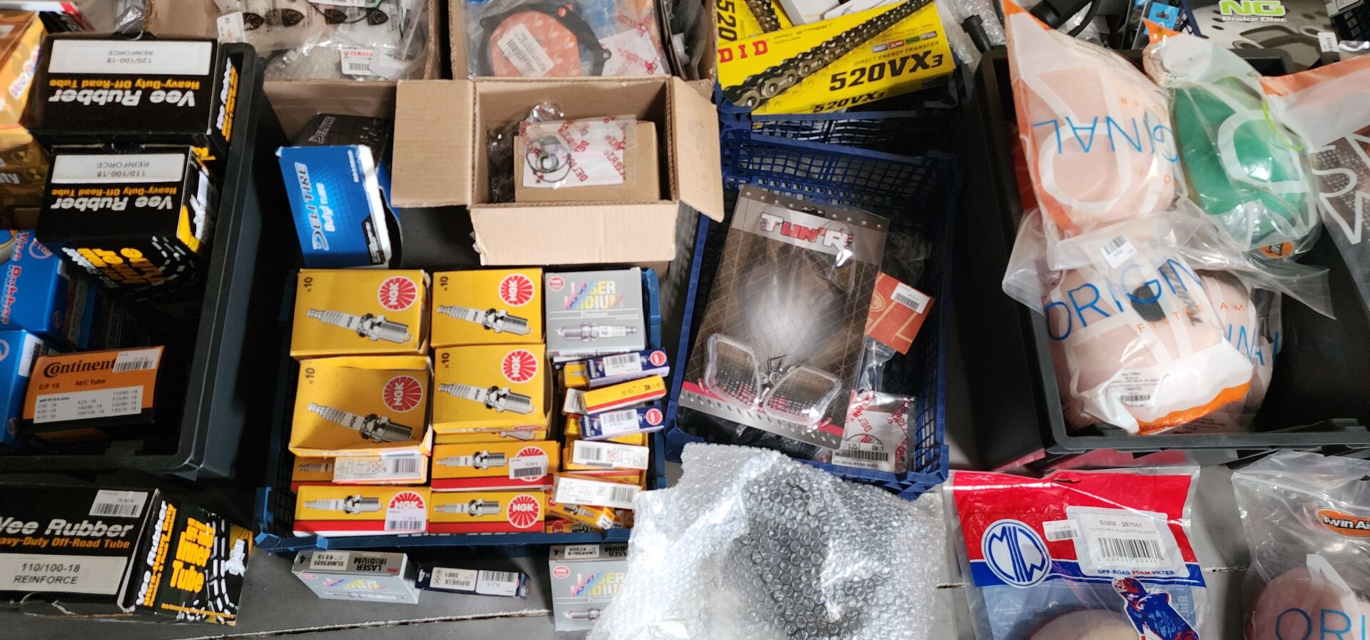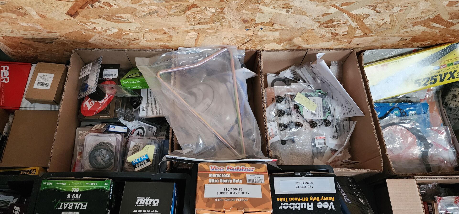 1 lot de pieces, accessoires et entretien pour 2 roues comprenant: plaquettes de frein dont SBS, BREMBO, filtres à air dont TWIN AIR, YCF, filtres à huile dont MEIWA, batteries dont FULBAT, TECNIUM, chambre à air dont VEE RUBBER, bougies dont NGK, câbles de transmission, différents types de joints dont: joint de couvercle de valve, joints de carter etc, 3 chaînes D.I.D 525VX3 et 520VX3, poignéees RENTHAL, YCF, levier de frein, rétroviseur VICMA, 2 bidons d'huile de filtre à air PUTOLINE de 1L, 1 bidon d'huile moteur MOTUL 4 temps 20W-50, 2 bidons d'huile moteur PUTOLINE 4 temps 5W-40 en 4L, 4 bidons d'huile moteur PUTOLINE 5W-40 en 1L, 4 bidons d'huile de boîte de vitesse PUTOLINE n-tech trans GP en 1L, huile de fourche, liquide d'embrayge etc...