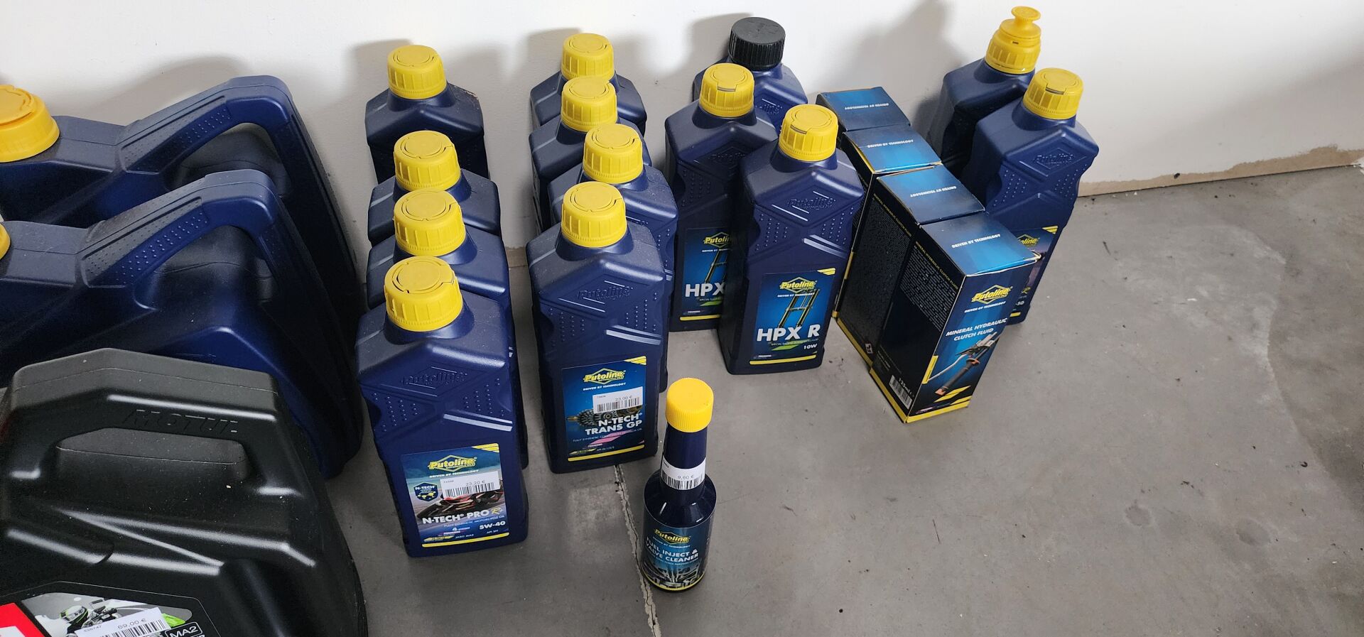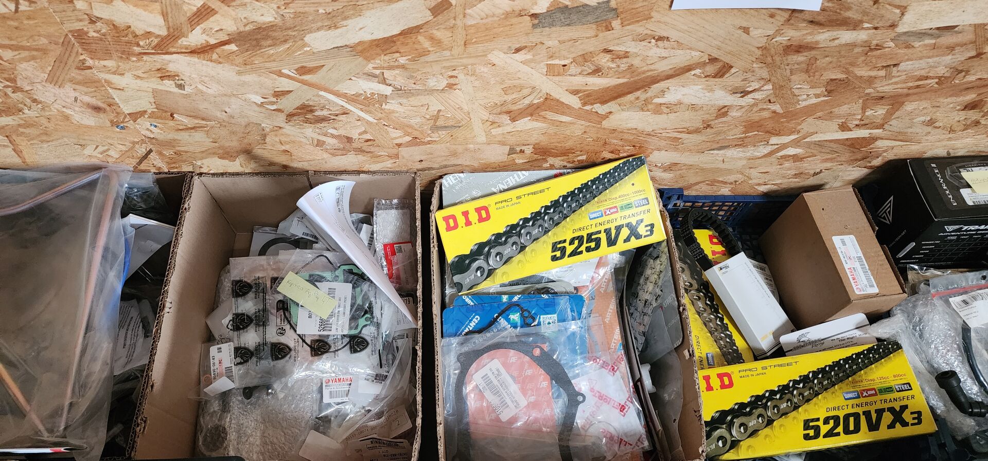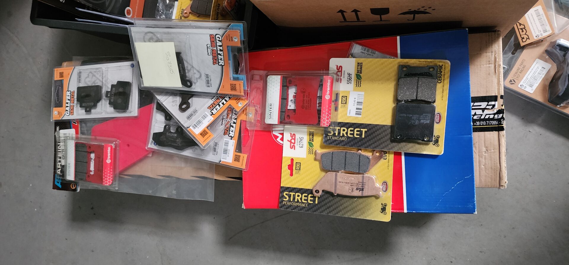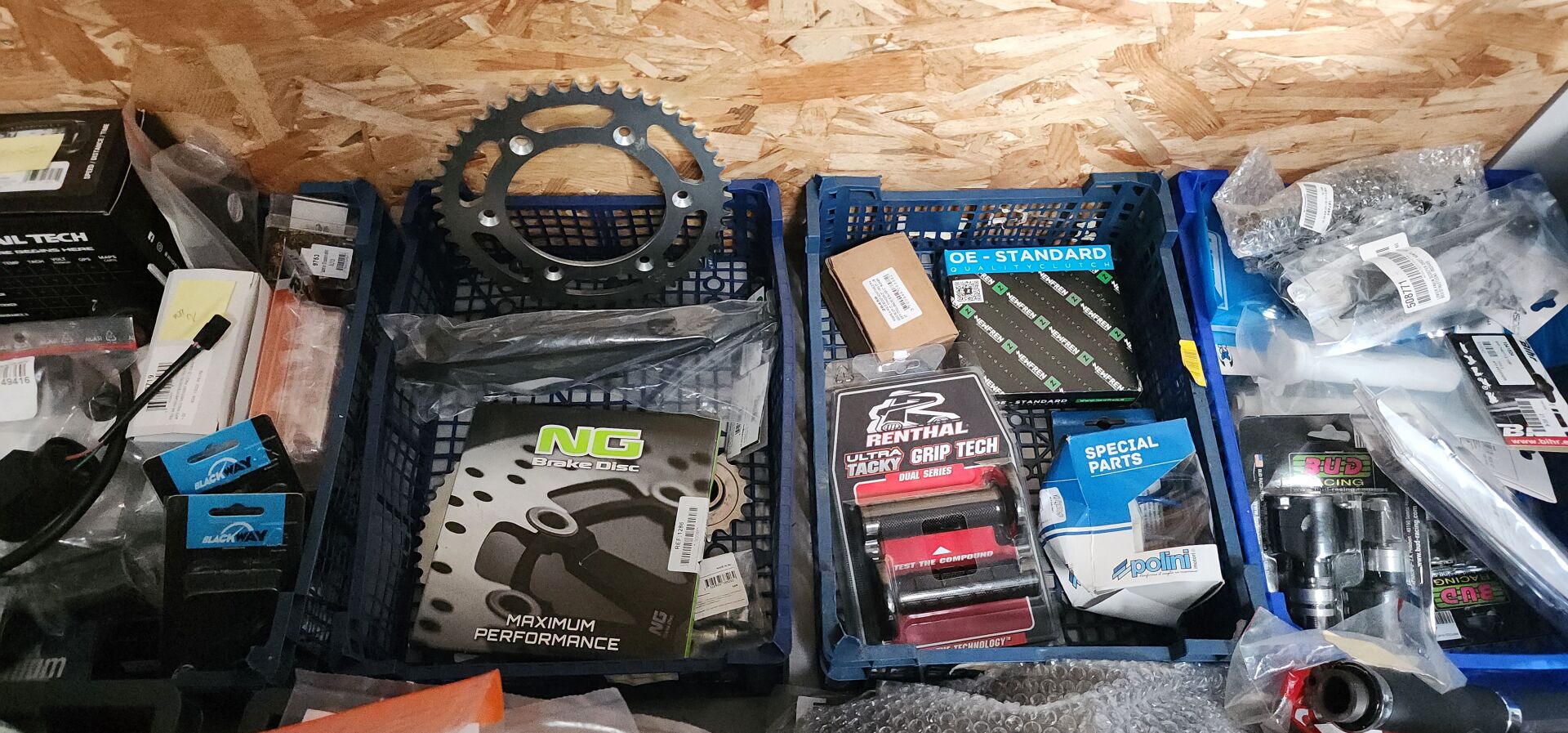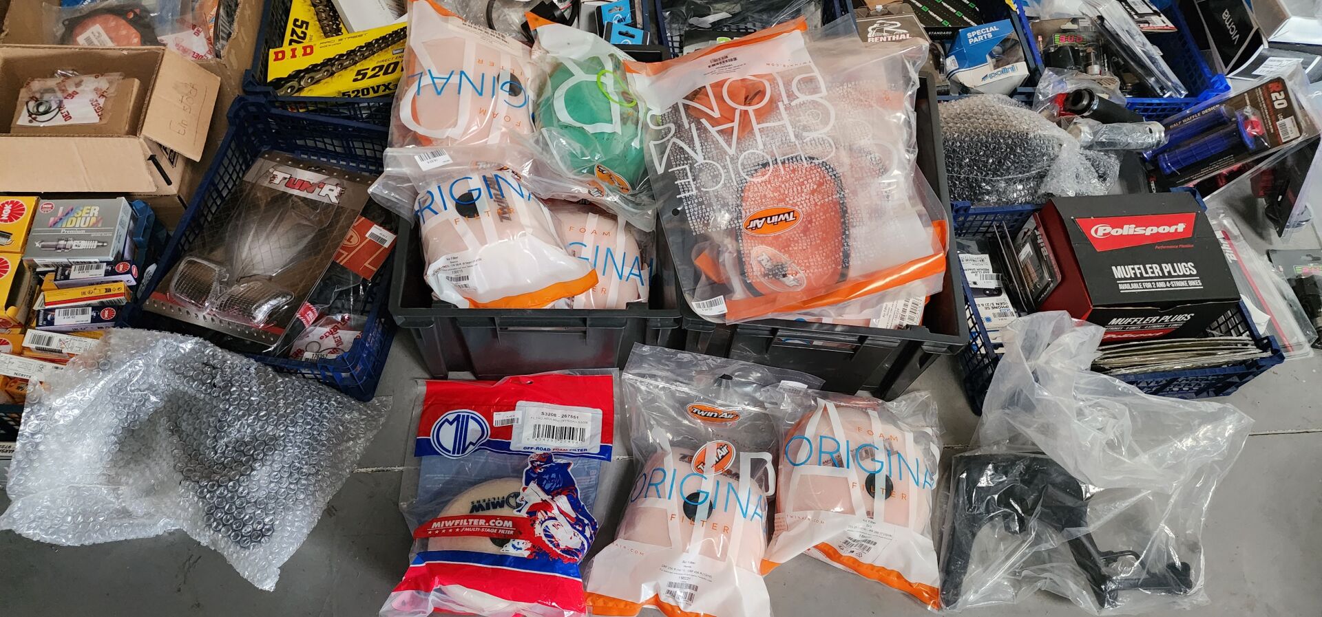 1 lot de pieces, accessoires et entretien pour 2 roues comprenant: plaquettes de frein dont SBS, BREMBO, filtres à air dont TWIN AIR, YCF, filtres à huile dont MEIWA, batteries dont FULBAT, TECNIUM, chambre à air dont VEE RUBBER, bougies dont NGK, câbles de transmission, différents types de joints dont: joint de couvercle de valve, joints de carter etc, 3 chaînes D.I.D 525VX3 et 520VX3, poignéees RENTHAL, YCF, levier de frein, rétroviseur VICMA, 2 bidons d'huile de filtre à air PUTOLINE de 1L, 1 bidon d'huile moteur MOTUL 4 temps 20W-50, 2 bidons d'huile moteur PUTOLINE 4 temps 5W-40 en 4L, 4 bidons d'huile moteur PUTOLINE 5W-40 en 1L, 4 bidons d'huile de boîte de vitesse PUTOLINE n-tech trans GP en 1L, huile de fourche, liquide d'embrayge etc...