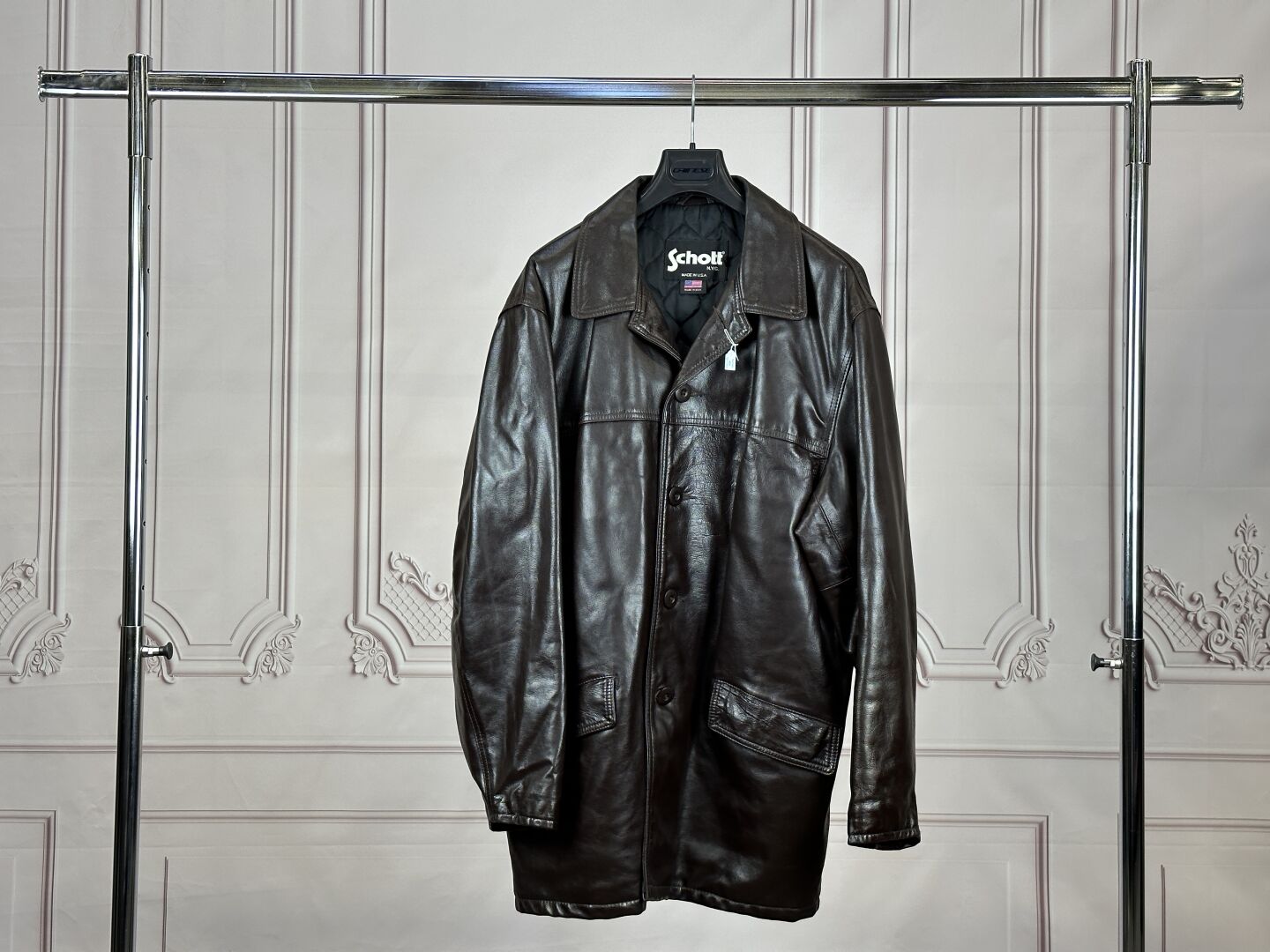 SCHOTT - Manteau en cuir marron, simple boutonnage. Taille L, bel état.