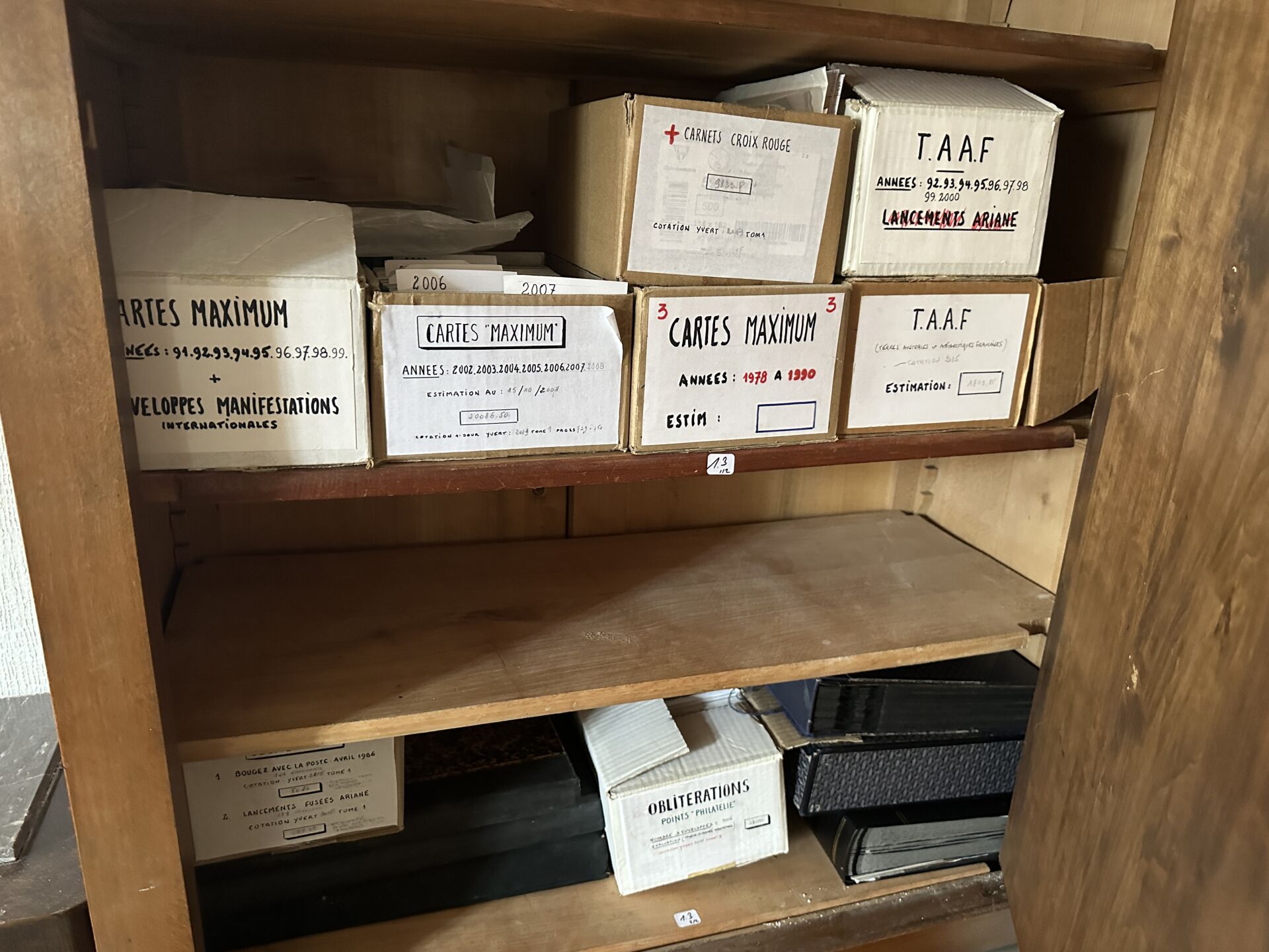 DANS LA CHAMBRE 1 Réunion de cinq petits cartons comprenant des cartes "Maximum" de 1978 à 2009, des T.A.A.F. Et six albums et deux cartons d'oblitérations. On joint un craton de carnets Croix rouge non oblitérés.