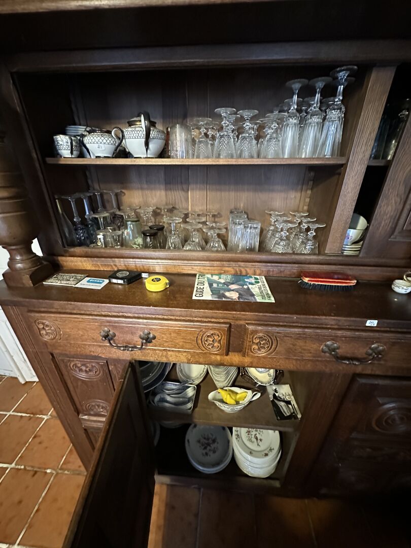 DANS LA SALLE A MANGER Fort lot de vaisselle en faïence et porcelaine, verrerie et cristal, dont LIMOGES, SARREGUEMINES (le tout contenu dans le buffet et le vaisselier).
