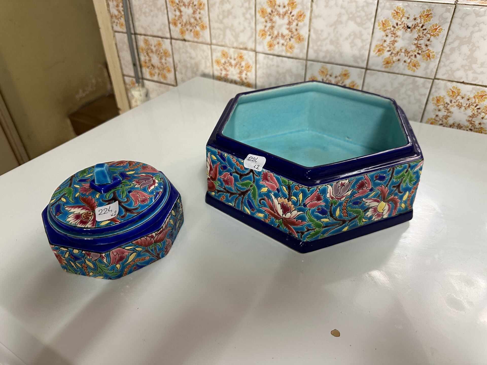 EMAUX DE LONGWY Réunion de deux boîtes en faïence émaillée polychrome à décor de fleurs (manque un couvercle). Décor 5685.