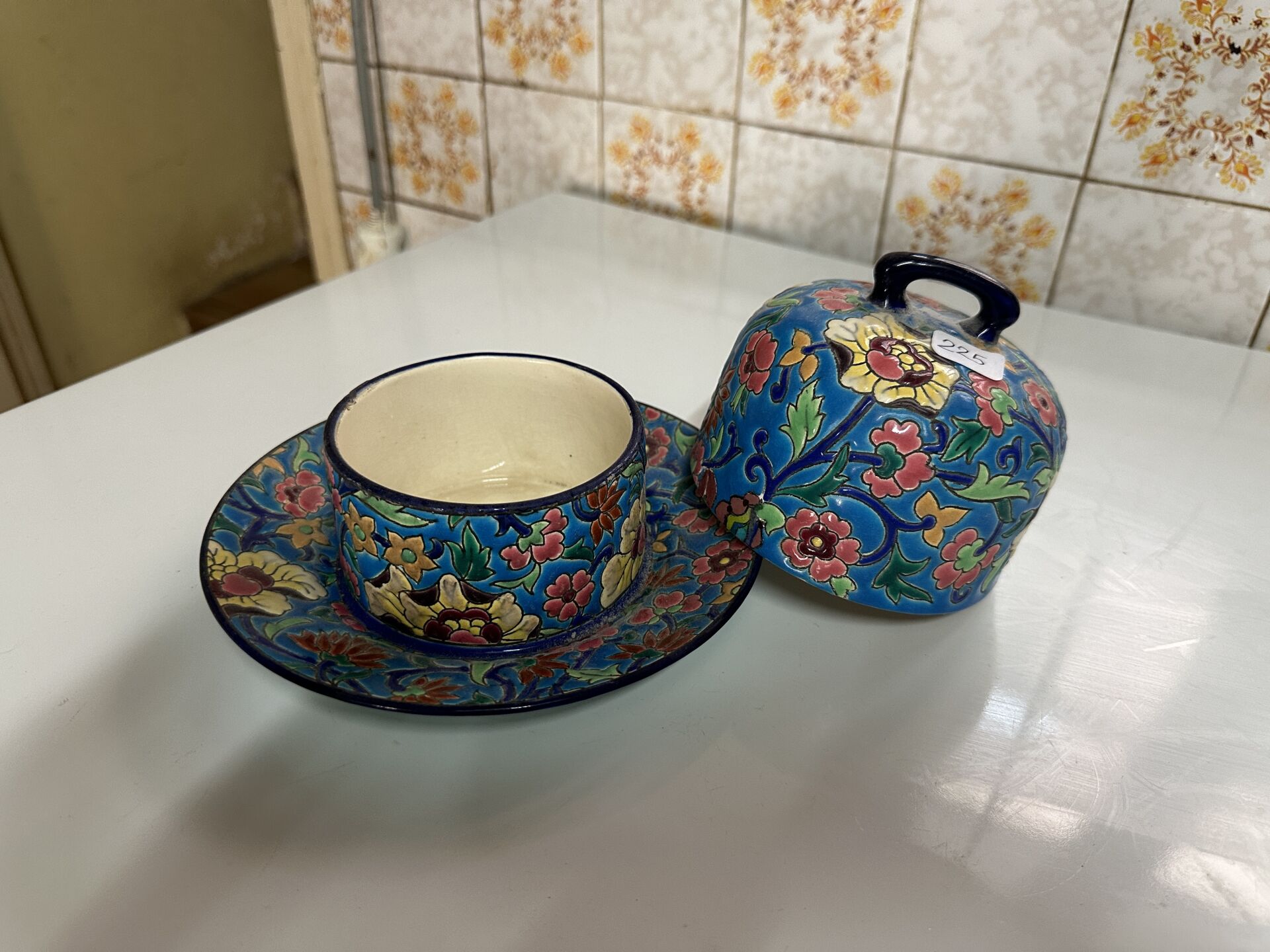 EMAUX DE LONGWY Beurrier en faïence émaillée polychrome à décor de fleurs.