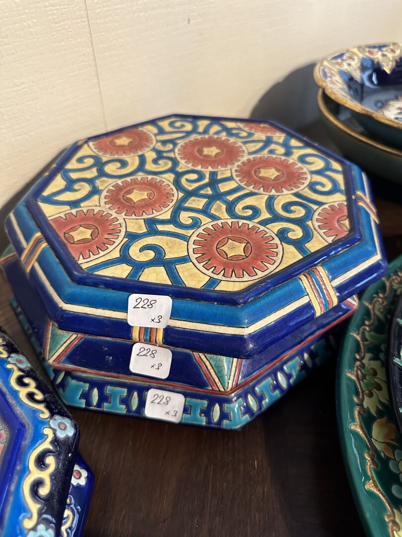 EMAUX DE LONGWY Réunion de trois dessous de plats octogonaux en faïence émaillée polychrome à décor de fleurs. Décor 5396, 5251 et 5684.