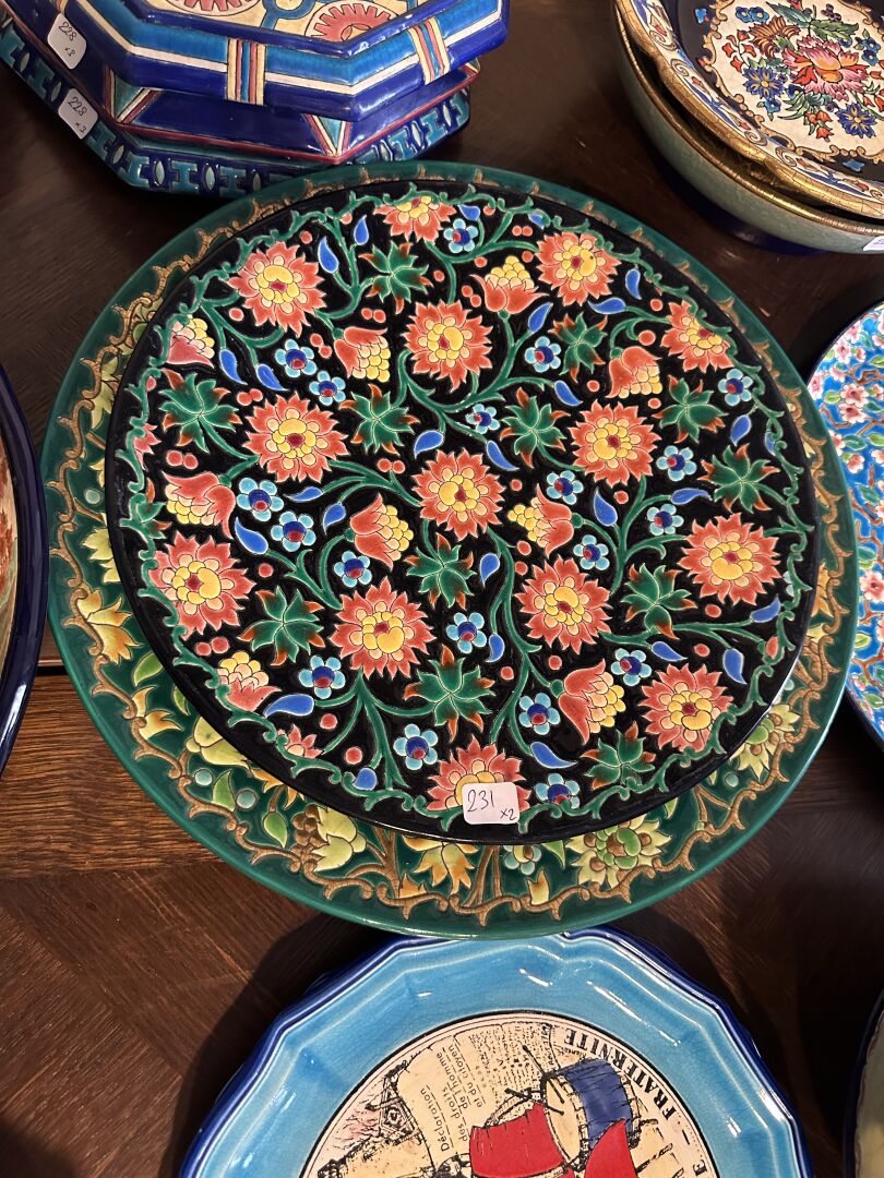 EMAUX DE LONGWY Réunion de deux grands plats ronds en faïence émaillée polychrome à décor de fleurs sur fond vert et sur fond noir. Décor 5670
