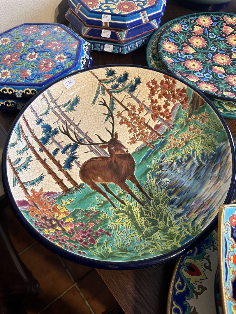EMAUX DE LONGWY Grand plat rond creux en faïence émaillée polychrome à décor d'un cerf dans la forêt. Décor Cerf, forme 1252.