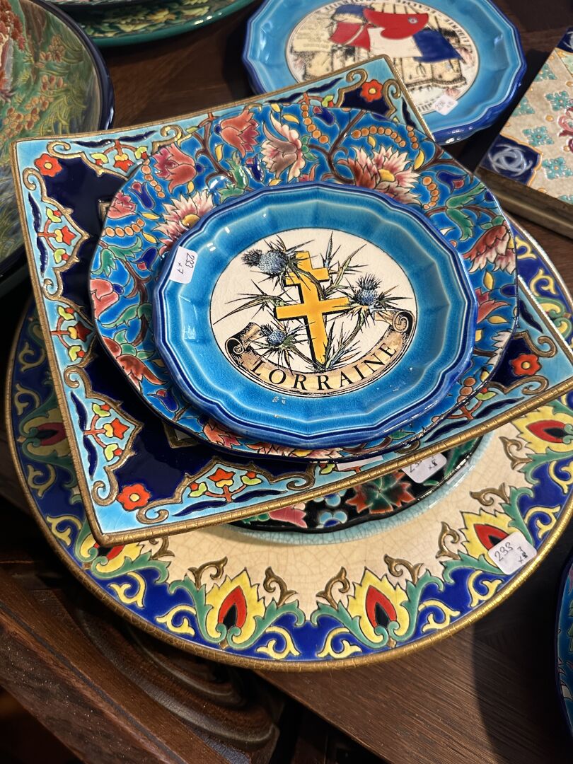 EMAUX DE LONGWY Réunion de sept assiettes et plats en faïence émaillée polychrome à décor de fleurs villes et régions.