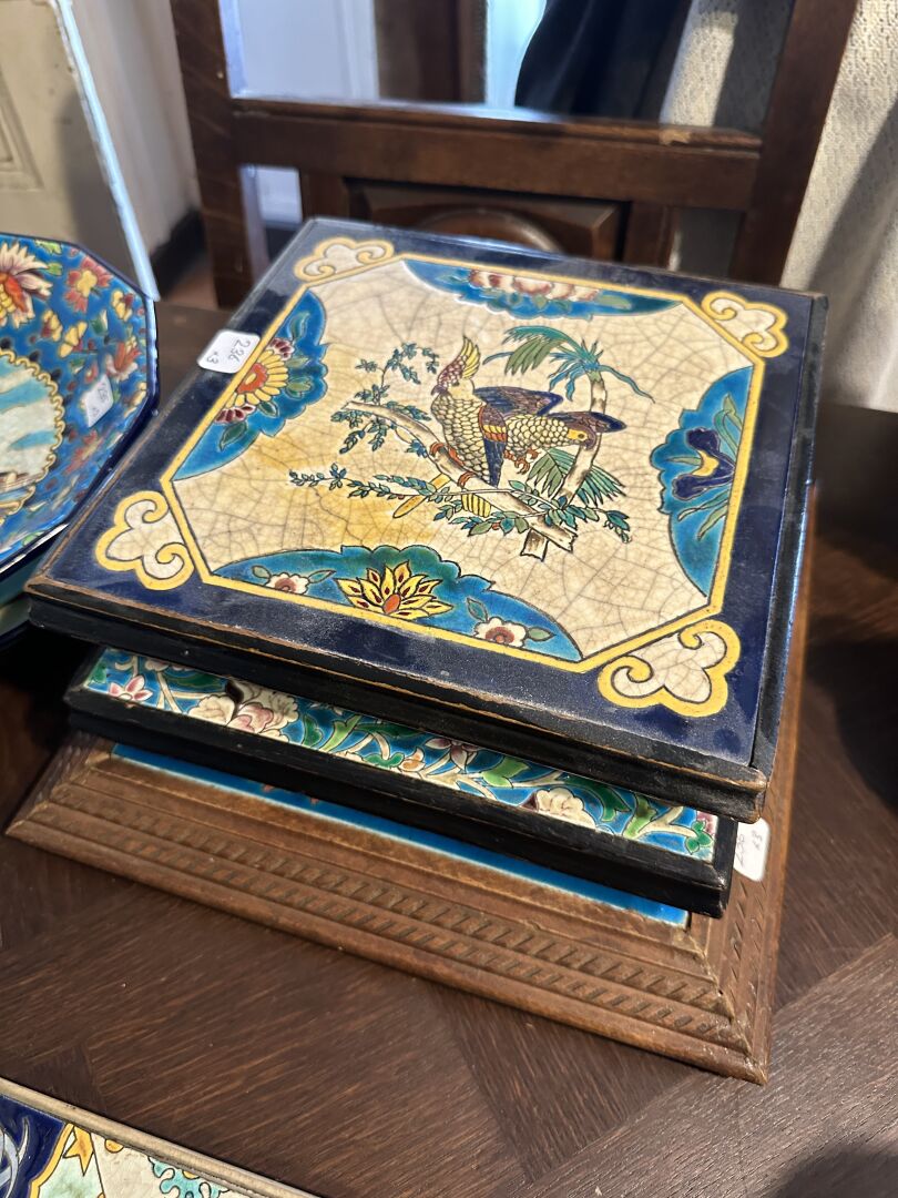 EMAUX DE LONGWY Réunion de trois dessous de plats en faïence émaillée polychrome à décor de fleurs, oiseaux branchés. Montures en bois.