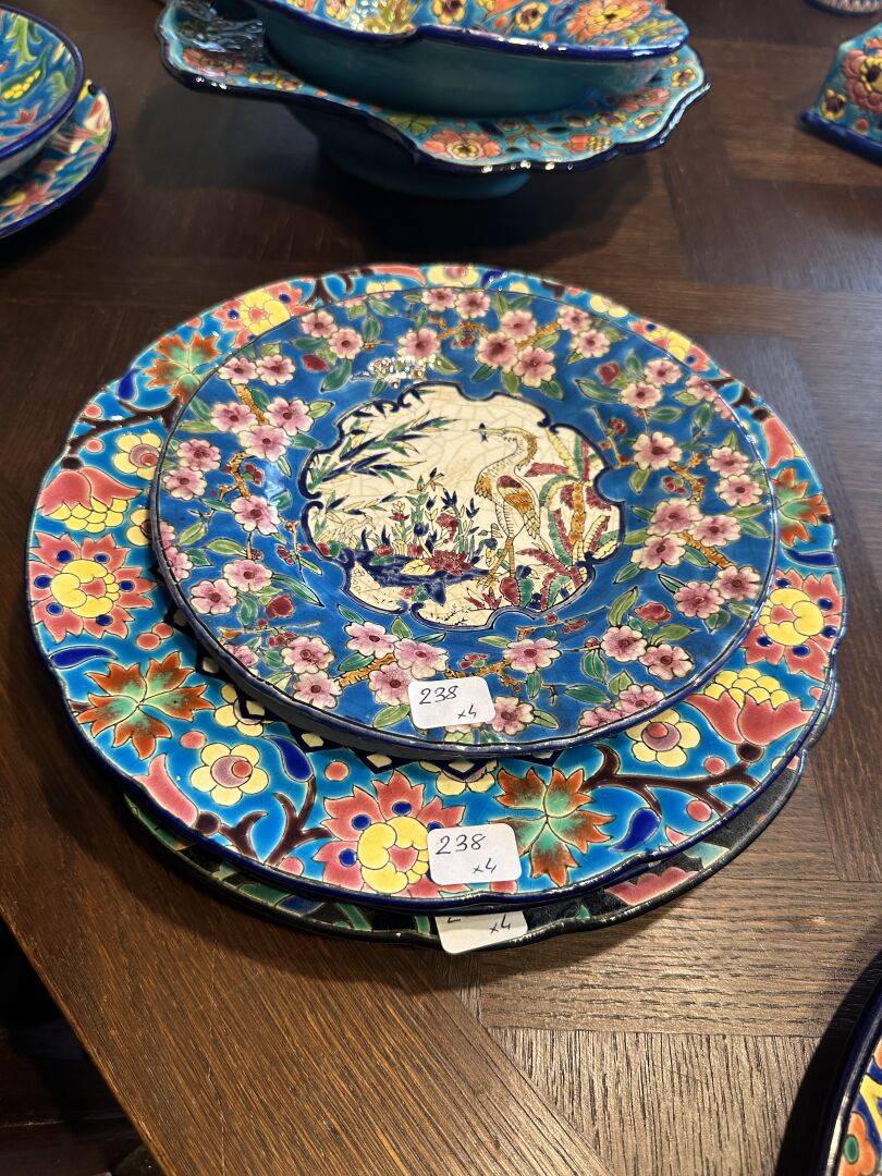 EMAUX DE LONGWY Réunion de quatre assiettes en faïence émaillée polychrome à décor d'animaux et fleurs.