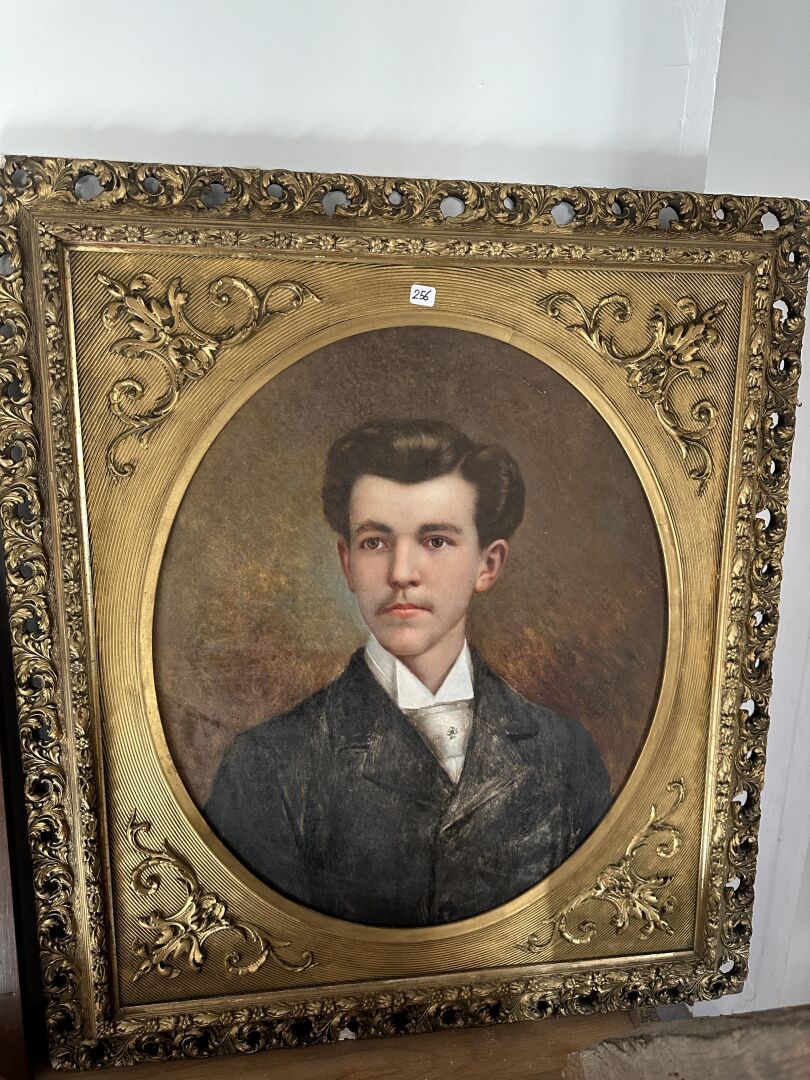 AU GRENIER Portrait d'un jeune homme. Huile sur toile.