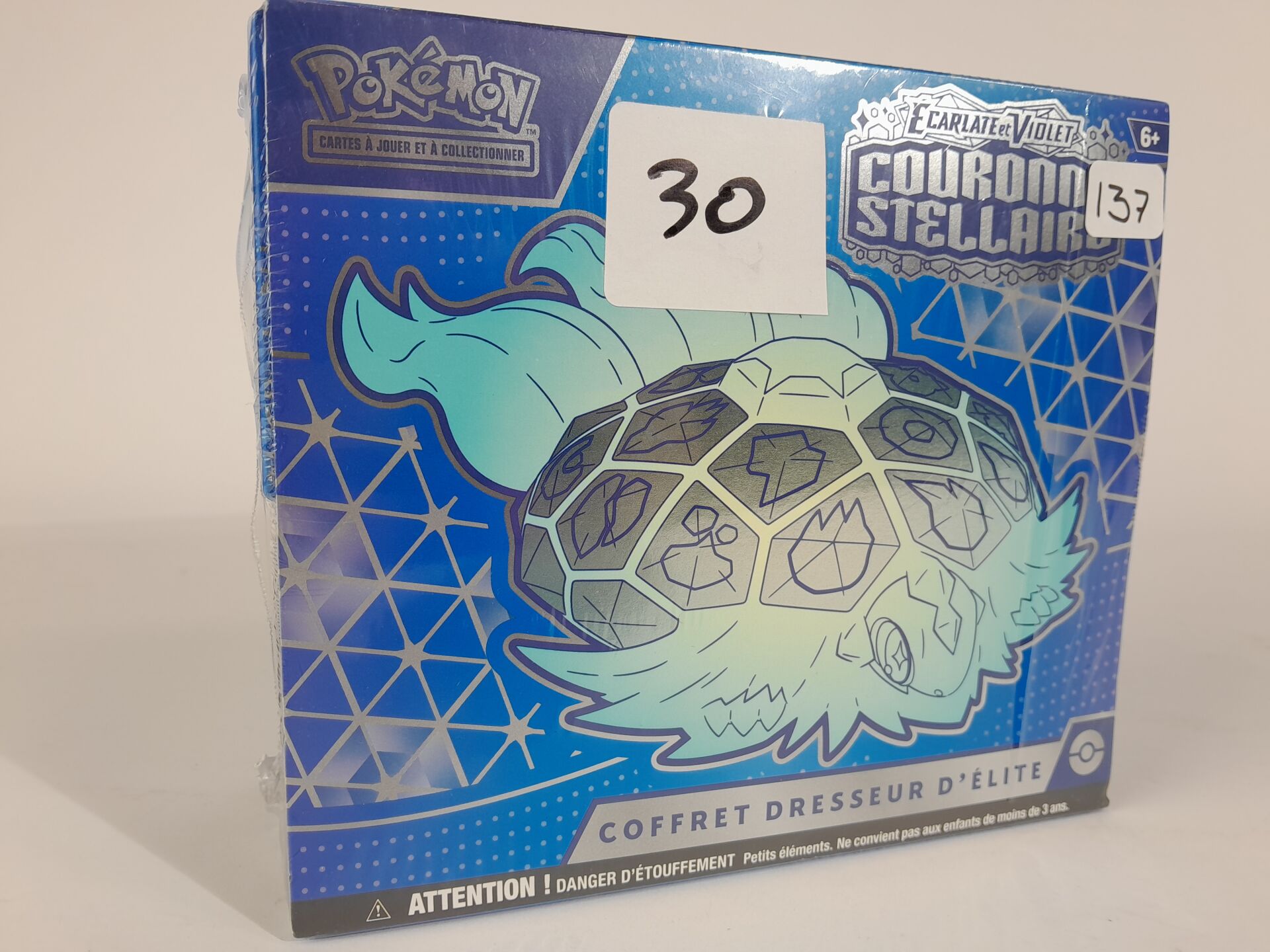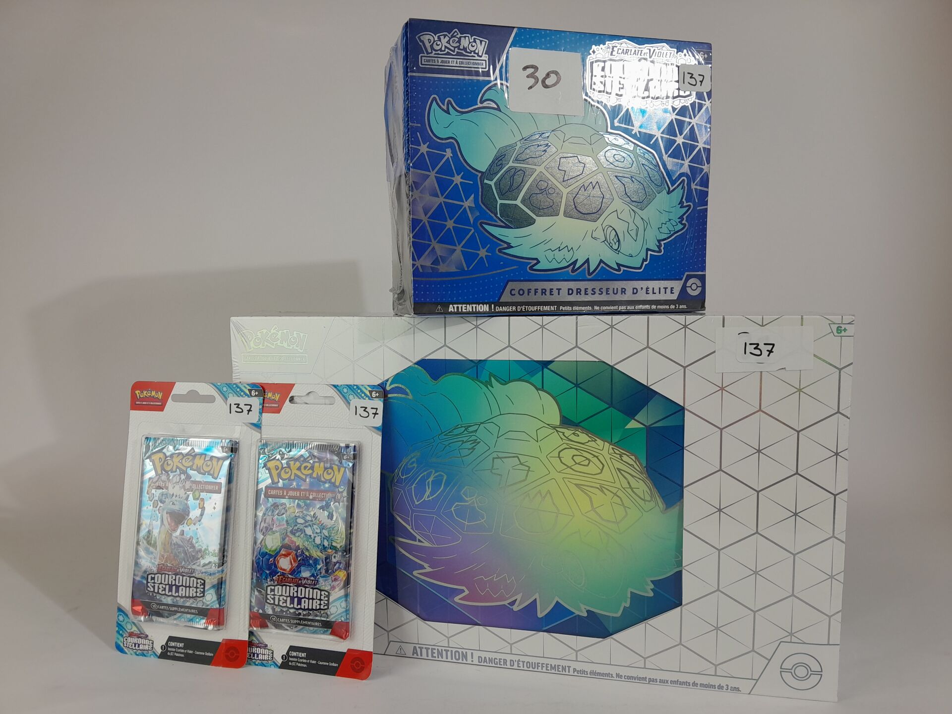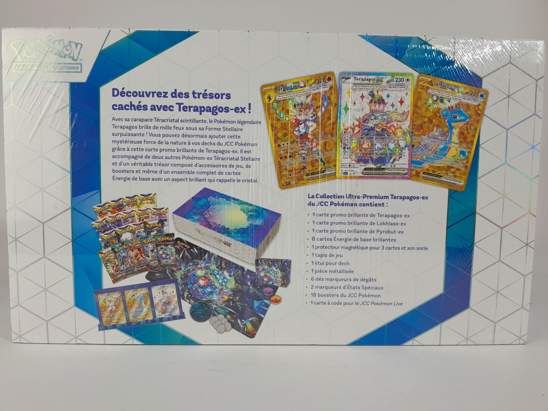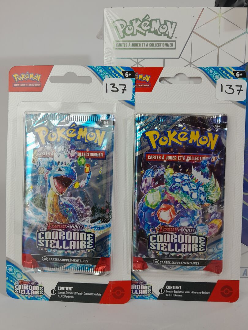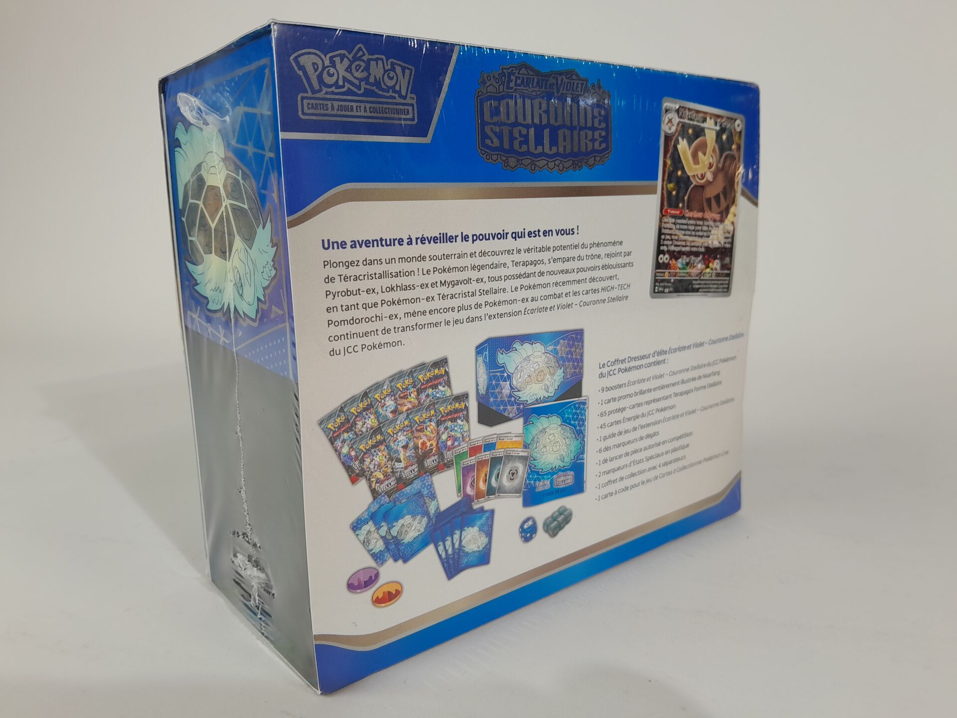 POKEMON - Lot version français comprenant : -1 coffret scellé Ultra Premium scellé "TERAPAGOS EX" -1 coffret Dresseur d'Elite "COURONNE STELLAIRE" -2 boosters "COURONNE STELLAIRE"