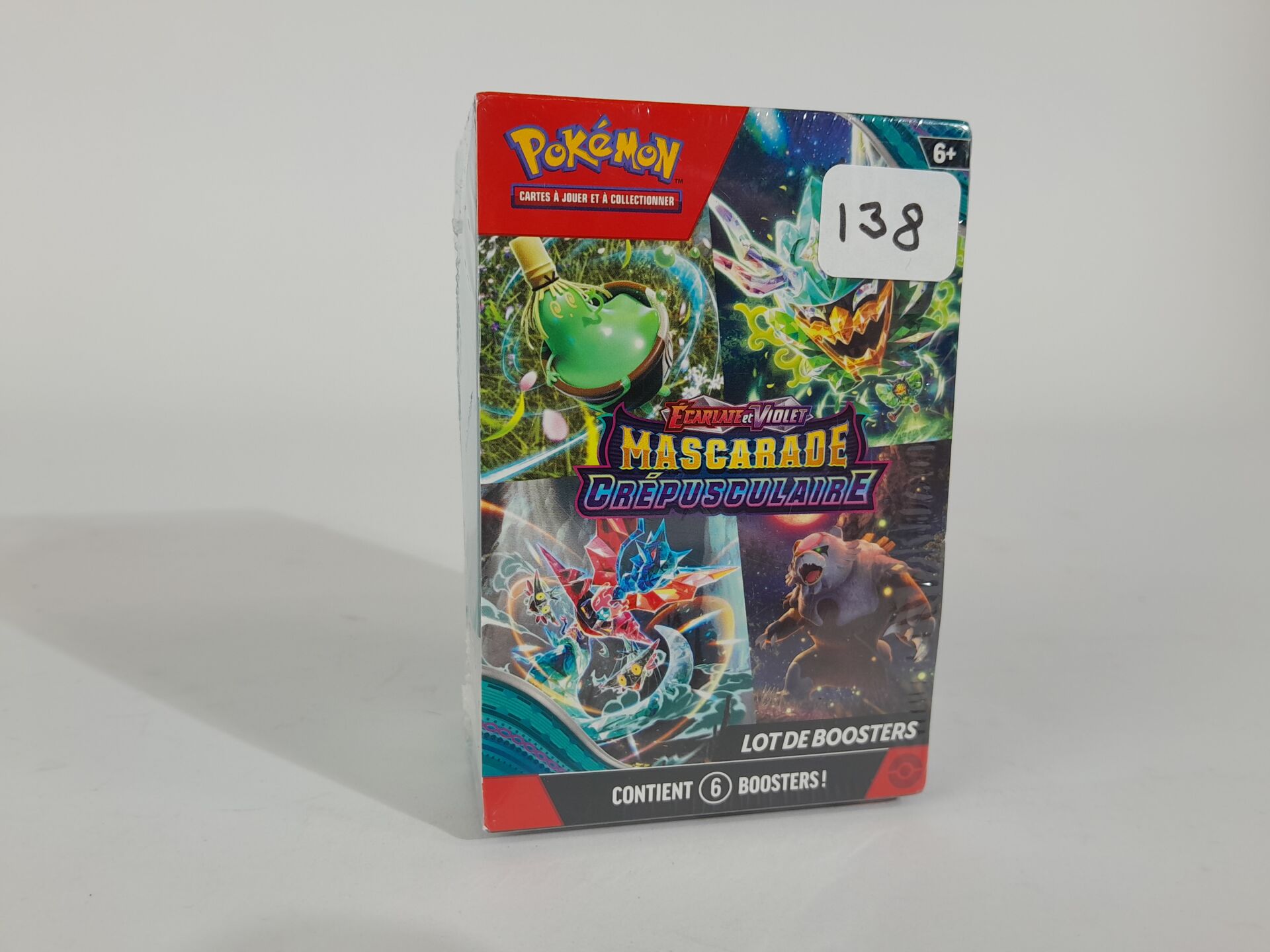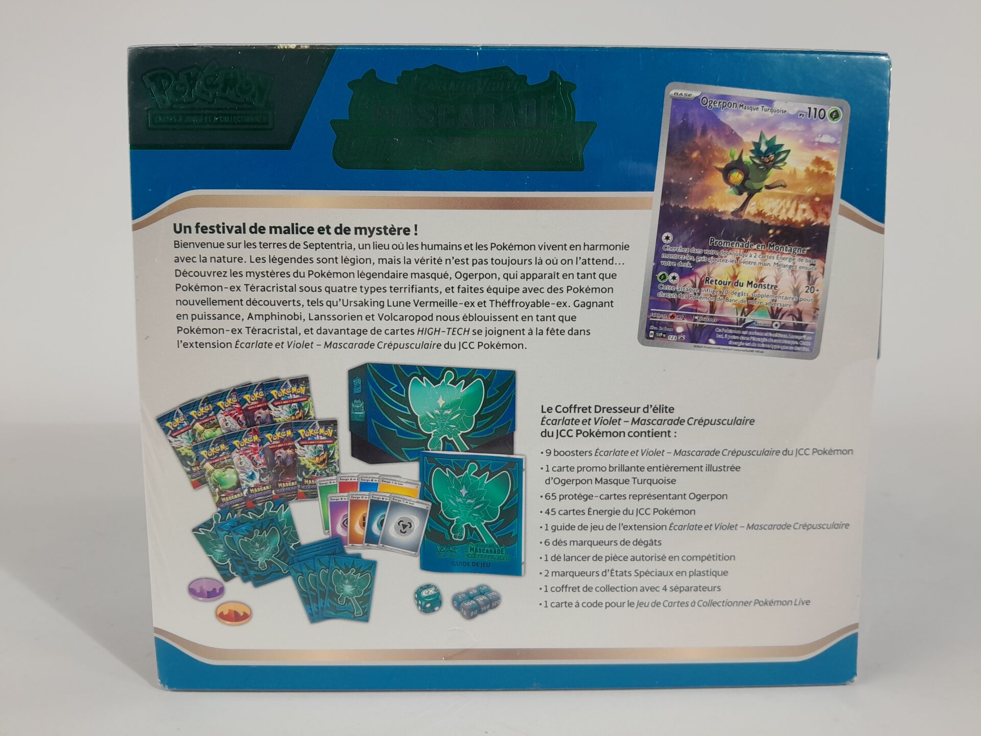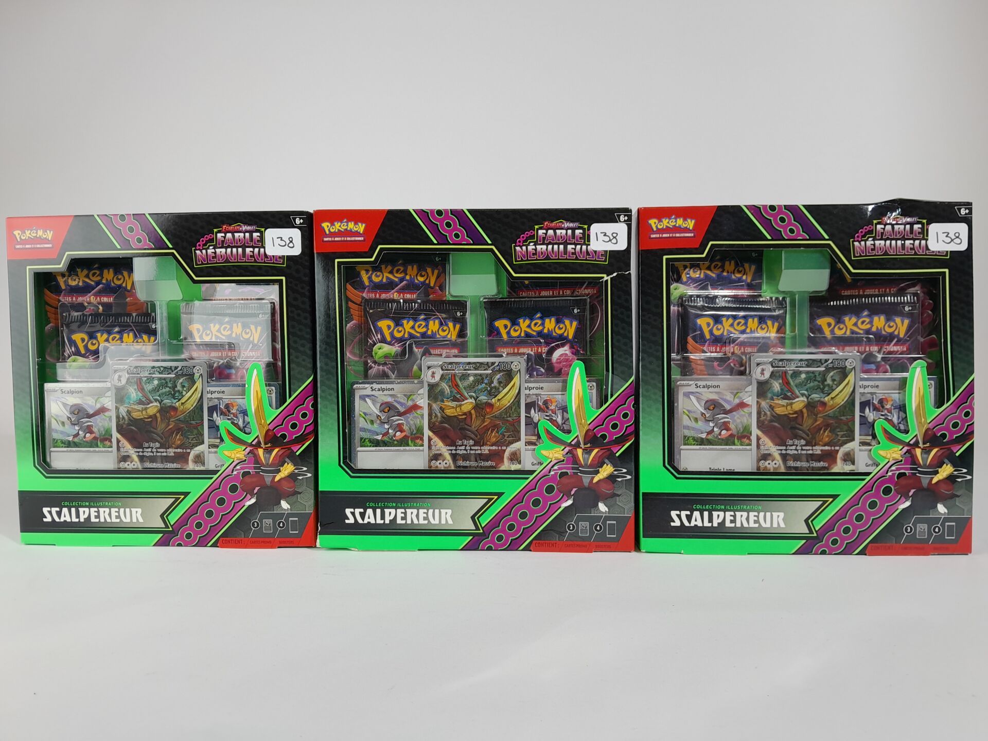 POKEMON - Lot version français comprenant : -3 coffrets scellés Collection illustration "SCALPEREUR" -1 coffret scellé Dresseur d'Elite "MASCARADE CREPUSCULAIRE" -1 bundle scellée de 6 boosters "MASACARADE CREPUSCULAIRE" -1 pack scellé de 3 boosters "FABLE NEBULEUSE"