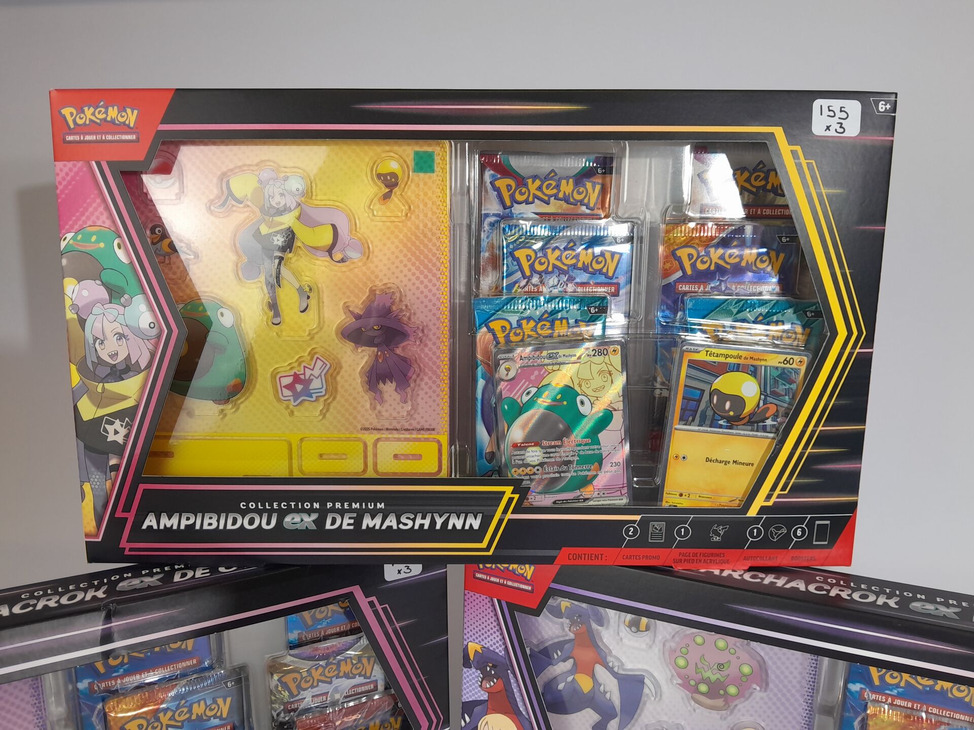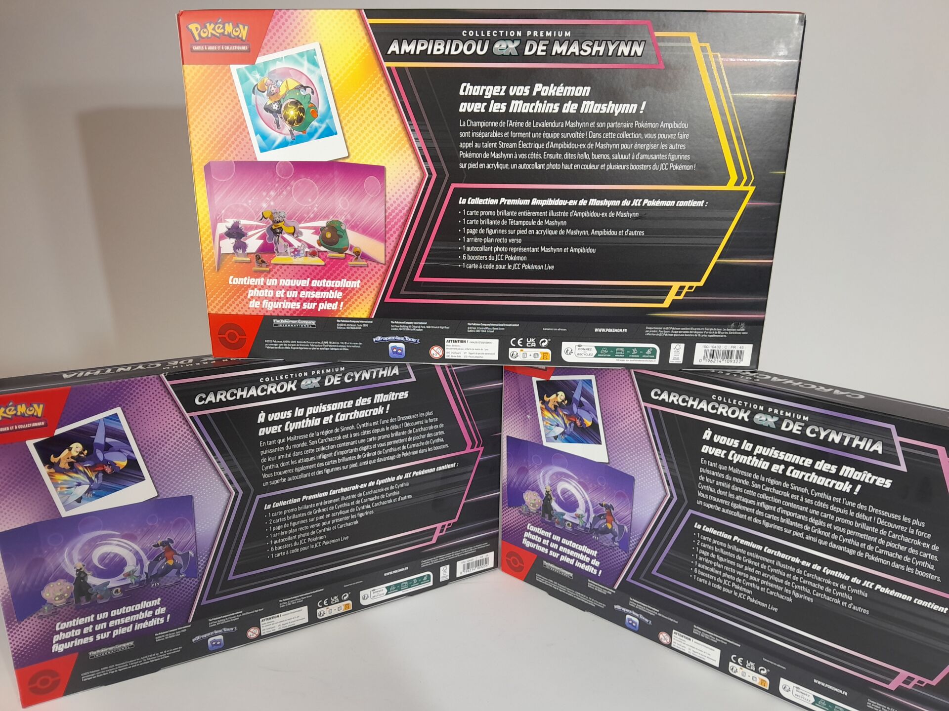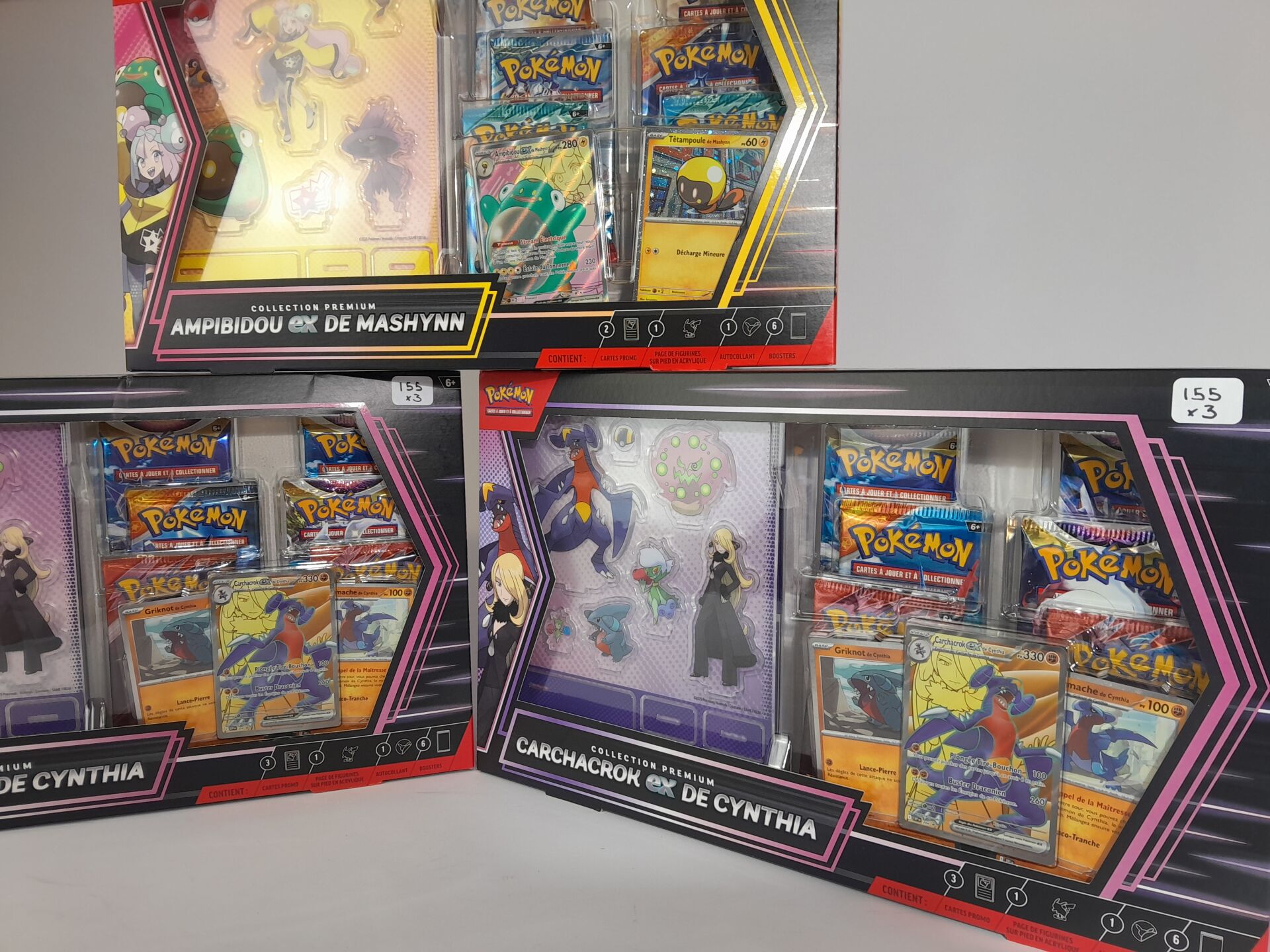 POKEMON - Lot version français de 2 coffrets scellés Collection Premium "CARCHACROK EX DE CYNTHIA" + 1 coffret scellé "AMPIBIDOU EX DE MASHYNN"