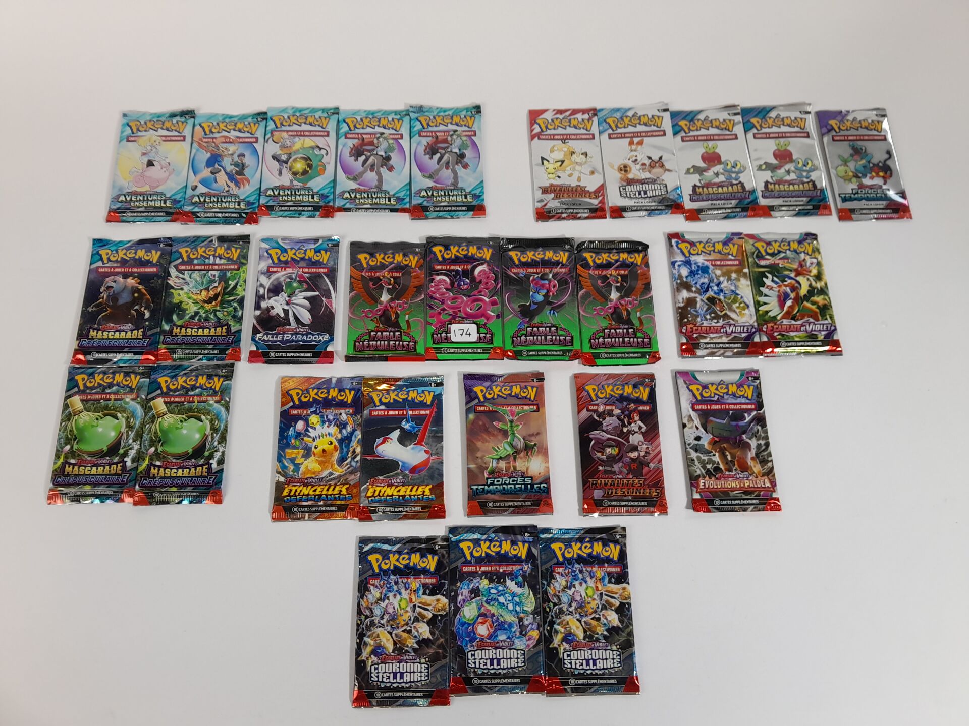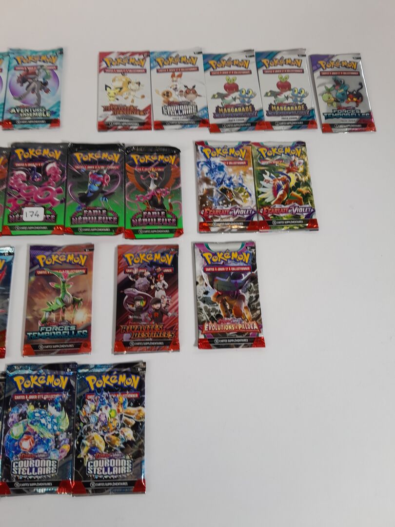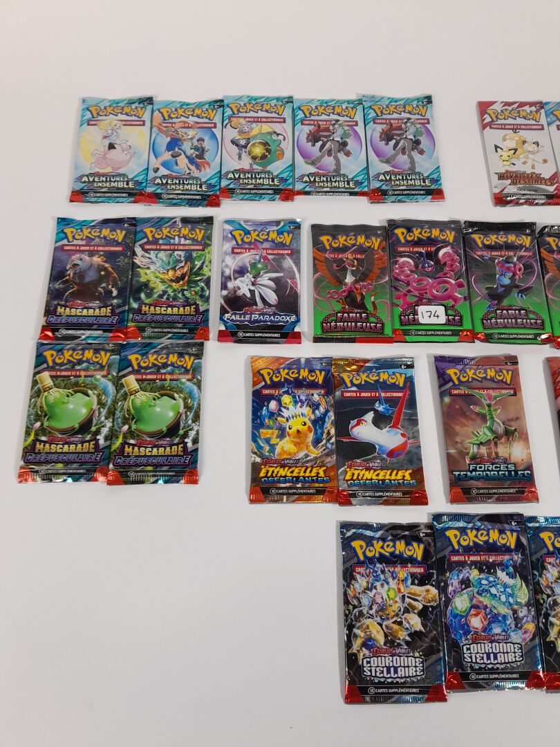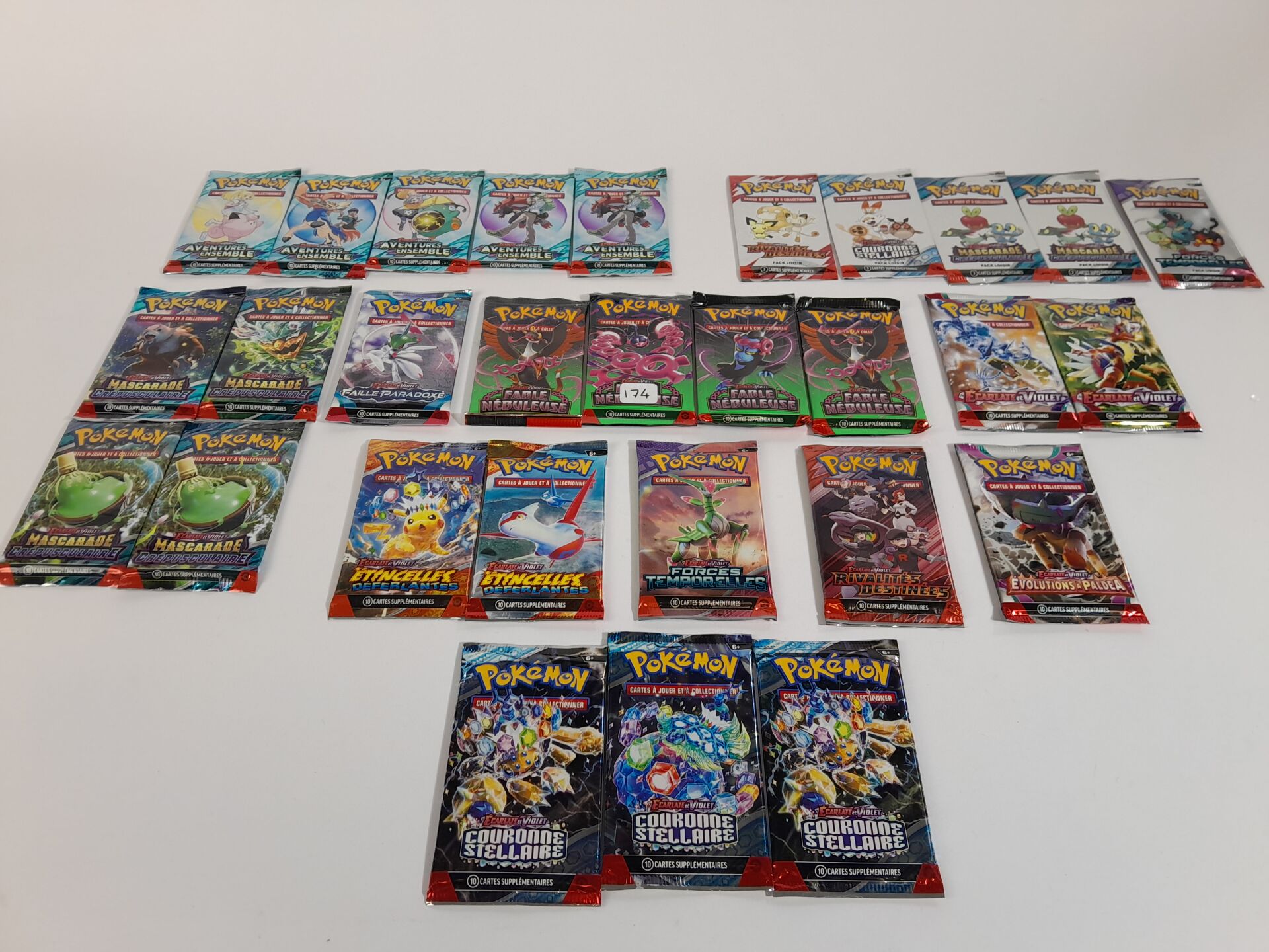 POKEMON - Lot version français de 24 boosters + 5 packs loisirs, éditions variées dont "FABLE NEBULEUSE", "AVENTURES ENSEMBLE", "COURONNE STELLAIRE"