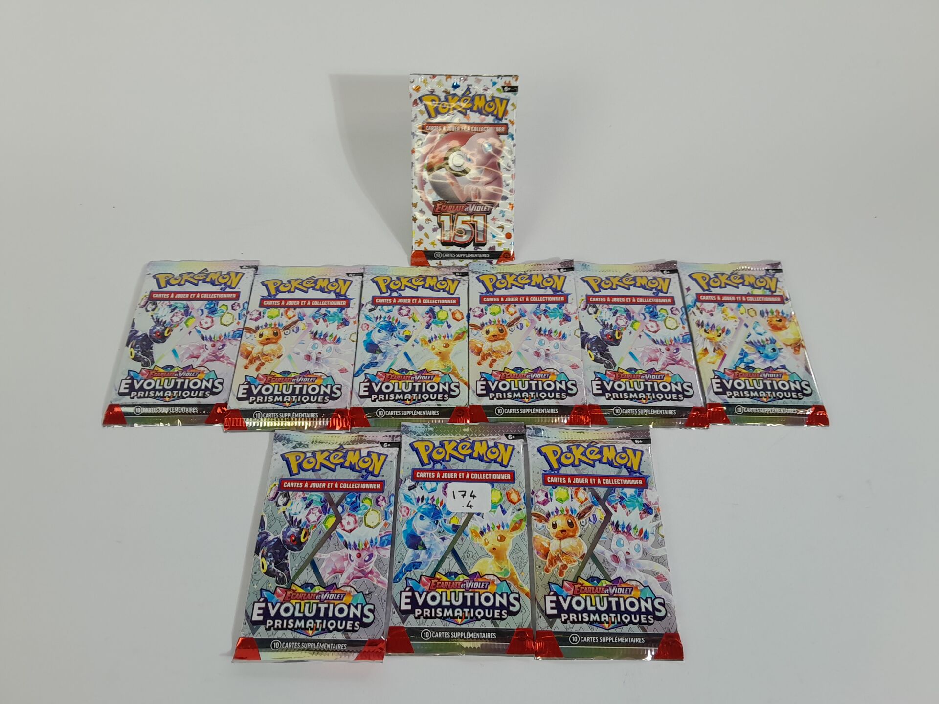 POKEMON - Lot de 10 boosters versions français comprenant : -9 boosters "EVOLUTIONS PRISMATIQUES" -1 booster "151"