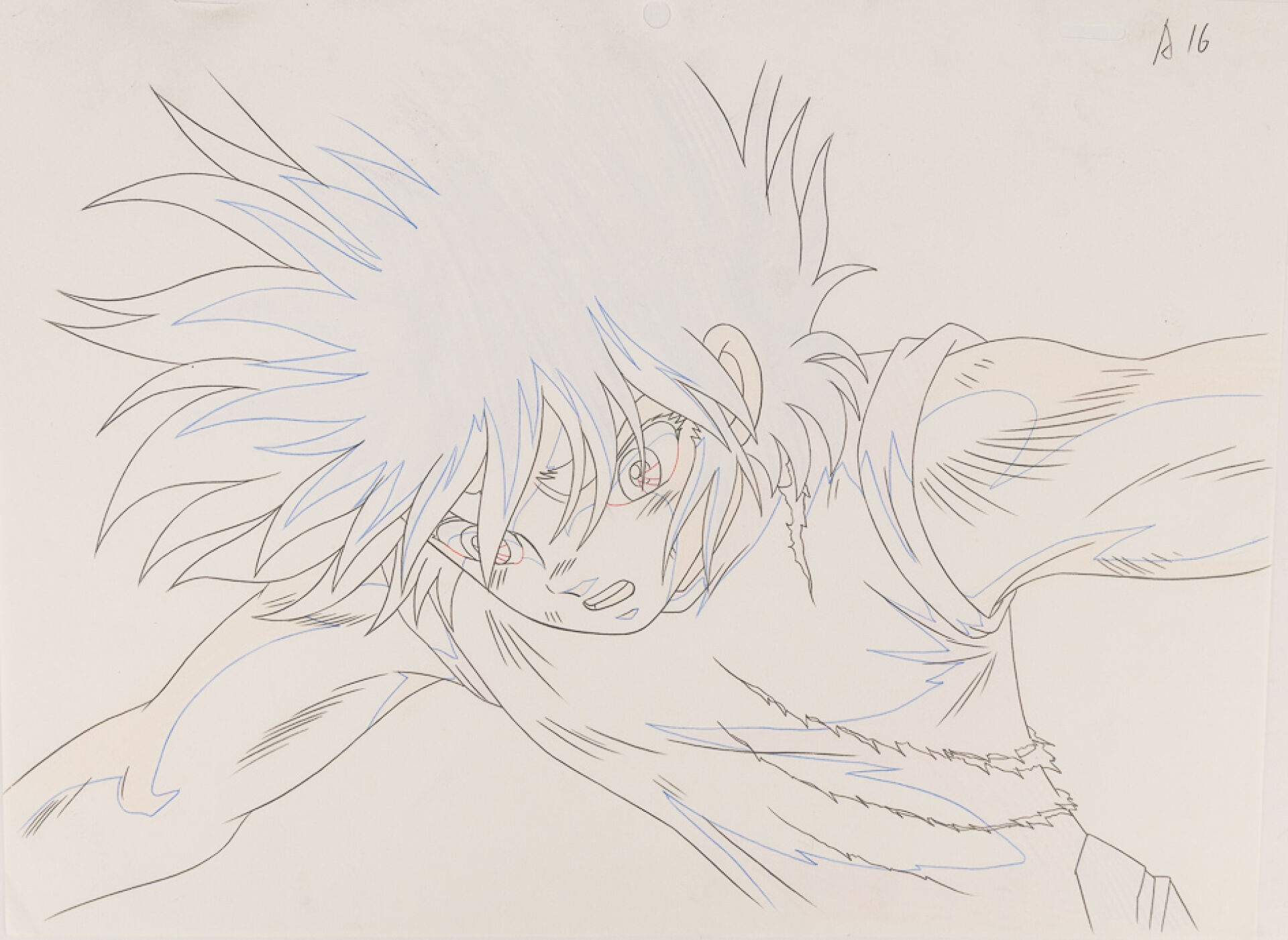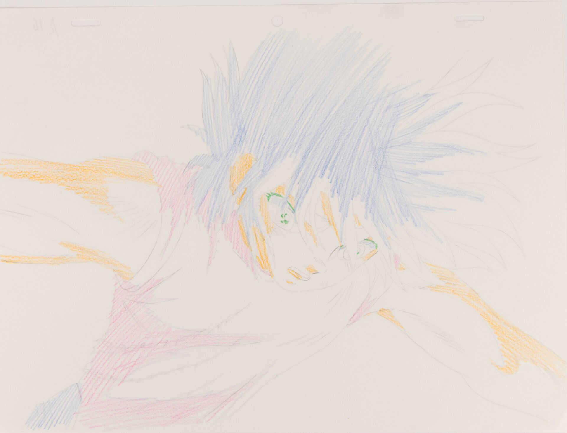 Masami Kurumada (車田・正美) et Shingo Araki (荒木 伸吾) - Les Chevaliers du Zodiaque ou Saint Seiya (聖闘士星矢) - Seiya (星矢 ou Seiya, littéralement « flèche étoilée ») : Dôga (Douga) original à la mine de plomb et aux crayons de couleur représentant le célèbre personnage de Seiya, chevalier de bronze de Pégase blessé, en contre-plongée. Tiré du Film 5 Chapitre du monde céleste : Ouverture Tenkai-hen joso : Overture 聖闘士星矢 天界編 序奏. Haut. : 22,5 cm - Larg. : 30 cm Produit par studio Toei Animation, Shingo Araki , 2004. (Expédition sur devis)