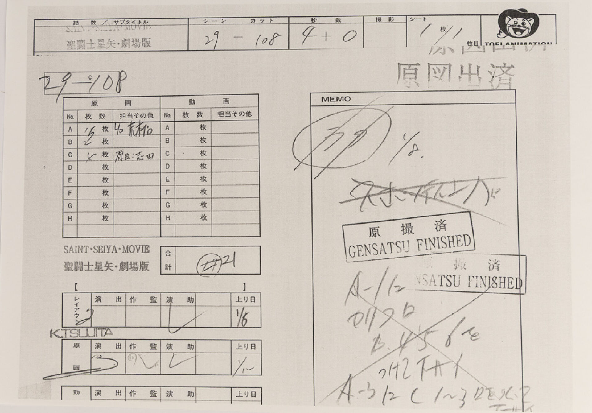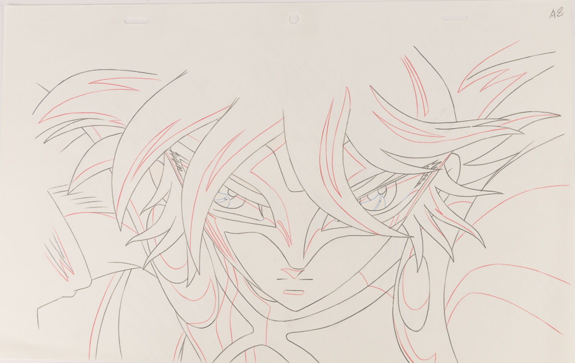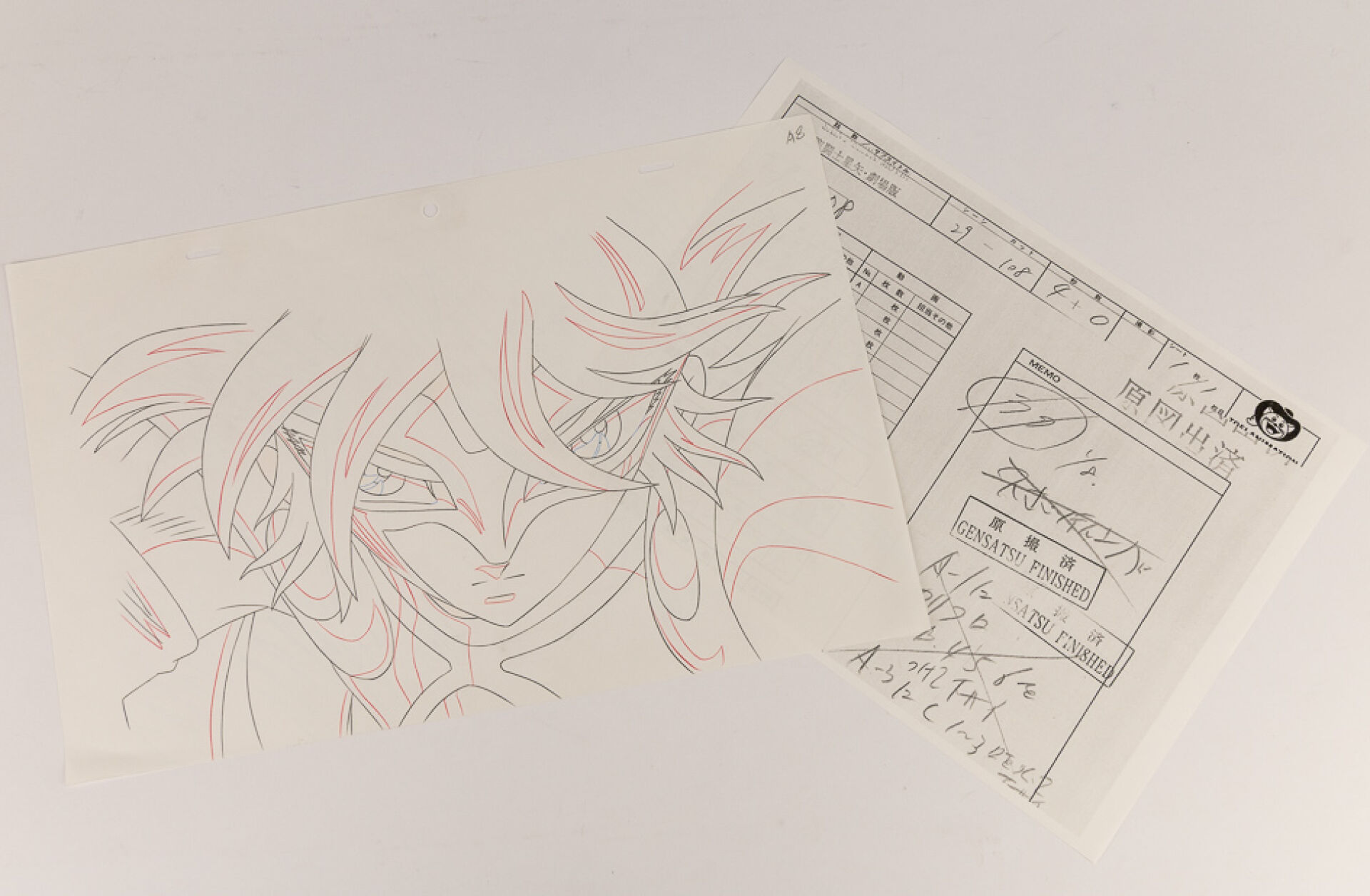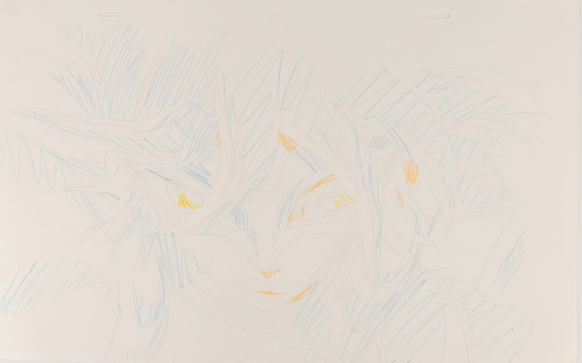 Masami Kurumada (車田・正美) et Shingo Araki (荒木 伸吾) - Les Chevaliers du Zodiaque ou Saint Seiya (聖闘士星矢) Pan Dôga (Douga) close-up original à la mine de plomb et aux crayons de couleur représentant le personnage de Tôma ( 斗馬), aussi appelé par son pseudonyme d'ange « Ikaros ! Tiré du Film 5 Tenkai-hen joso : Ouverture 聖闘士星矢 天界編 序奏 Haut. : 23 cm - Larg. : 36,2 cm On joint une copie du time-sheet Produit par studio Toei Animation, Shingo Araki , 2004 (Expédition sur devis)