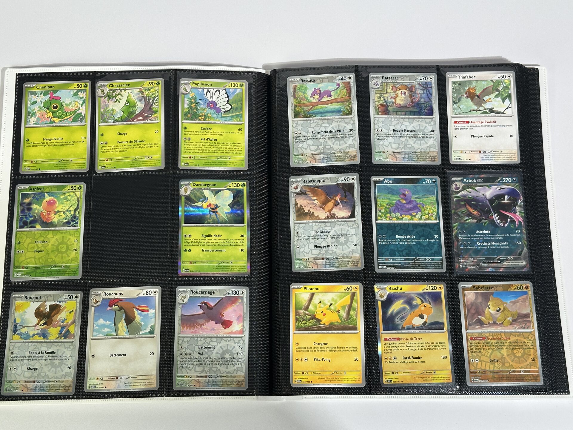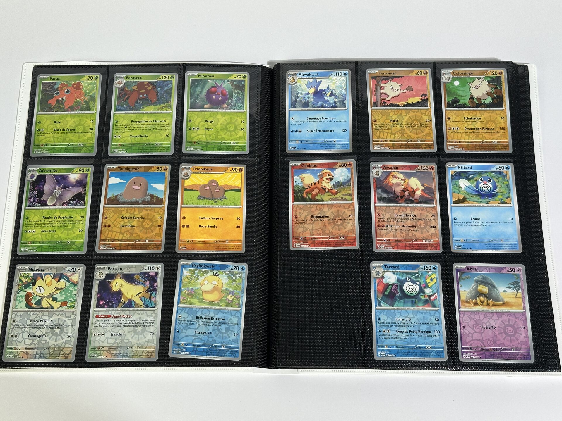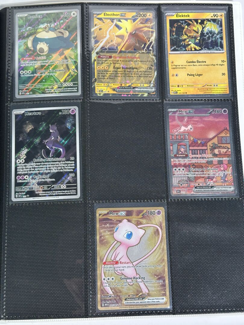 POKEMON - Un classeur contenant environ 170 cartes de l'édition 151 et promotionnelles en français, état EX/NM + dont : - Carte métallique Mew Gold en anglais - Mew ex Promo état NM - Mewtwo ex Promo état NM - Tortank ex Full Art état Ex+ - Florizarre ex Full Art état Ex+ - Psykokwak Alternate Art état Ex+ - Bulbizarre Alternate Art état NM