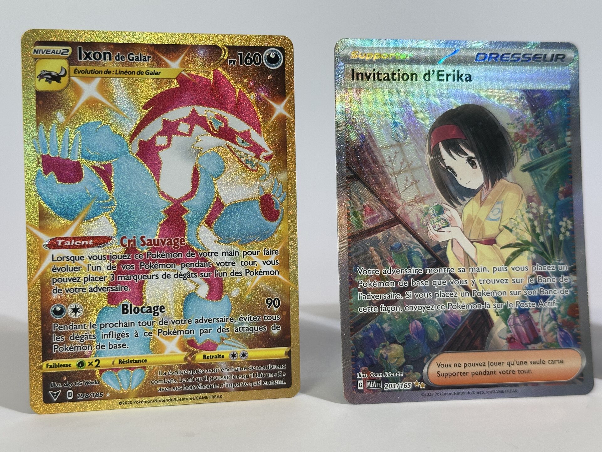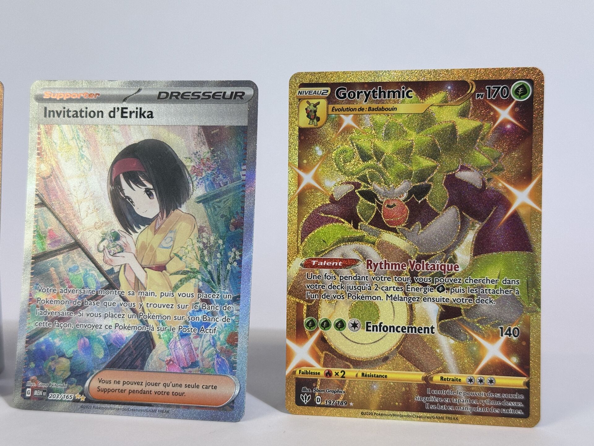 POKEMON - Lot de 3 cartes recherchées en français : Invitation d'Erika Akternate art, état EX de l'édition 151 Gorythmic gold de l'édition Clash des Rebelles état EX+ Ixon de Galar gold de l'édition Voltage Eclatant état EX+"