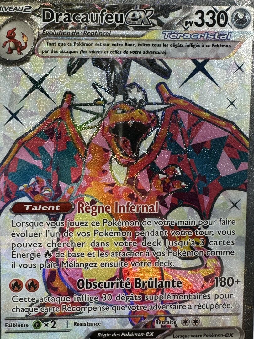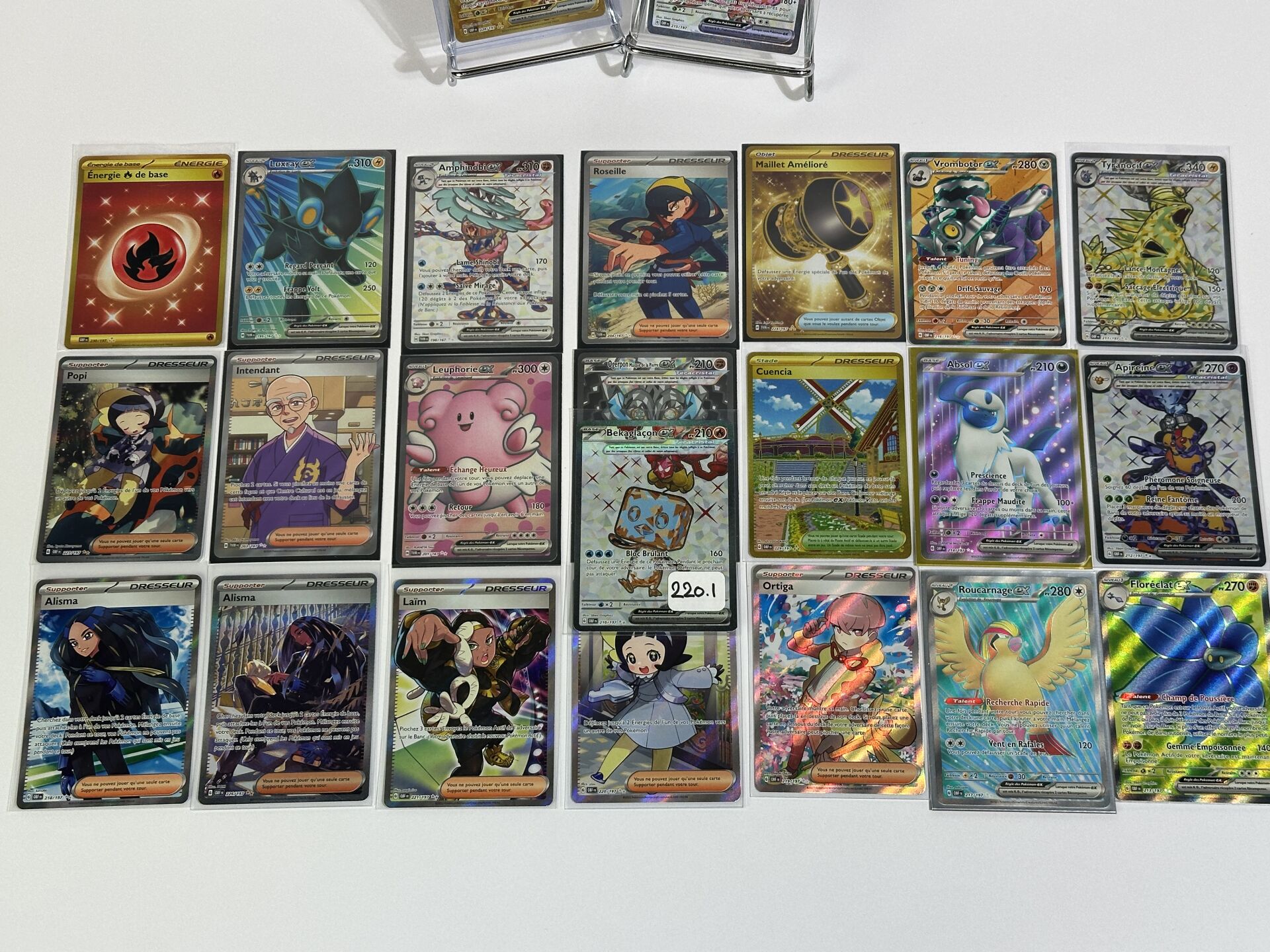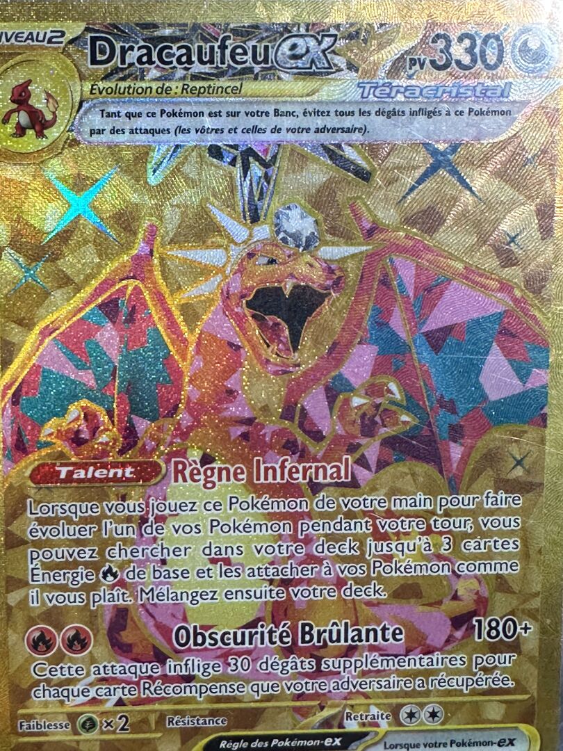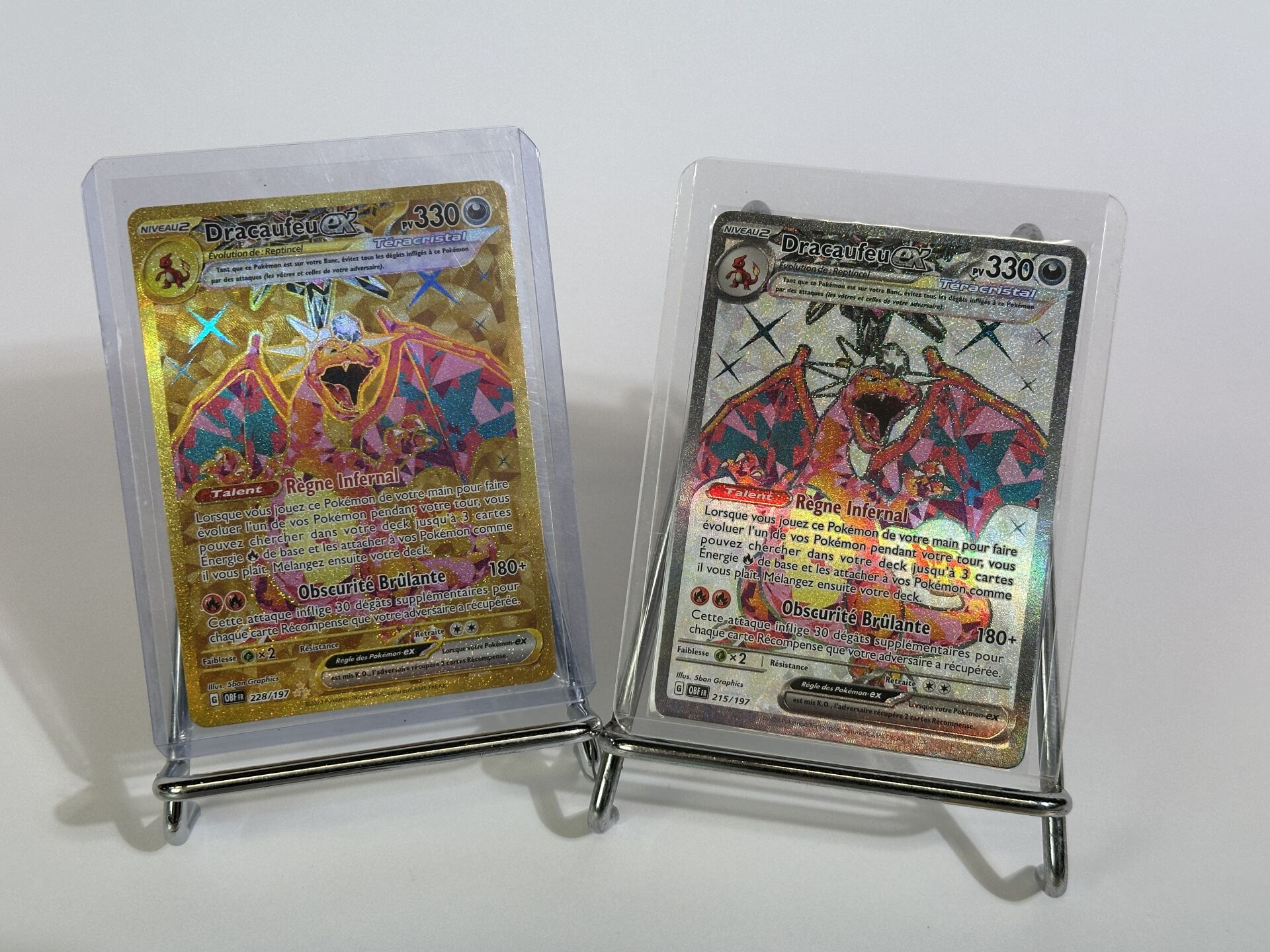 POKEMON - Lot de 24 cartes Full Art, Alternate Art et Gold, état Ex/NM en français. Les cartes proviennent des éditions Flammes Obsidiennes et Mascarade Crépusculaire. Le lot contient notament : - Dracaufeu ex Téracristal Gold - Dracaufeu ex Téracristal Full art