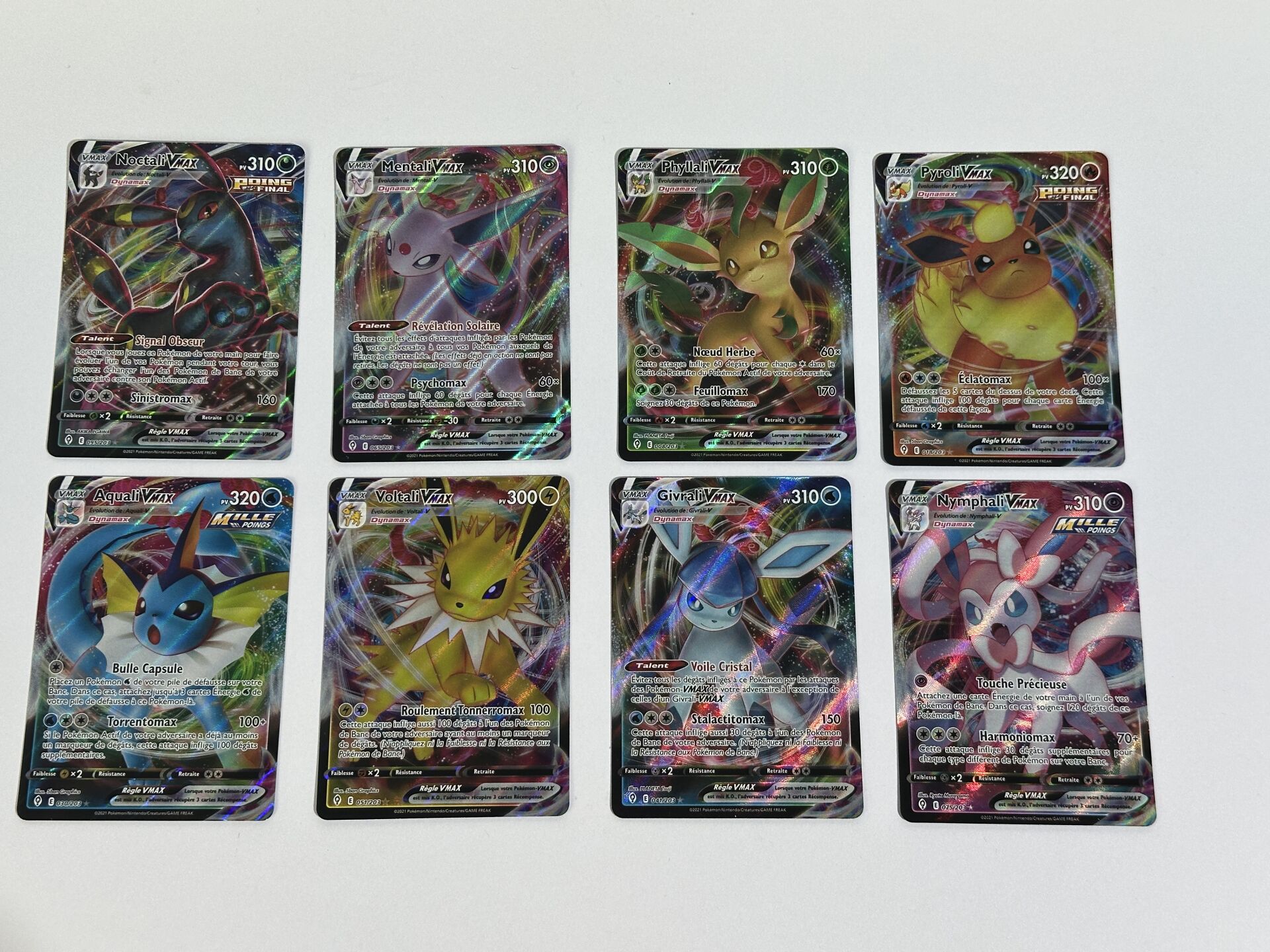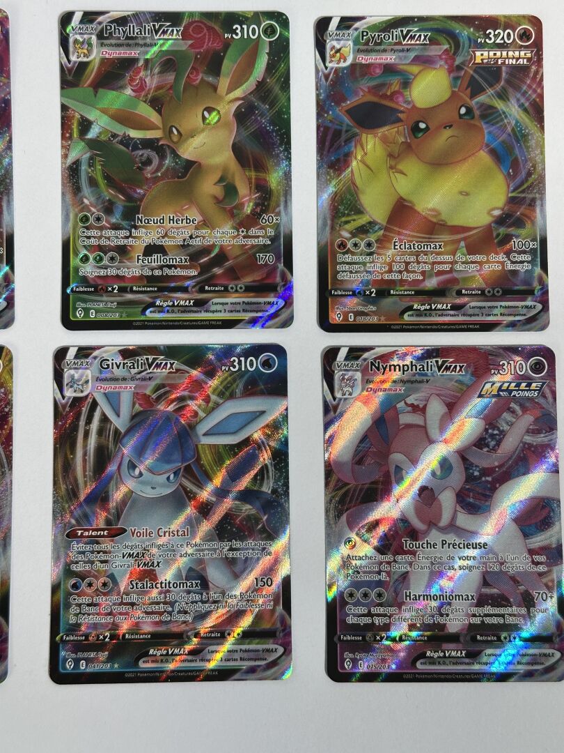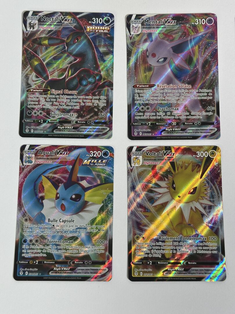 POKEMON - Lot de 8 cartes Évolutions d'Evoli VMAX de l'édition Évolutions Célestes, état EX+/NM, dont : - Noctali VMAX - Mentali VMAX