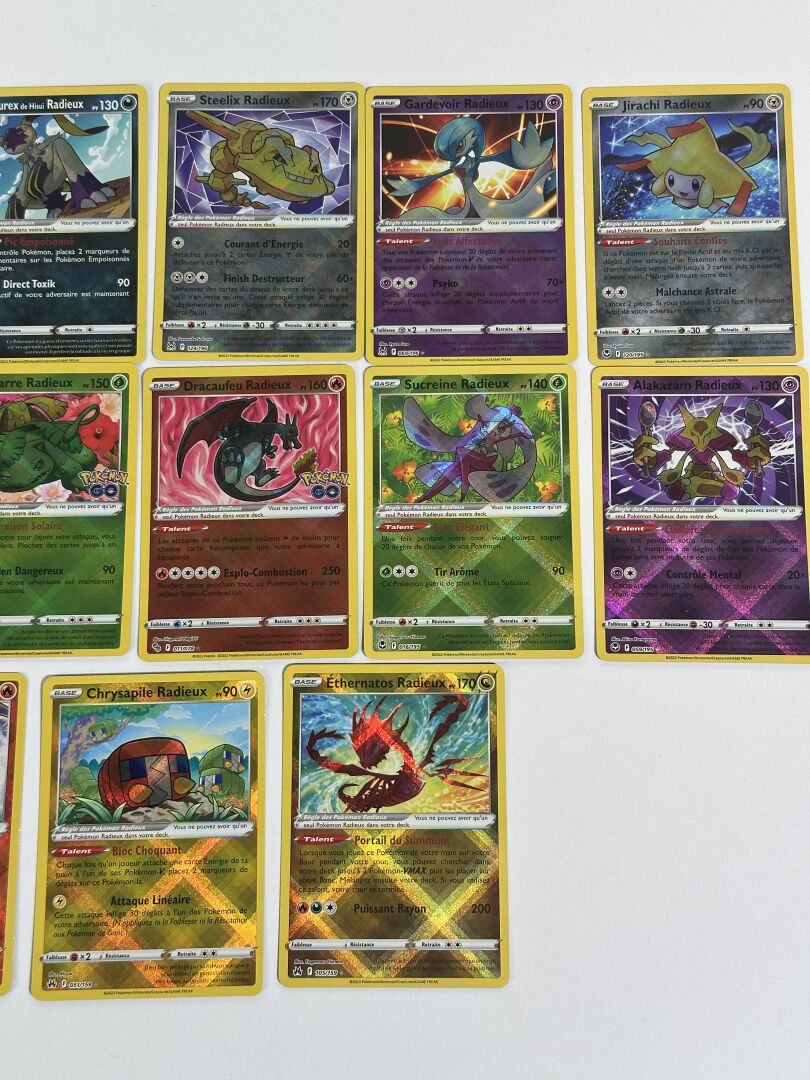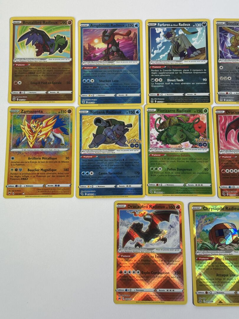 POKEMON - Lot de 14 cartes Pokémon Radieux état EX/NM, dont : - Dracaufeu Radieux - Tortank Radieux et Florizarre Radieux de l'édition Pokémon GO - Dracaufeu Radieux de l'édition Zénith Suprême On Joint une carte Zamazenta Amazing rare de l 'édition Voltage Eclatant