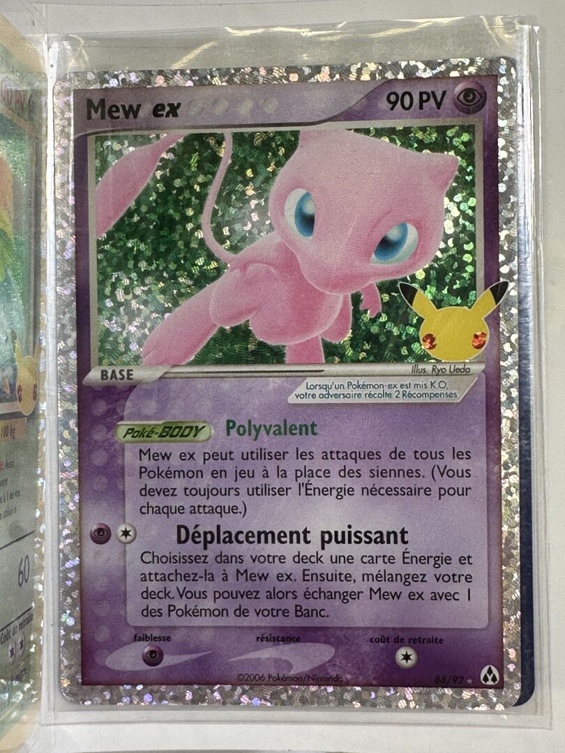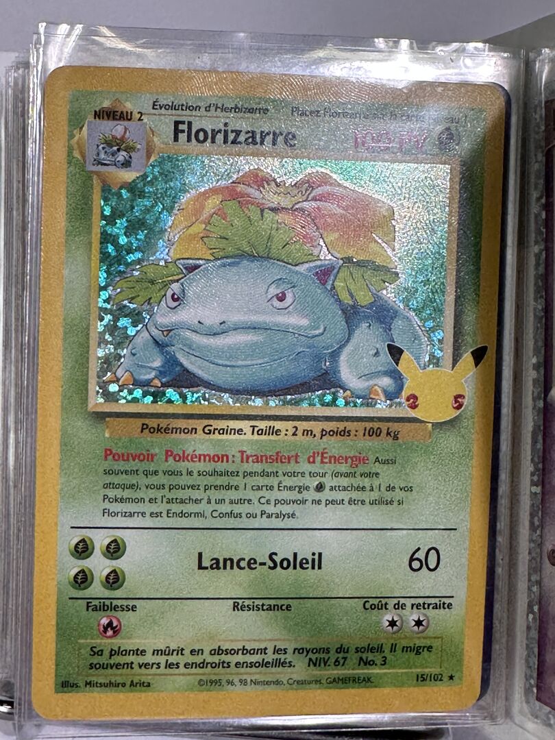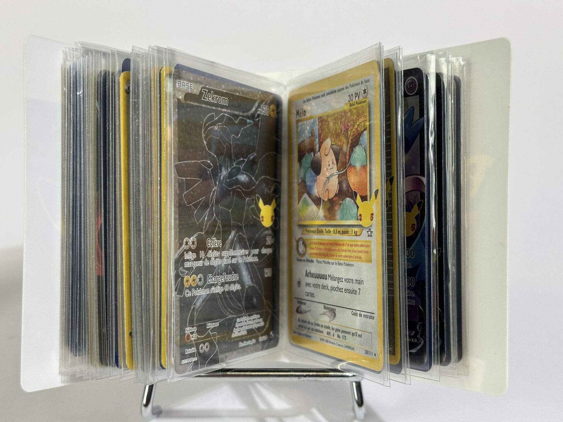 POKEMON - Petit classeur de cartes Célébrations 25ème anniversaire en français, état EX/NM. Le classeur contient des cartes de la série principale (de 1 à 24) et de nombreuses cartes promotionnelles avec le logo 25ème anniversaire, dont : - Amphinobi Gold Star - Zekrom Blanc et Noir - Florizarre Set de Base - Mew ex