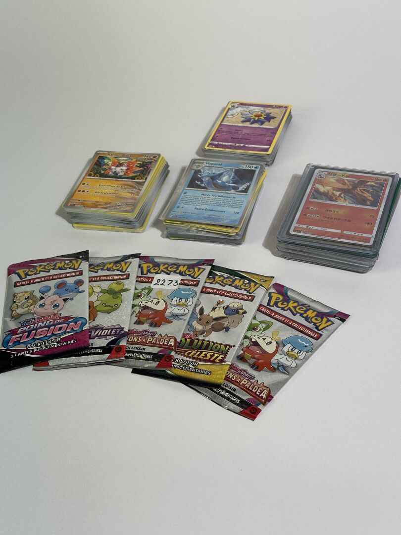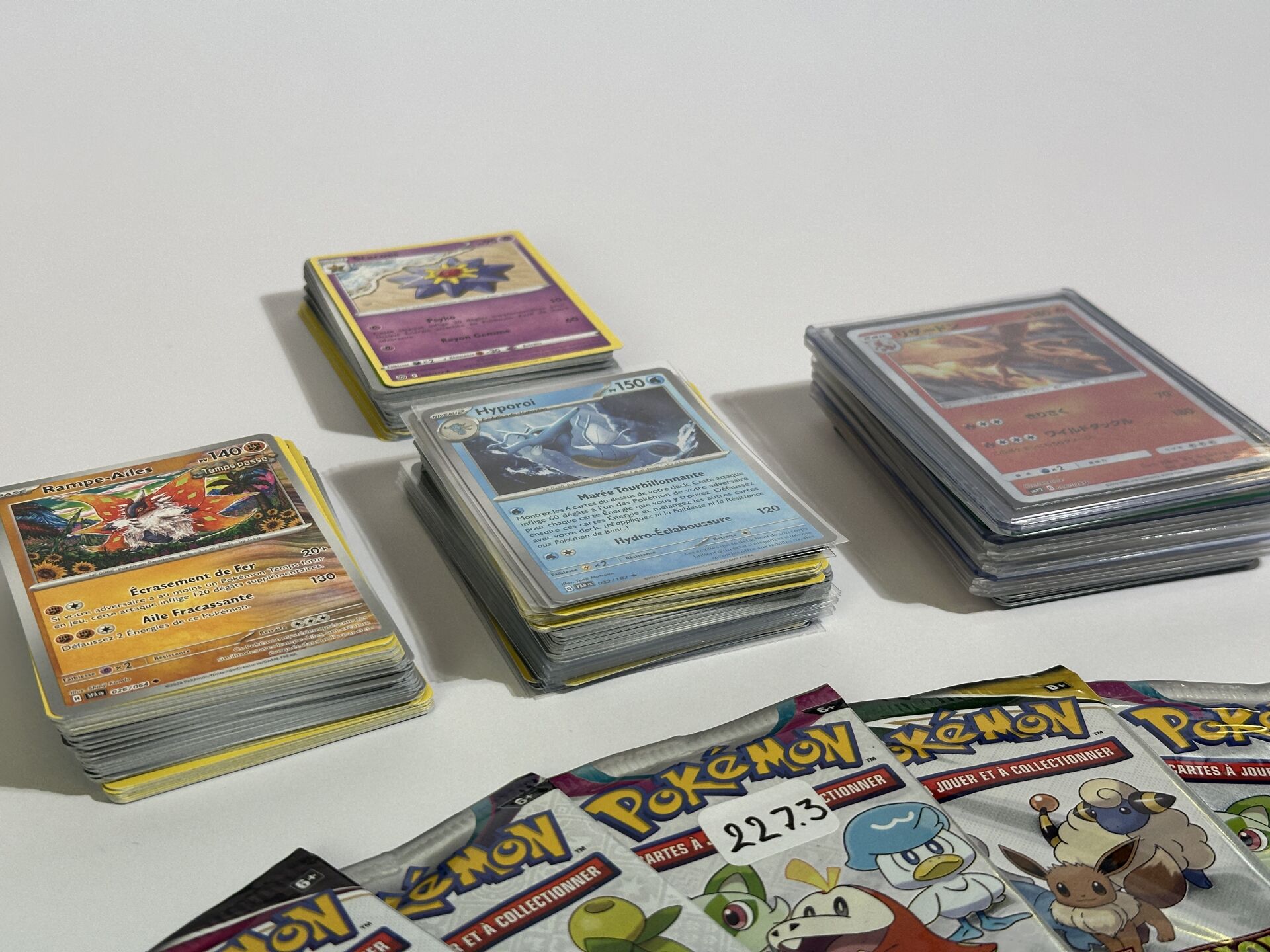 POKEMON - Lot de cartes diverses (environ 650g) toutes éditions majoritairement en Français, très bon état général. Bonne proportion de cartes Holo / Reverse. Contient notamment un Dracaufeu Japonais de l'édition Détective Pikachu Contient également 5 Packs loisir scellés de 3 cartes chacun.
