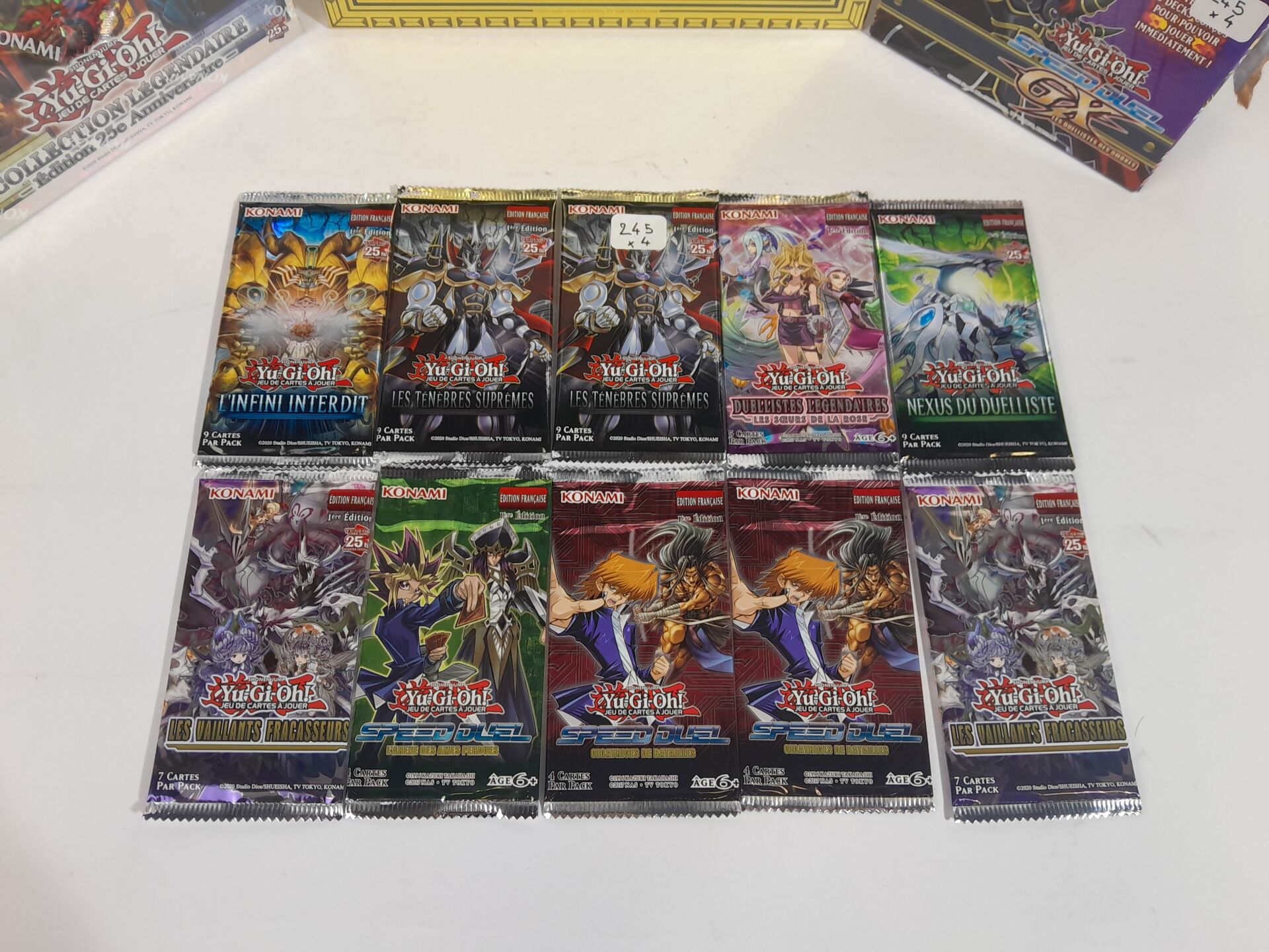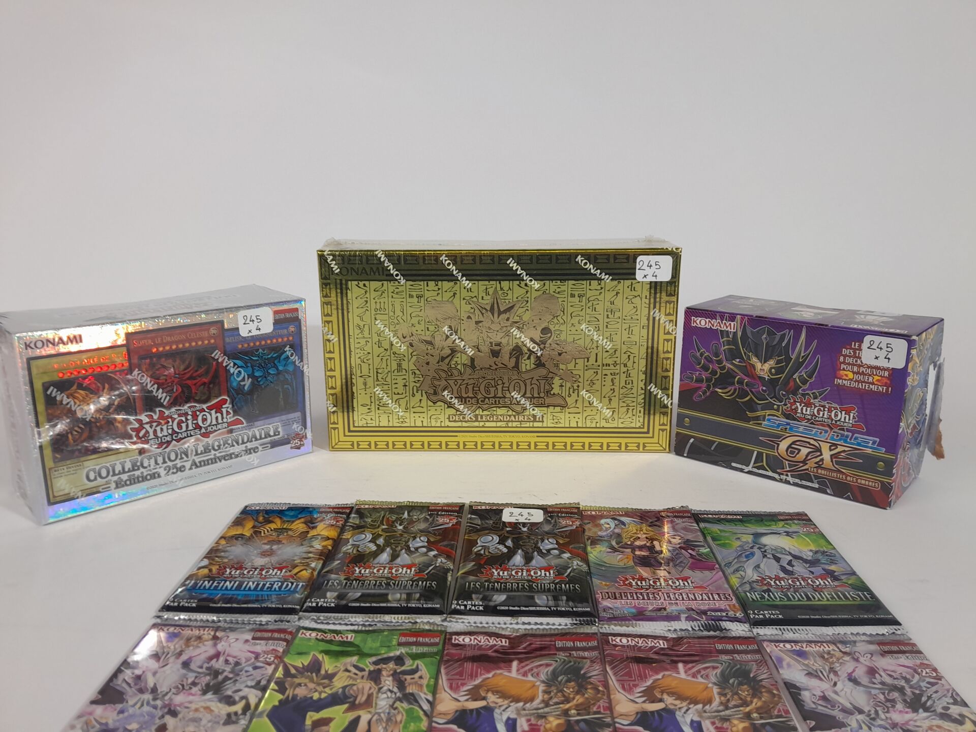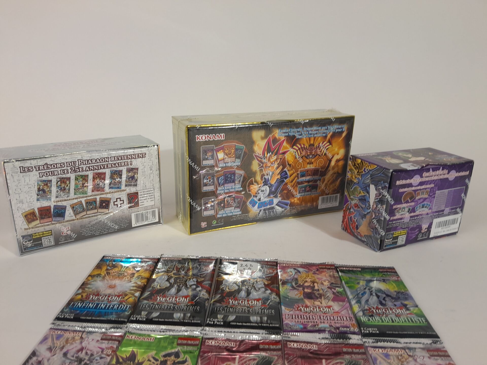 YU-GI-OH! - Lot comprenant : -1 coffret Speed duel GX -1 boîte "COLLECTION LEGENDAIRE - EDITION 25e ANNIVERSAIRE" -1 coffret " Decks Légendaires 2 : Yugi, Kaiba et Joey" -2 boosters version français "LES TENEBRES SUPREMES" -2 boosters version français "LES VAILLANTS FRACASSEURS" -3 boosters version français Speed duel -1 booster version français "NEXUS DU DUELLISTE" -1 booster version français "LES SOEURS DE LA ROSE"
