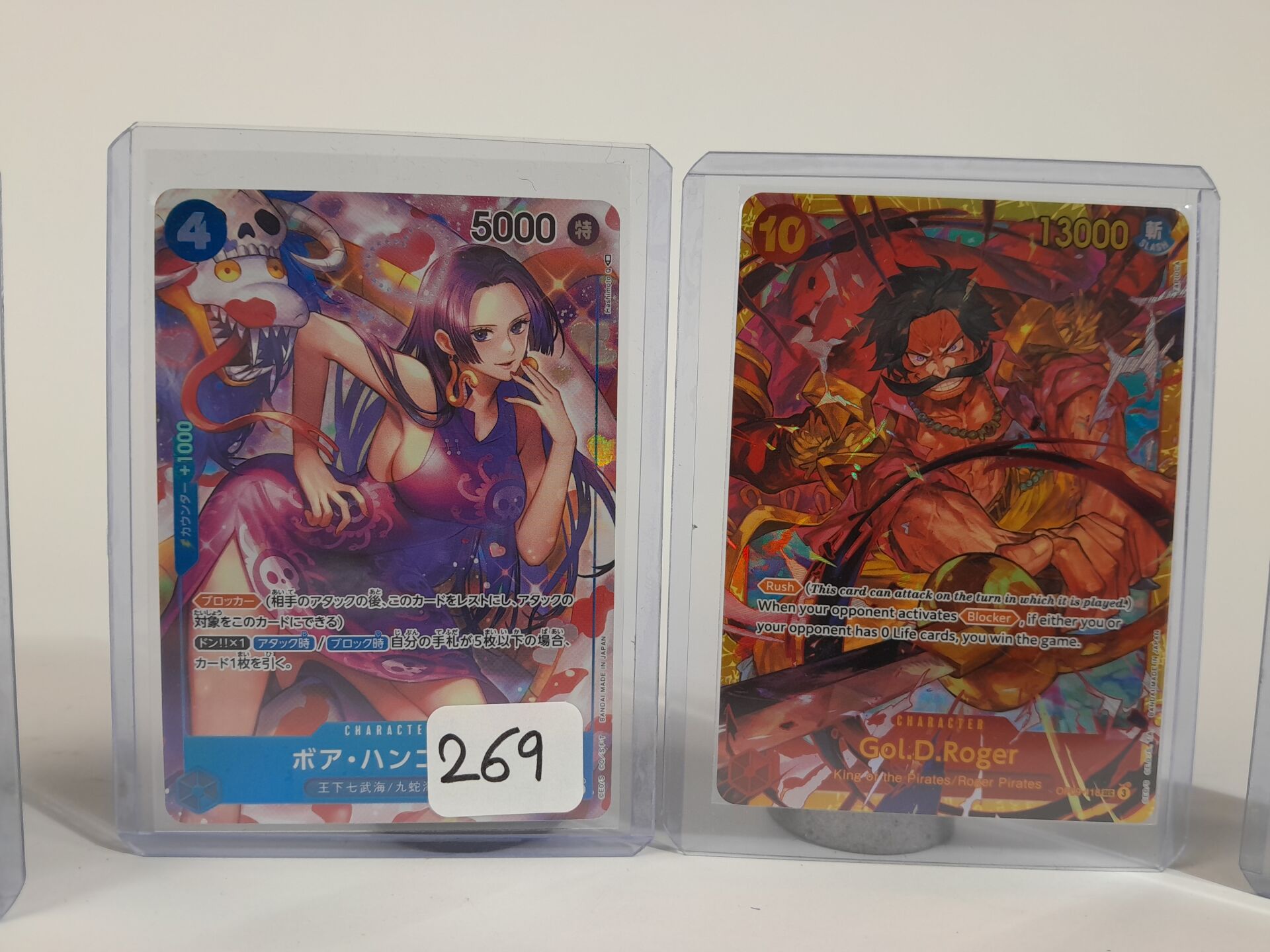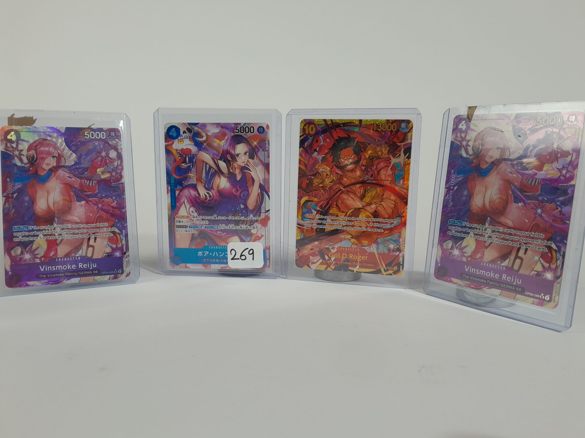 ONE PIECE - Lot de 4 cartes comprenant : -Boe Hancock version japonaise, OP01-078 V2, état NM -2x Vinsmoke Reiju versions anglaises, OP06-069 V2, état NM -Gol.D.Roger version anglais, OP09-118 V1, état NM