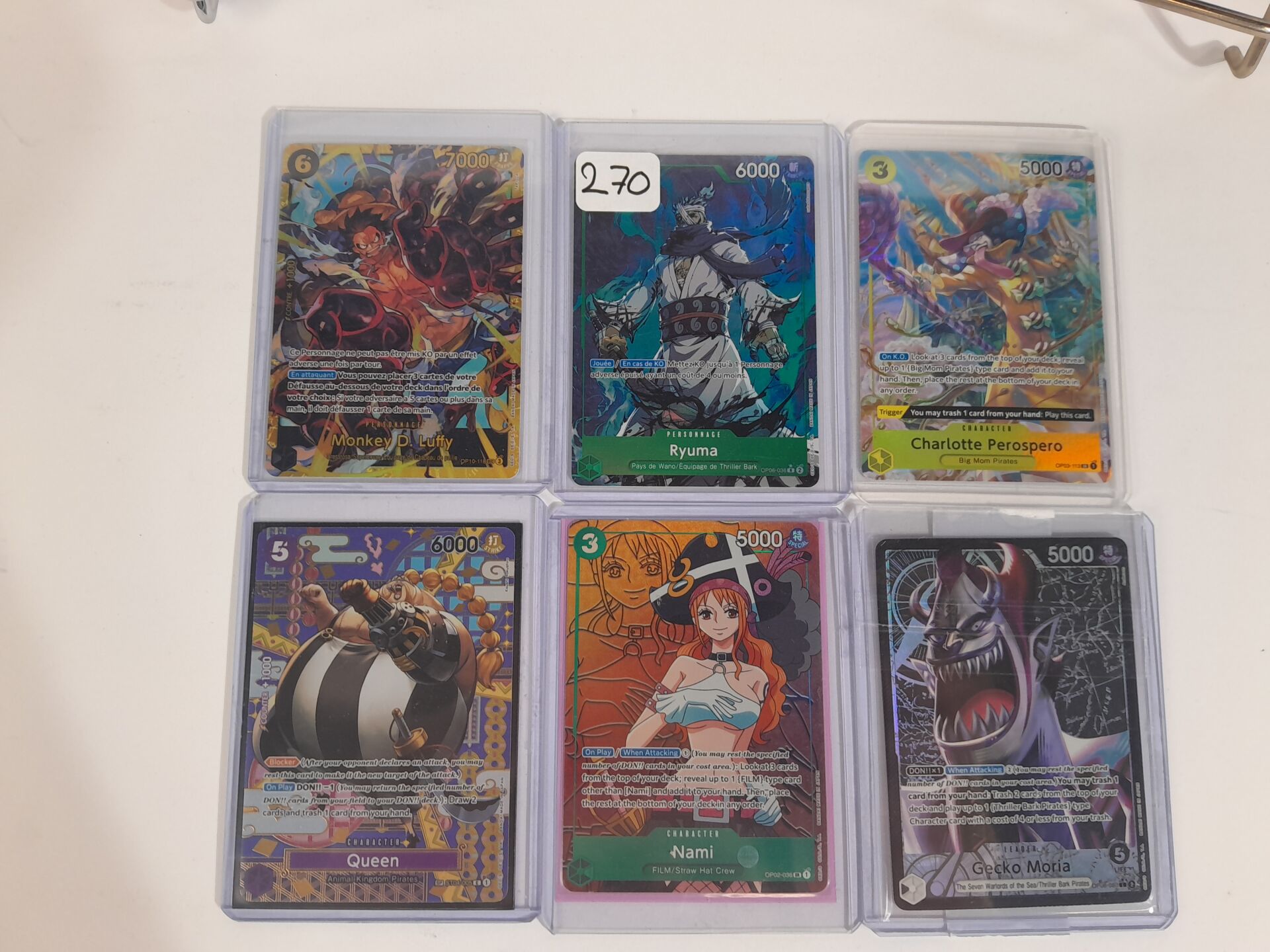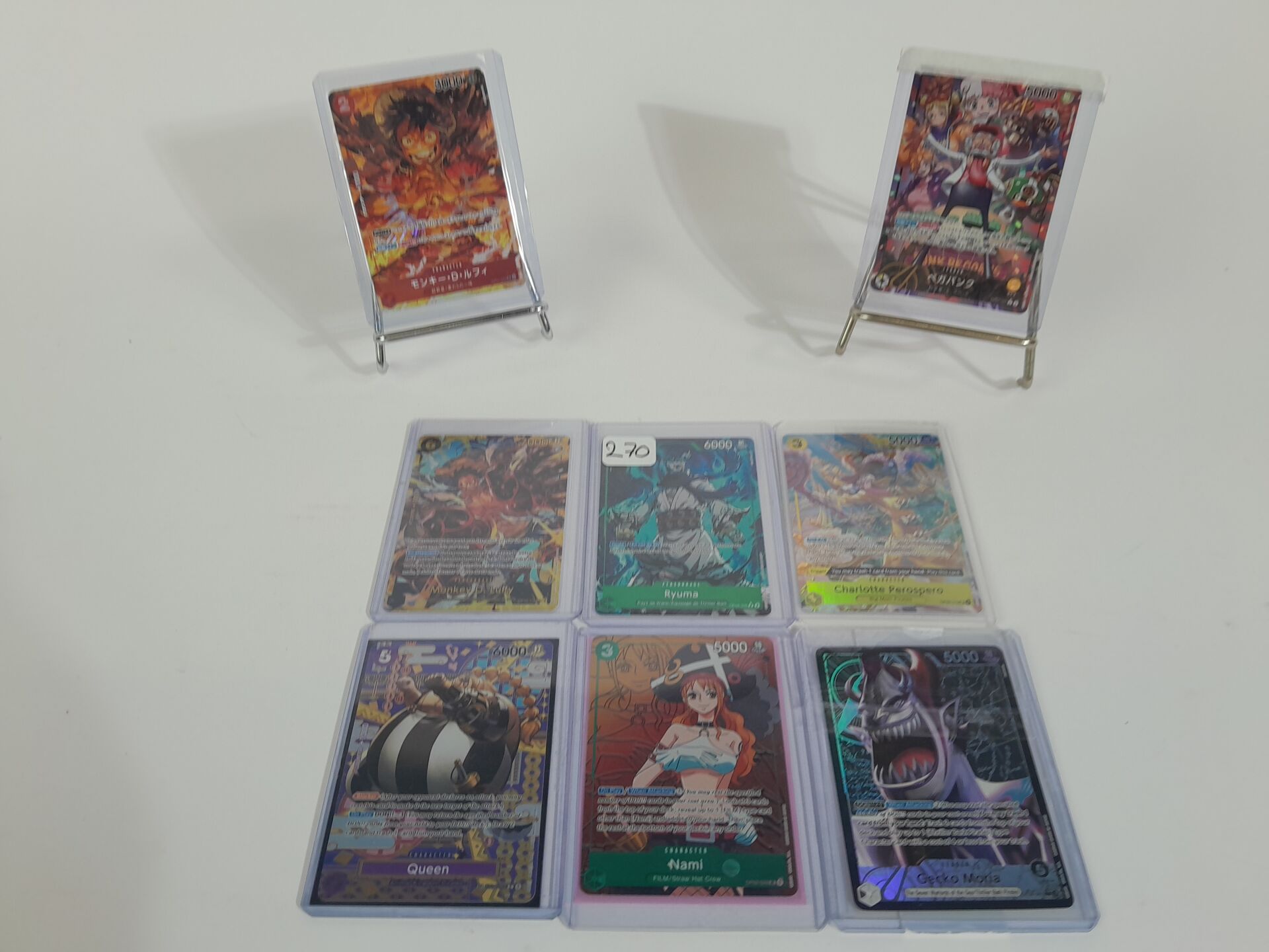 ONE PIECE - Lot de 8 cartes dont : -Monkey.D.Luffy verison français, OP10-118, état NM -Ryuma version français, OP06/036, état NM -Nami version anglaise, OP02-036 V2, état NM -Vegapunk version japonais, OP07-097 V2, état NM -Monkey.D.Luffy version japonais, OP01-024 V2 état NM