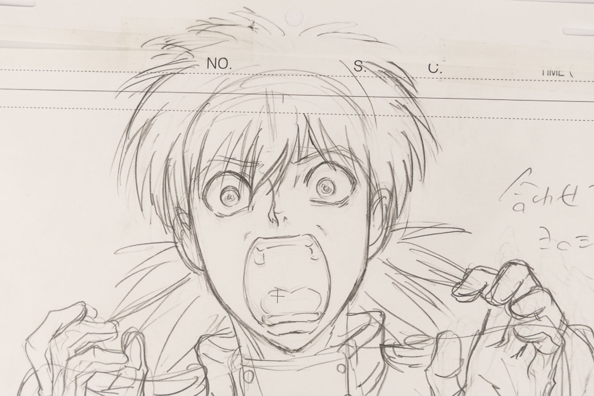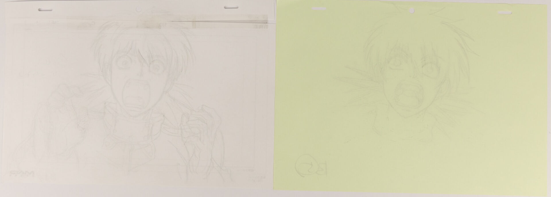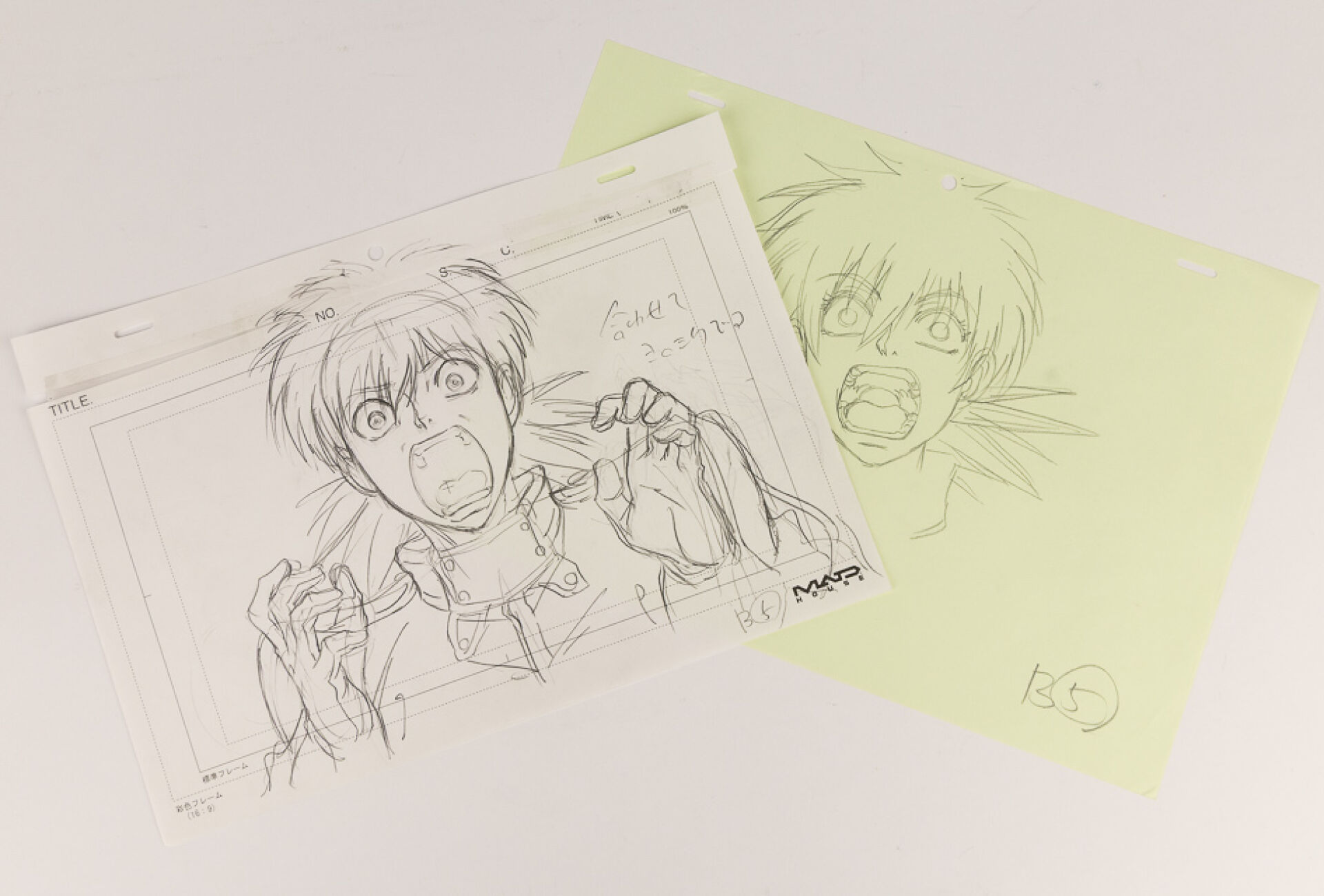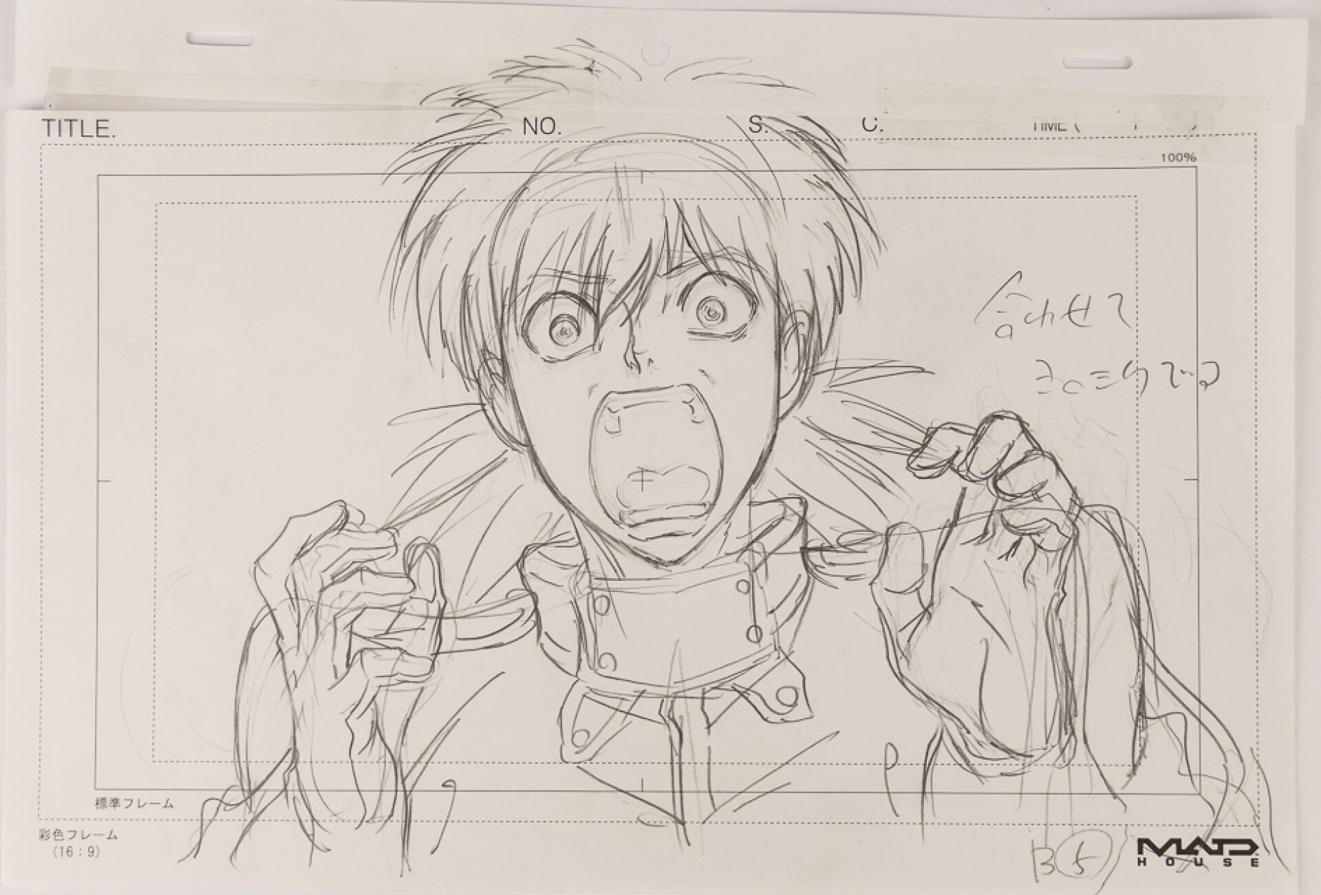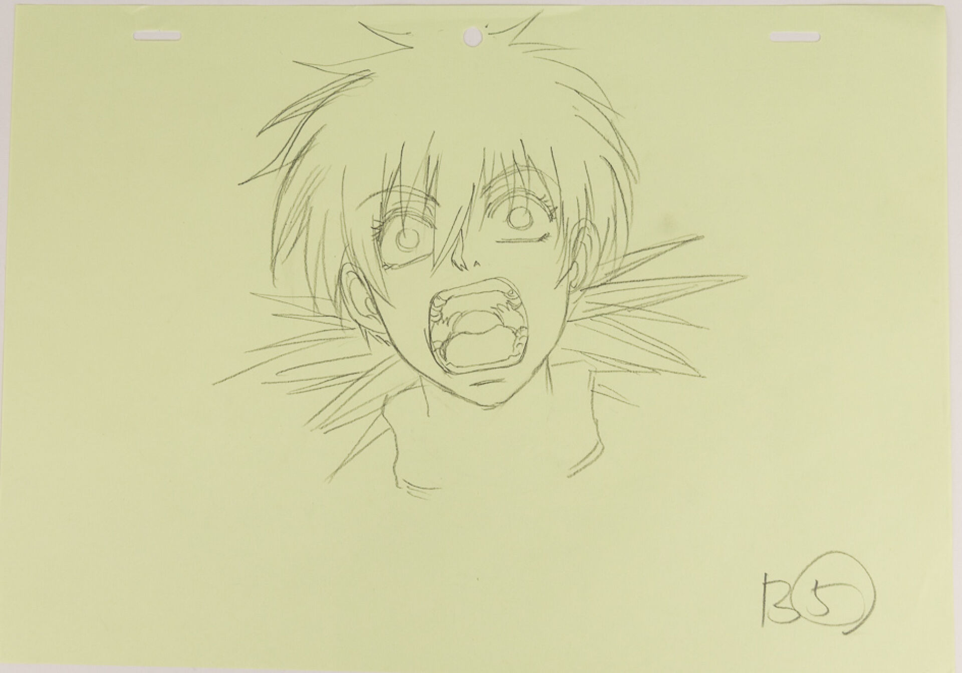 Kōta Hirano (平野 耕太) Hellsing Ultimate (ヘルシング) Genga et feuille de correction originaux à la mine de plomb, représentant le personnage de Seras Victoria choquée bouche grande ouverte. Haut. : 21 cm x Larg. : 29,5 cm environ (Genga découpé sur la largeur en partie haute et scotché) Produit par le studio Madhouse entre 2006 et 2012. Expédition sur devis