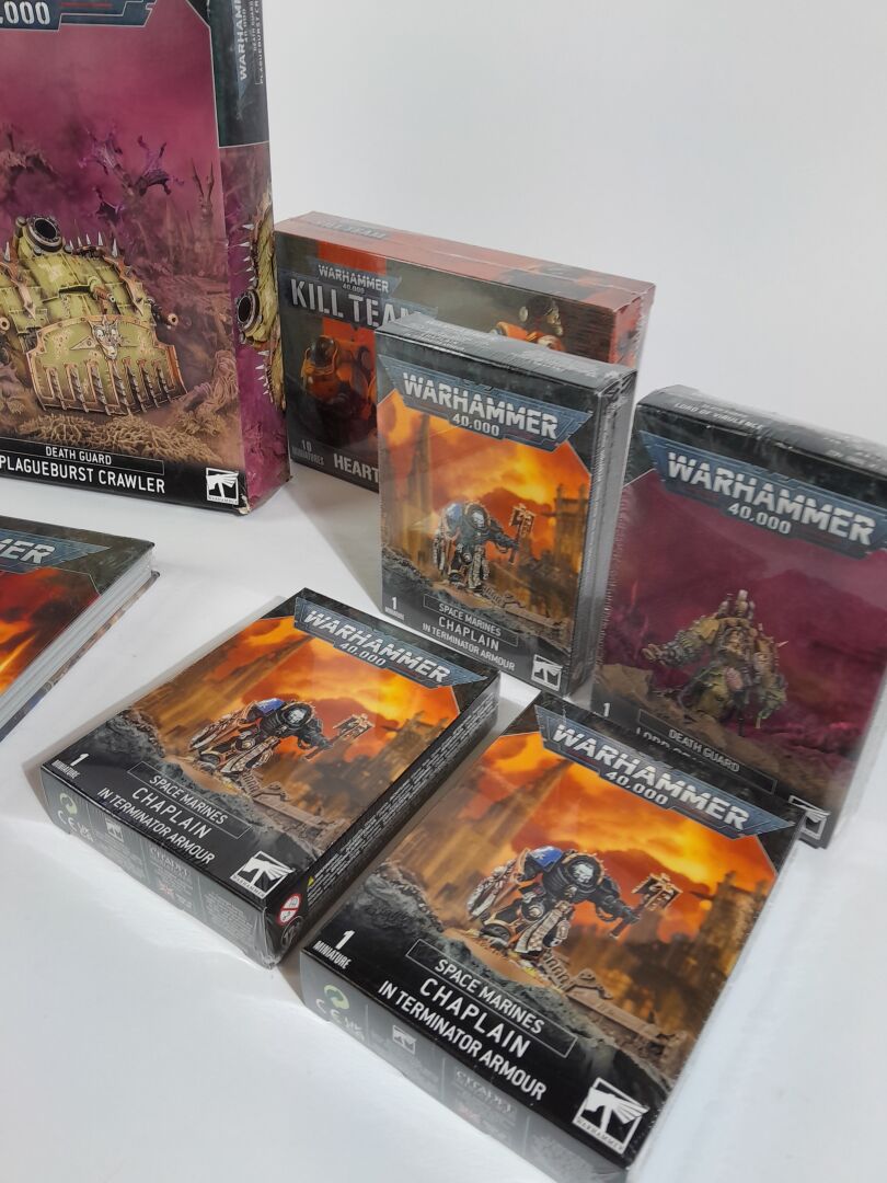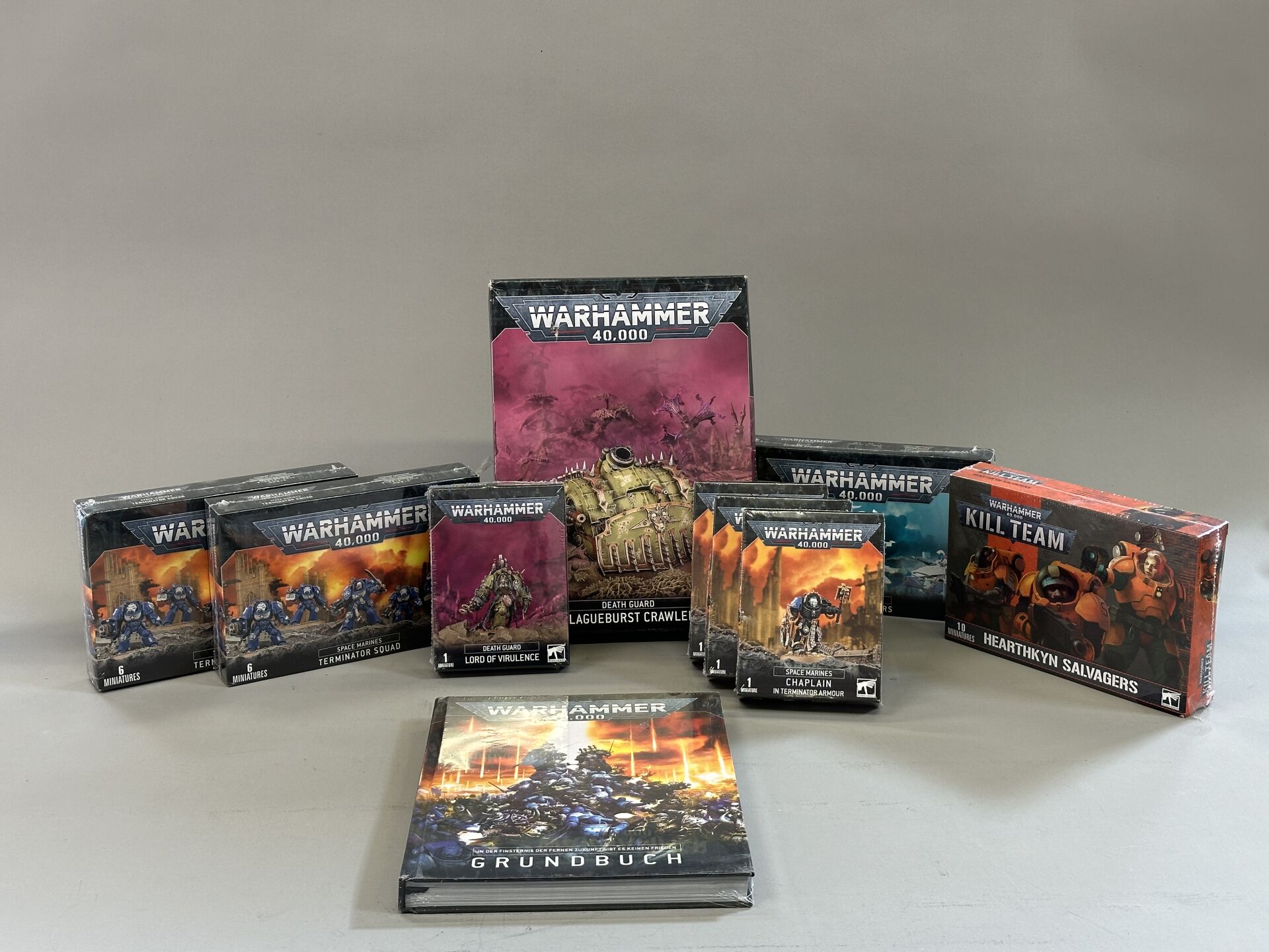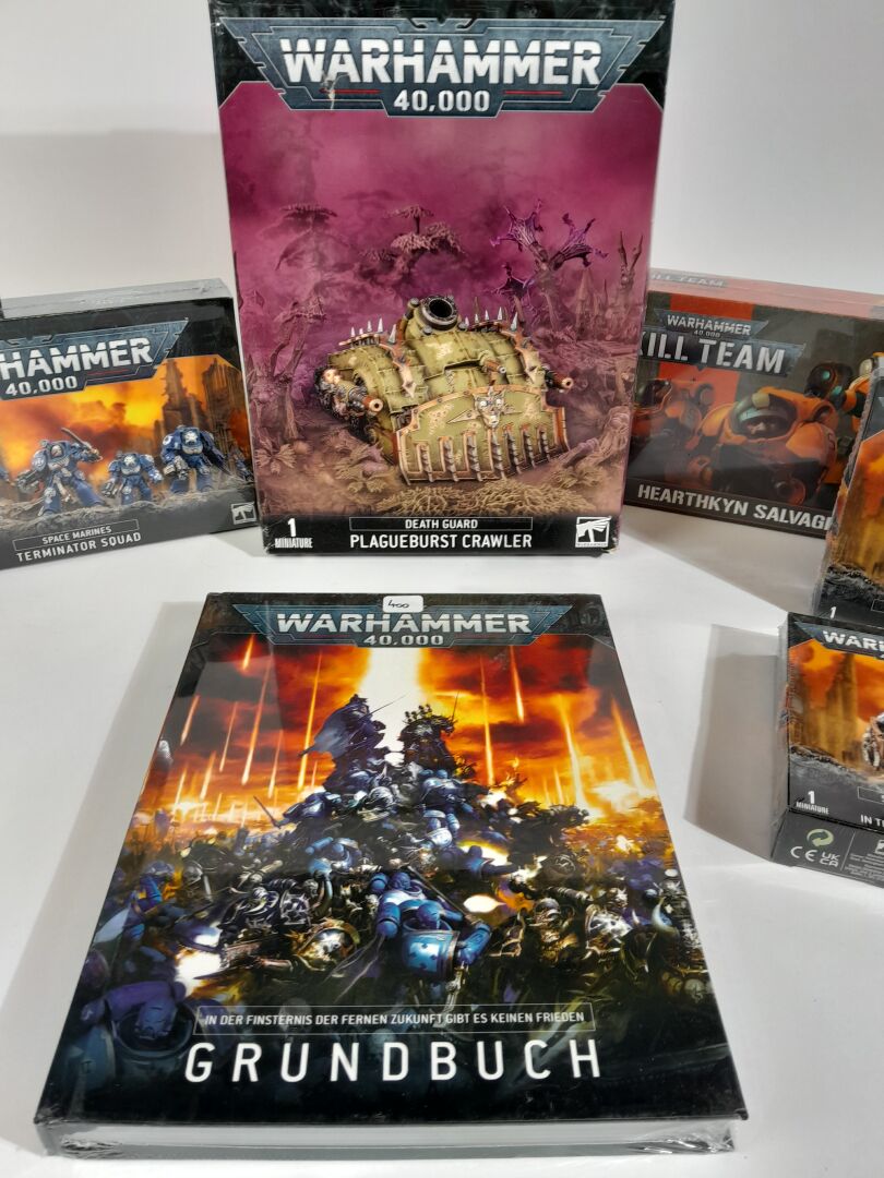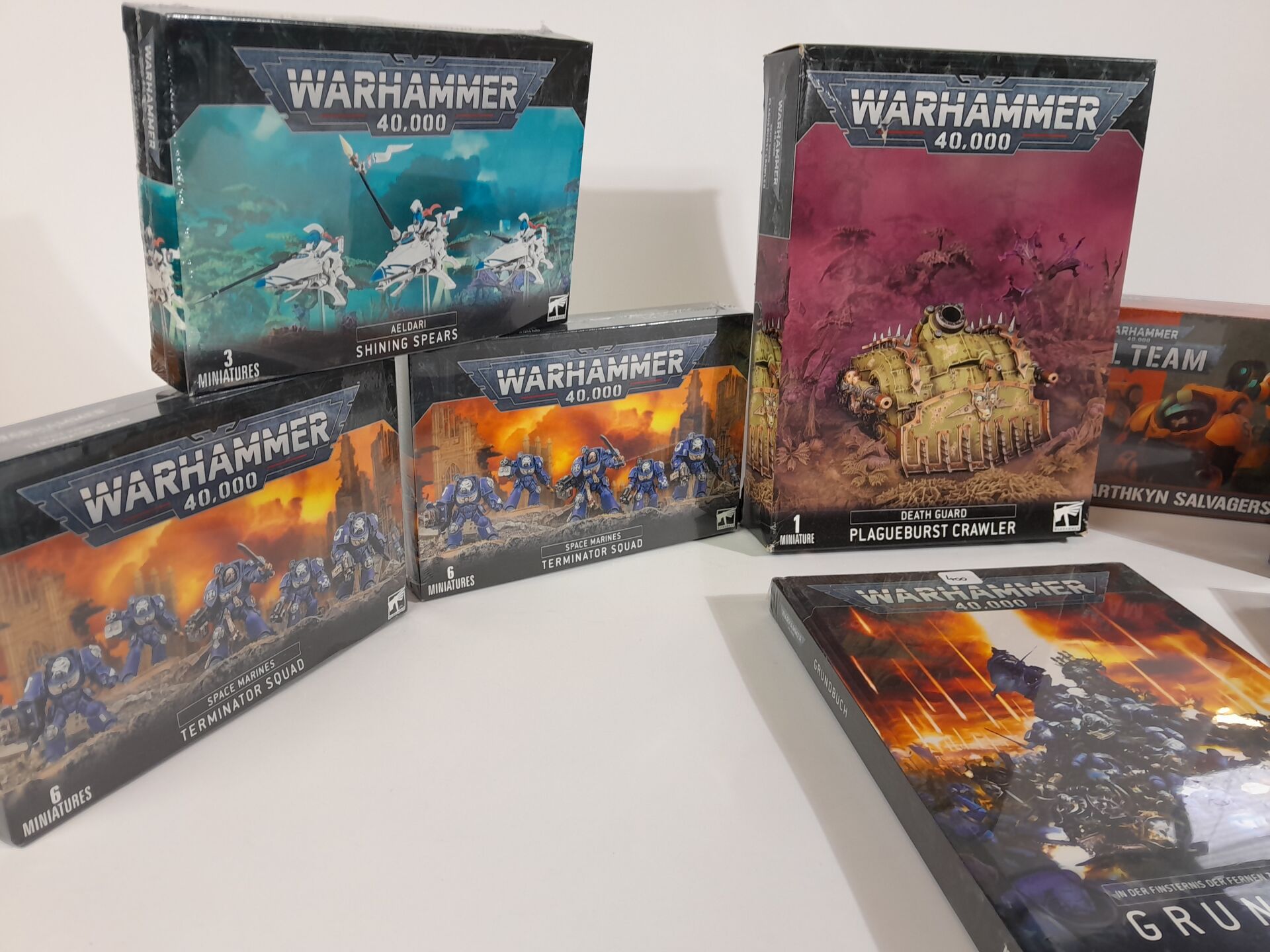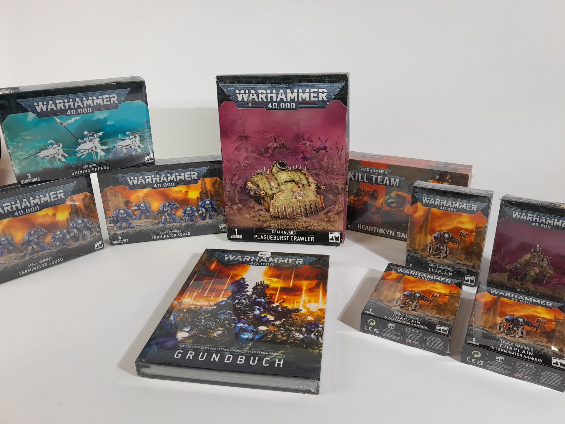 WARHAMMER 40K : Ensemble de 9 boites diverses (la majorité sous blister) auxquelles on joint un livre "Warhammer 40K, Grundbuch" version allemande. (Ce lot chez vous en France métropolitaine pour 27,85 €)