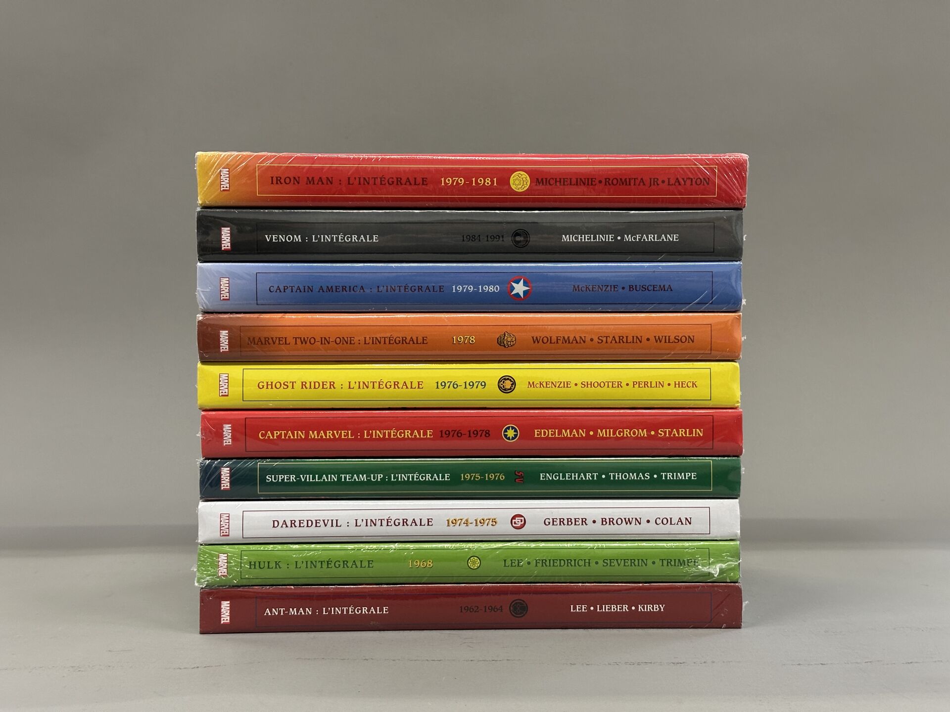Marvel - Collection "L'Intégrale" - Editions Panini Comics - 10 Volumes, sous Blister : - Ant-Man (1962-1964) - par LEE, LIEBER et KIRBY ; - Hulk (1968) - par LEE, FRIEDRICH, SEVERIN et TRIMPER ; - Daredevil (1974-1975) - par GERBER, BROWN et COLAN ; - Super-Villain Team-Up (1975-1976) - par ENGLEHART, THOMAS et TRIMPE ; - Captain Marvel (1976-1978) - par EDELMAN, MILGROM et STARLIN ; - Ghost Rider (1976-1979) - par McKENZIE, SHOOTER, PERLIN et HECK ; - Marvel Two-in-One (1978) - par WOLFMAN, STARLIN et WILSON ; - Captain America (1979-1980) - par McKENZIE et BUSCEMA ; - Iron Man (1979-1981) - par MICHELINIE, ROMITA JR et LAYTON ; - Venom (1984-1991) - par MICHELINIE et McFARLANE. (Ce lot chez vous en France métropolitaine pour 34.45 €)