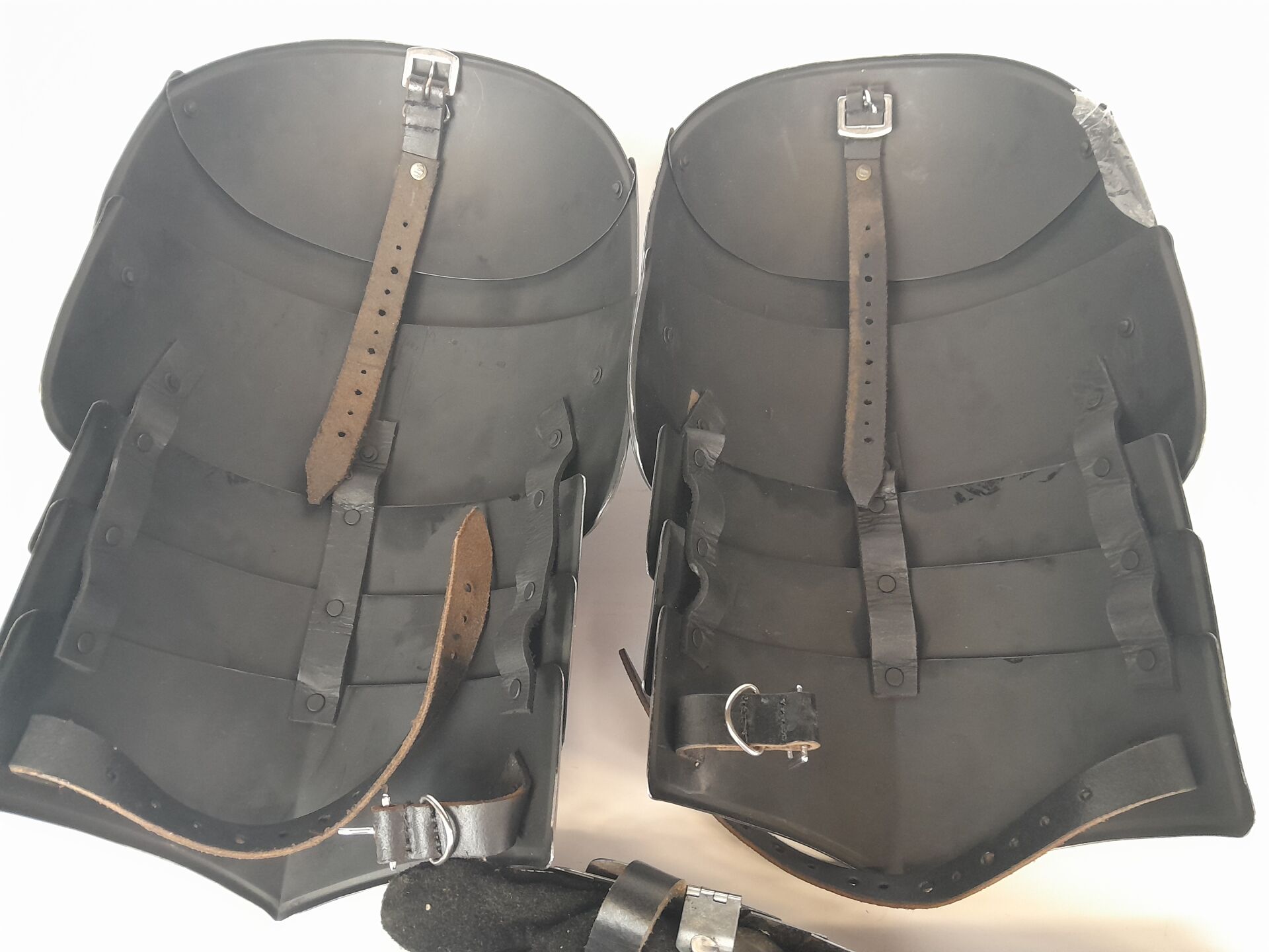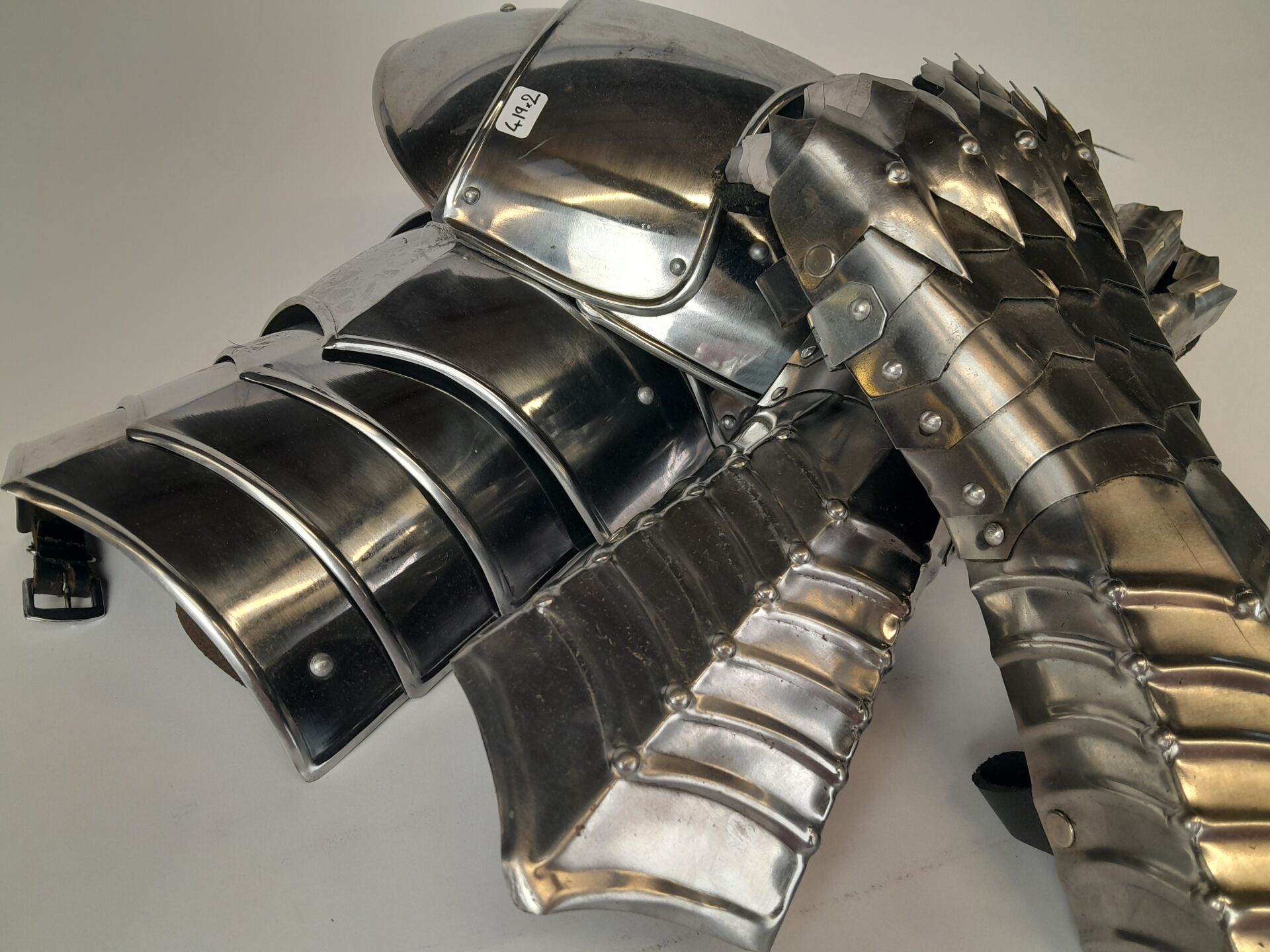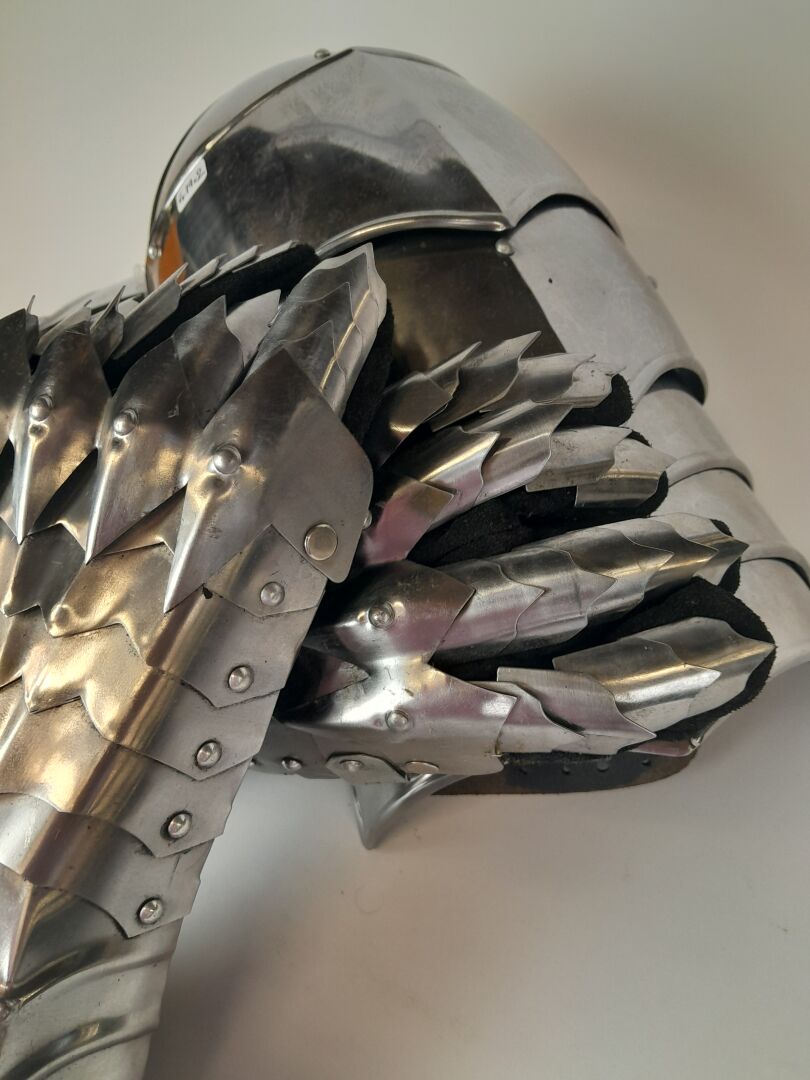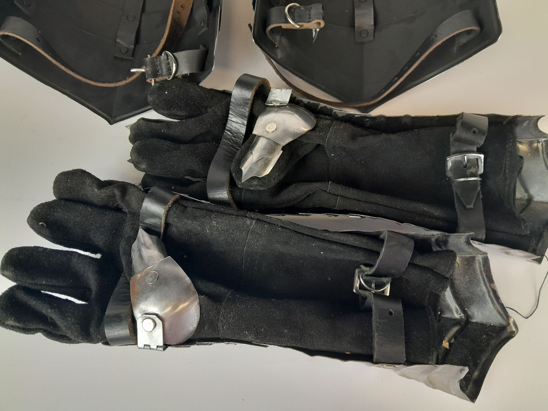 Lot d'armure fantasy comprenant 2 épaulettes et 2 gants articulés en métal argenté et cuir.