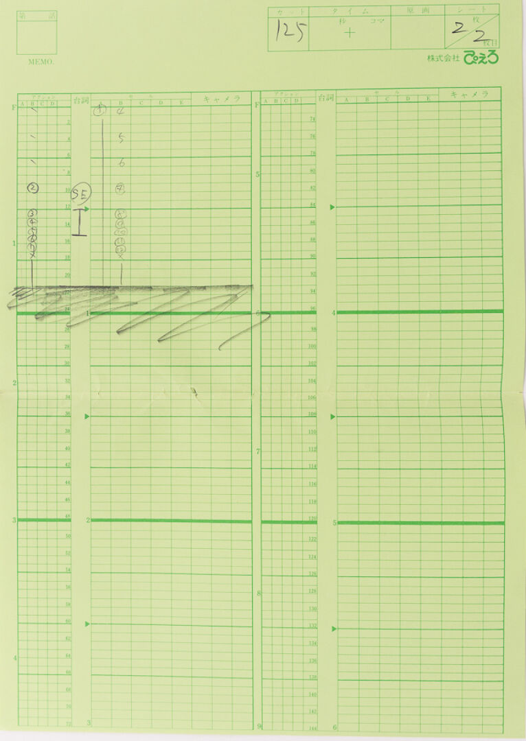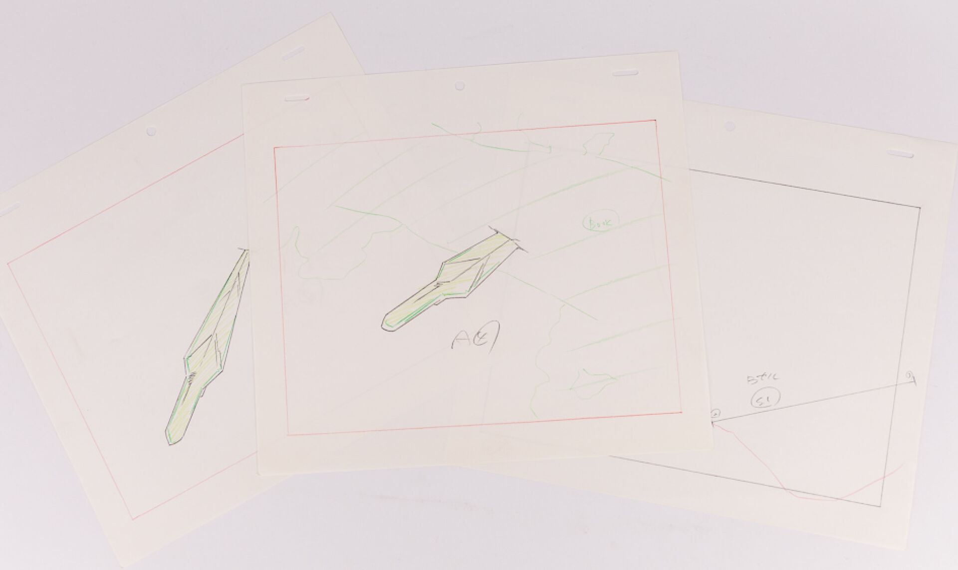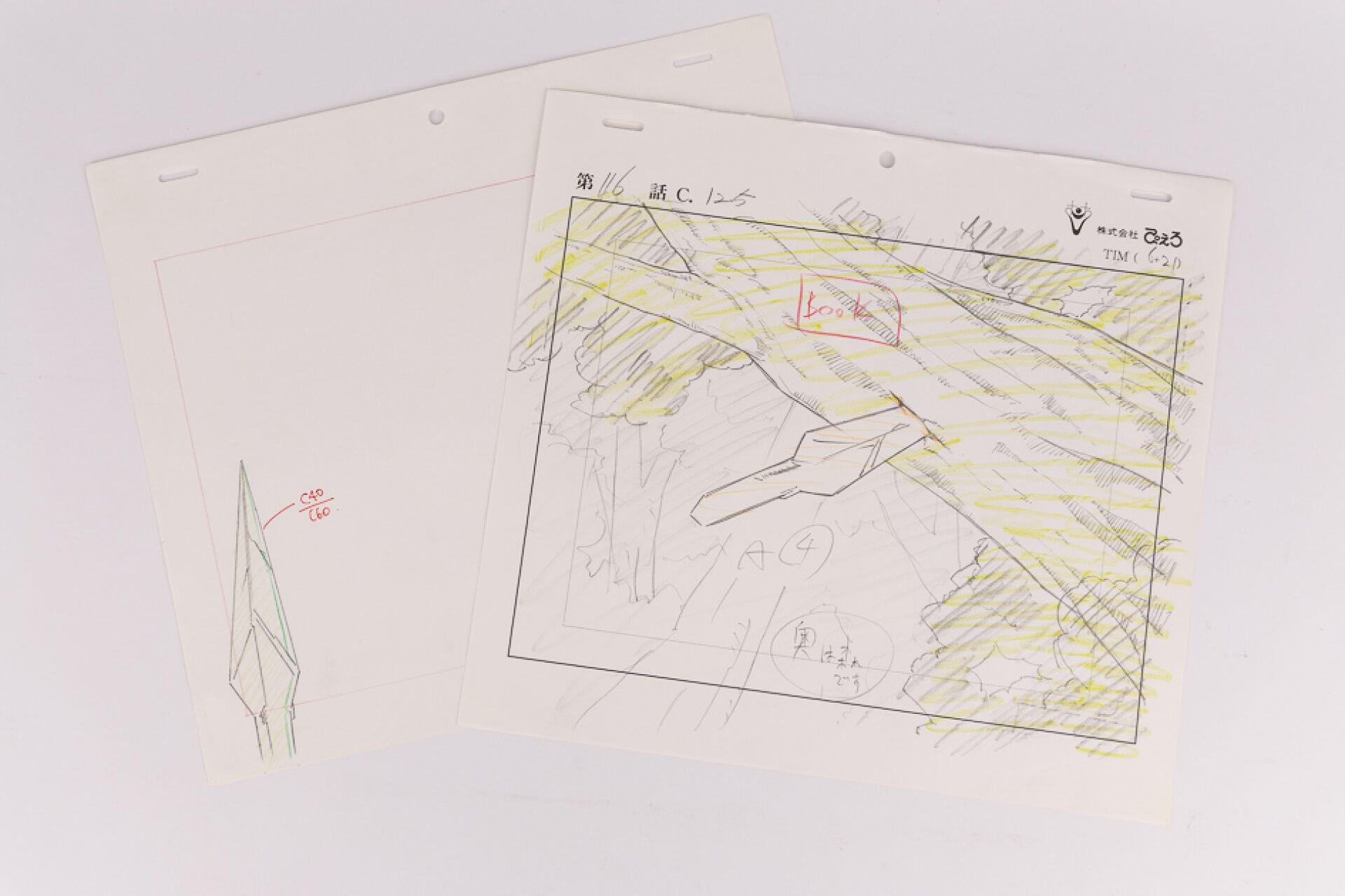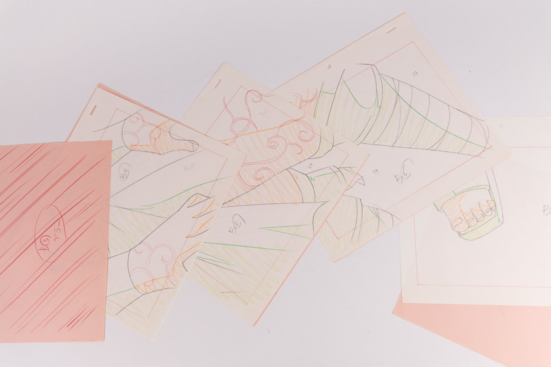 Masashi Kishimoto (岸本 斉史) et Hayato Date (伊達 勇登) - Naruto Shippûden (ナルト 疾風伝, signifiant littéralement : Naruto Chroniques de l'Ouragan) Ensemble de vingt-et-un feuillets comprenant un layout, onze gengas (et une copie annotée) et huit feuilles de corrections (roses) originaux à la mine de plomb et aux crayons de couleur avec feuilles de temps originale (Time-sheet) représentant le personnage Kidômaru le ninja du village caché du Son en pleine attaque. (Quelques pliures) Haut. : 24 cm x Larg. : 27 cm Produit par studio Pierrot de 2002 à 2007