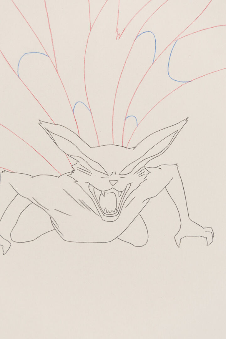 Masashi Kishimoto (岸本 斉史) et Hayato Date (伊達 勇登) - Naruto (ナルト) - Kurama (九喇嘛) aussi connu sous le nom de Kyûbi (九尾, signifiant littéralement : Neuf Queues) : Dôga (Douga) original à la mine de plomb et aux crayons de couleur représentant Kurama, le démon renard à neuf queues, poussant un cri en plein assaut. Haut. : 21 cm x Larg. : 30 cm Produit entre 2002 et 2017 par studio Pierrot. Expédition sur devis