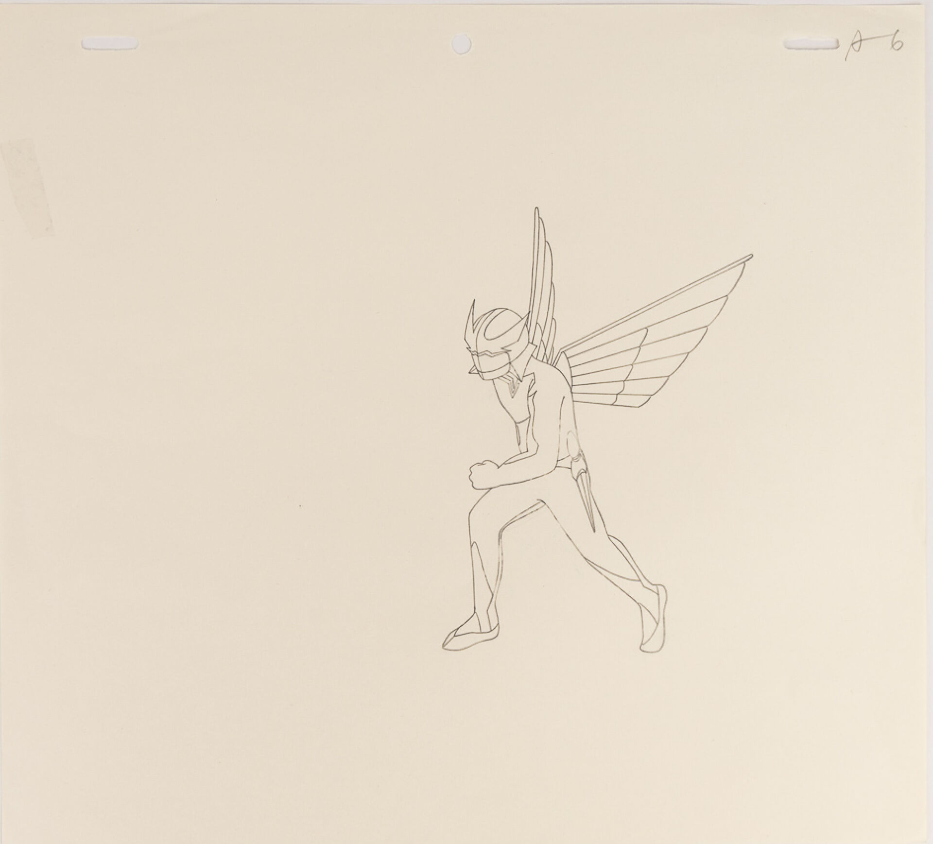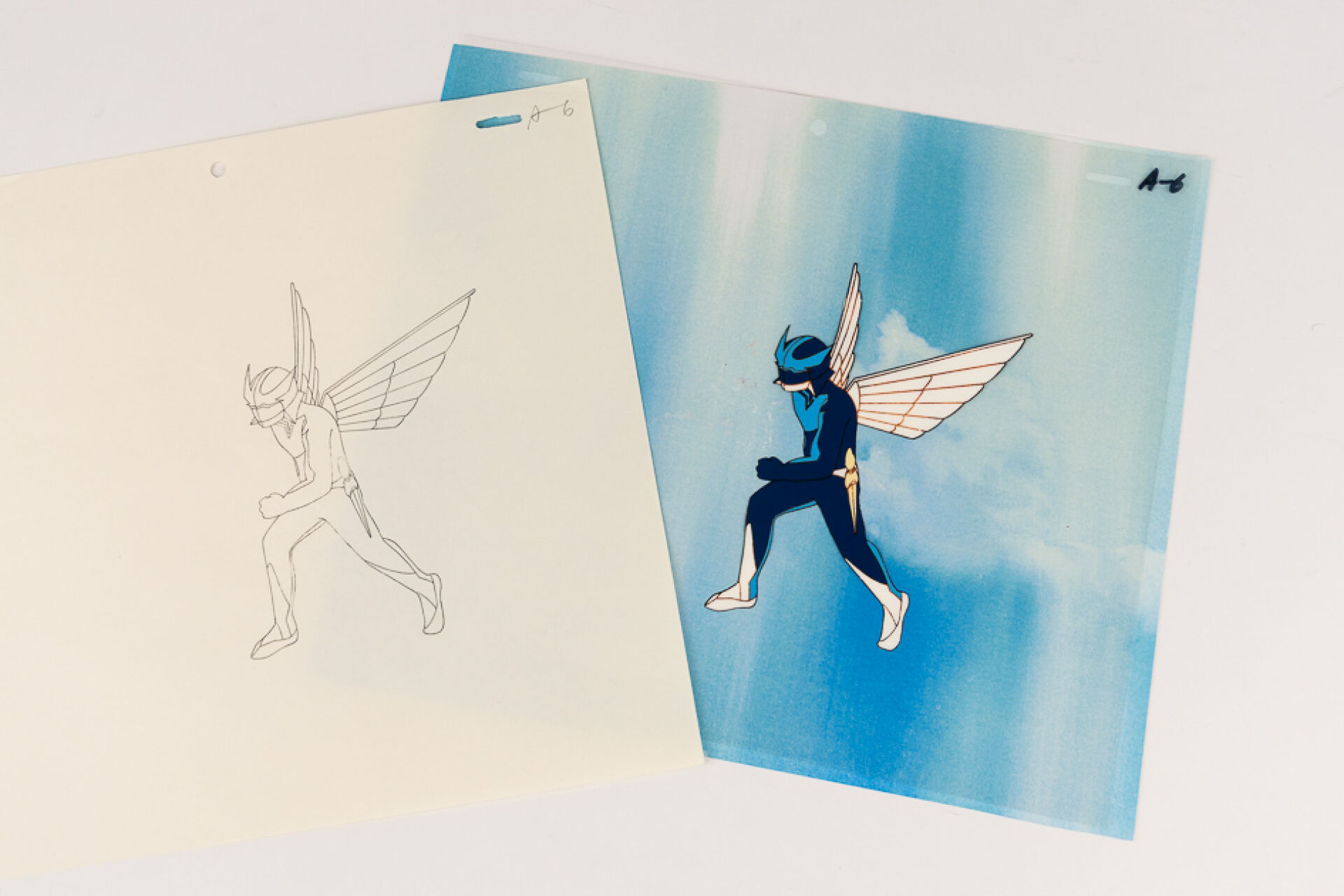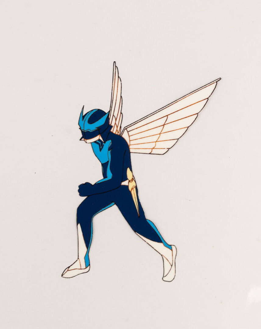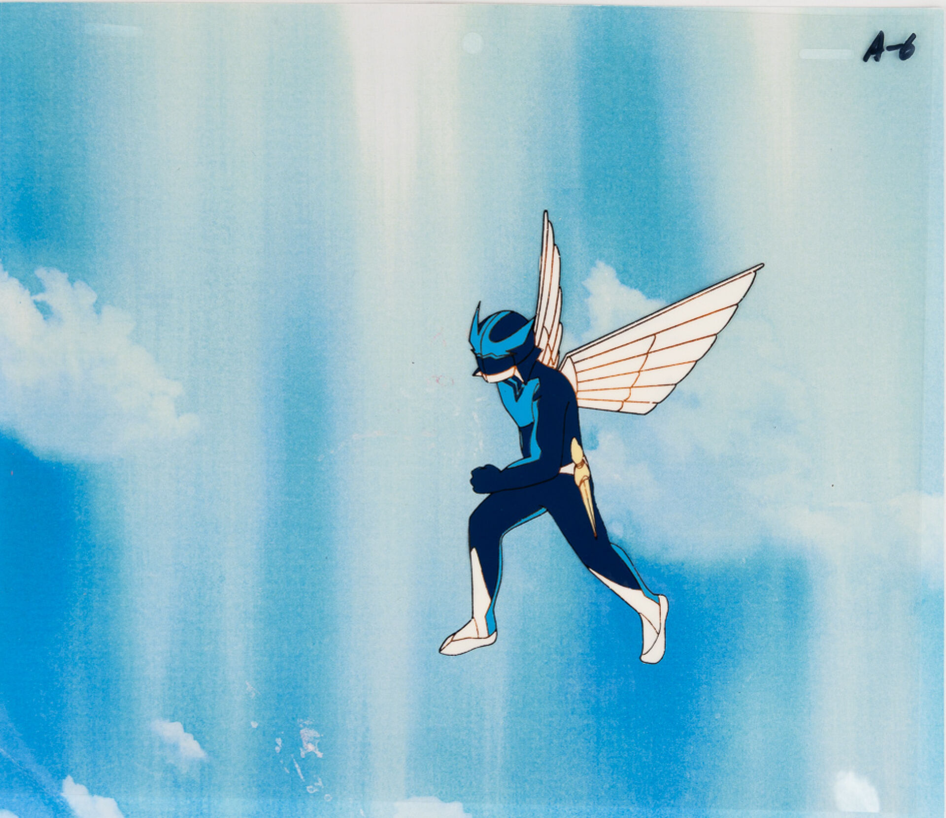 Masakazu Katsura (桂・正和) Wingman (ウイングマン) Magnifique cellulo (cel / celluloïd) original gouaché avec son douga à la mine de plomb et aux crayons de couleur sur un décor imprimé rapporté, représentant le personnage Kenta Hirono (David Duchemin en VF) en vol en plein combat. Haut. : 23 cm - Larg. : 26 cm. Produit par studio Toei Animation en 1984-1985.