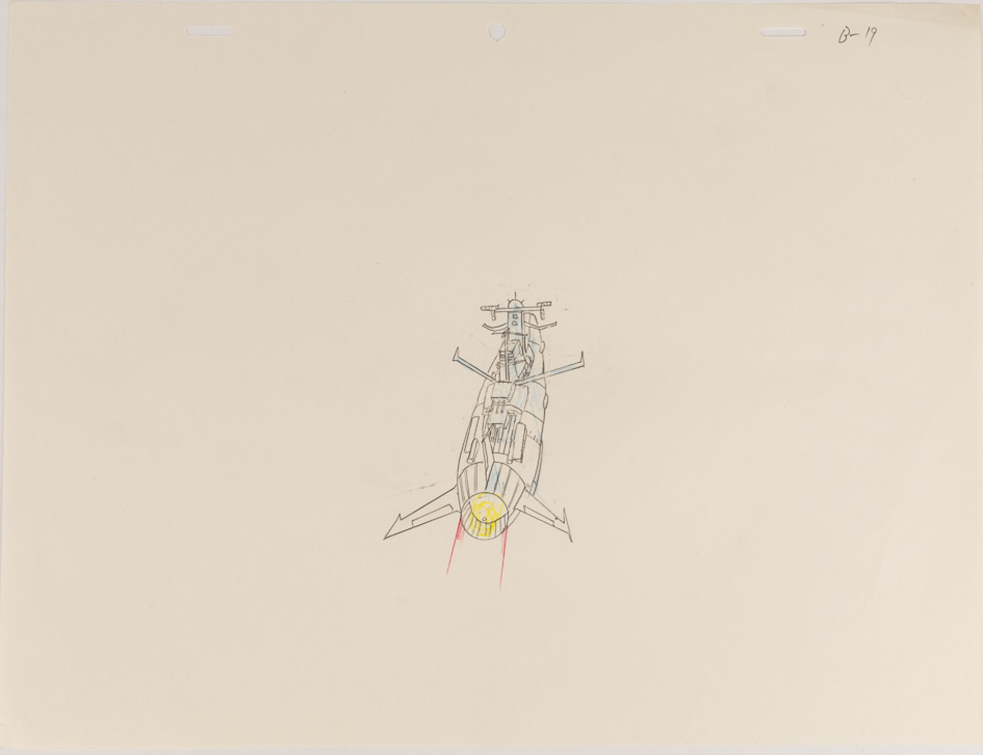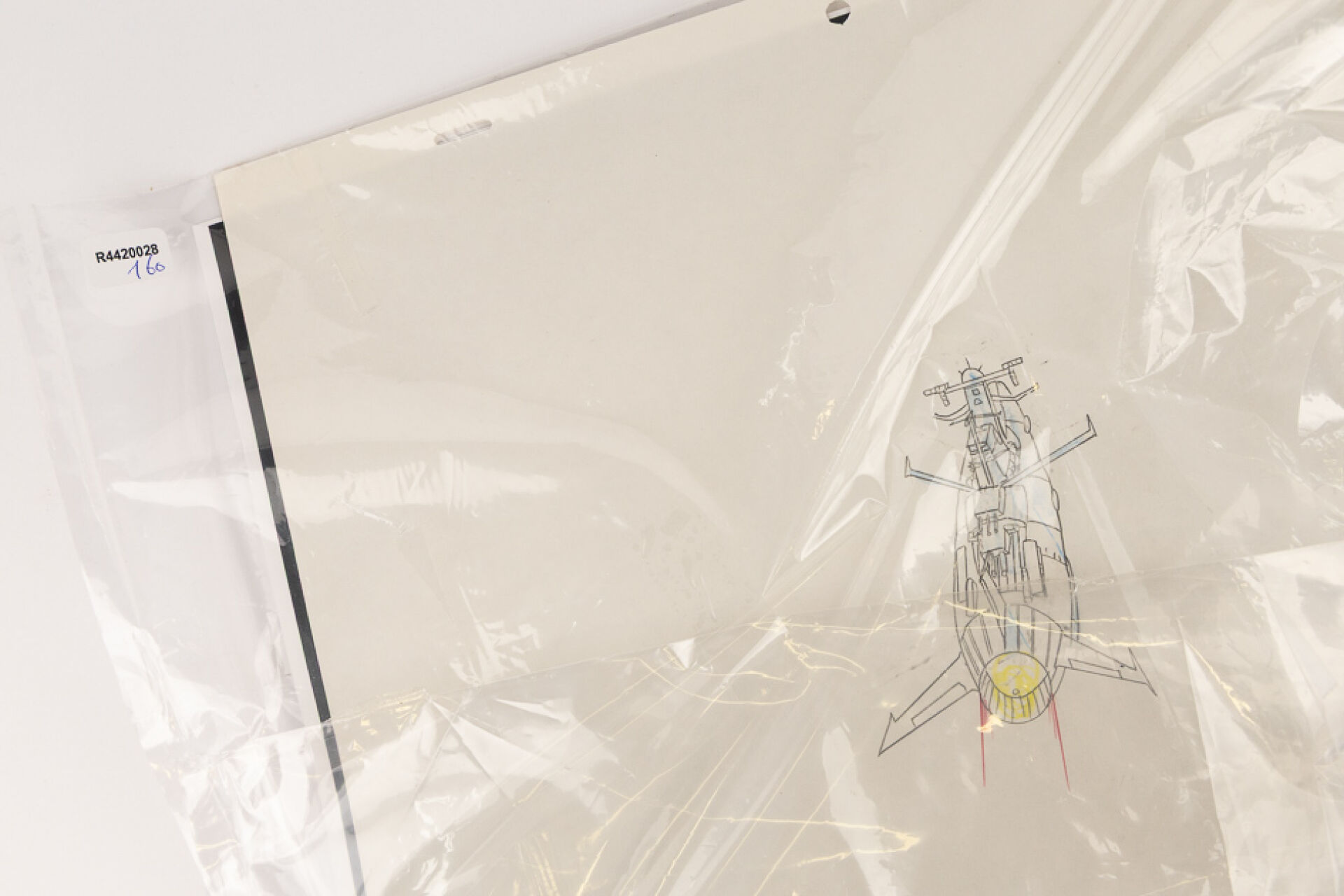 Leiji Matsumoto (松本零士) - Yamato, le cuirassé de l'espace (宇宙戦艦ヤマト) ou Star Blazers - Vaisseau Yamato Dôga (Douga) original à la mine de plomb et aux crayons de couleur représentant le majestueux cuirrassé Yamato. Haut. : 26,5 cm - Larg. : 34,5 cm Produit, par Toei Animation à partir de 1977 (Expédition sur devis) Oeuvre phare de feu Maitre Matsumoto, père d'Albator.