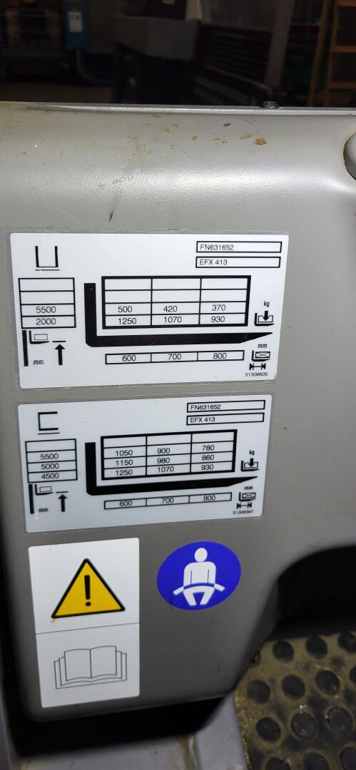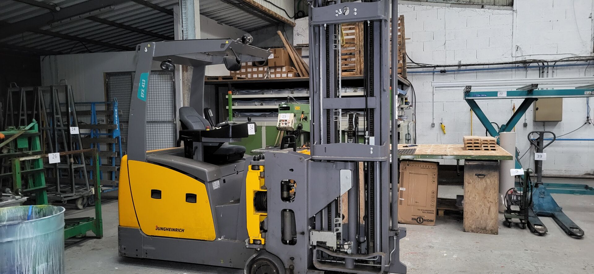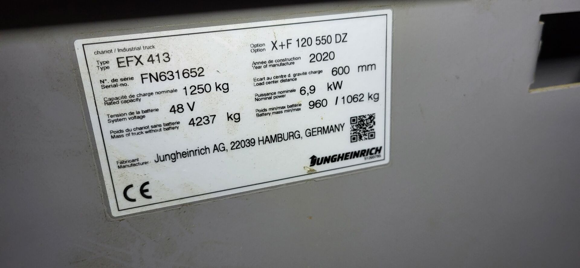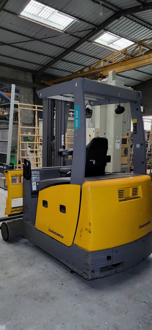 Vendu sur désignation le 12 03 2026 à 10h 24 rue du marché commun à Nantes, Enlèvement les 17/18/19 mars 2026 de 9h à 17h à CARQUEFOU - frais de mise à disposition 10 € TTC 1 chariot élévateur électrique grande hauteur JUNGHEINRICH EFX 413 No FN631652 siège frontal mat latéral capacité de charge 1250 kg de 2020 - hauteur levée 4500 mm compteur = 1 919 heures