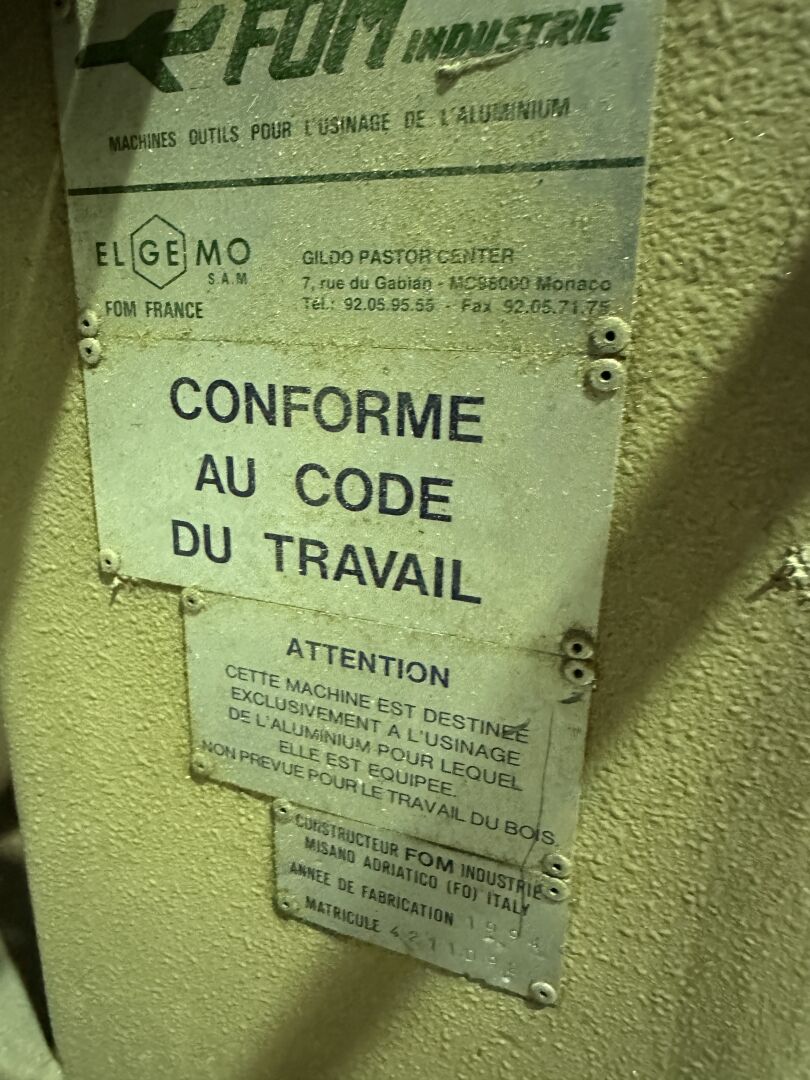 Vendu sur désignation le 12 03 2026 à 10h, 24 rue du marché commun 44300 NANTES, visible sur RDV le 12 03 2026 à 8h30 à ST HERBLAIN, Enlèvement le 20/03/2026 à 9h, frais de mise à disposition 10 € TTC 1 tronçonneuse 1 tête FOM INDUSTRIE Sprina 42 , 4211092, de 1994, diam 410 mm, triphasée; amenage à rouleaux, amont 5 m, aval 3 m 1 Ensemble de 16 gabarits pour coupes et perçages de profils aluminium HYDRO, TECHNAL, USITECH : TECHNAL (TWU0030, TWU0012, TWU009, TWU0015, TFY7013, TFY7012, TWU008, TFY7009, TWU0006, TWU0031) USITECH (TWU0005, TFY7038, TWU0013, TGY7002, TWU005) HYDRO (WU0004, TFY7036, FY7000)