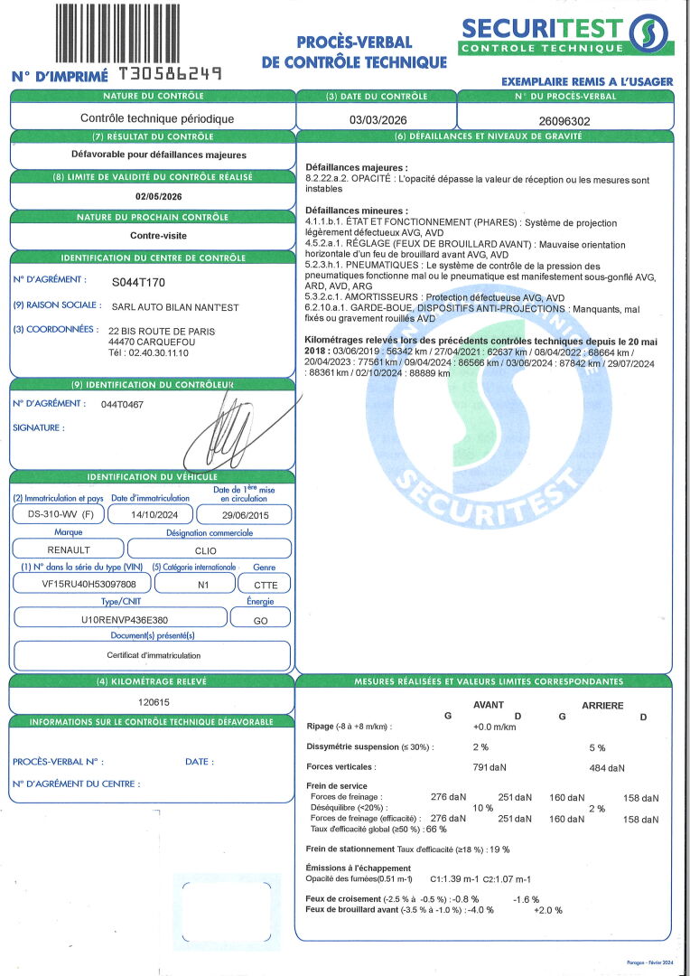 BVM5- CLIM- RADIO- VITRES ET RETROS ELECT- REGULATEUR DE VITESSES- RADAR DE RECUL- ANCIENNES MARQUES DE PUB ADH. SIEGES EN TISSU TACHES- PLASTIQUES RAYES ET TACHES. IMPACTS SUR LE CAPOT MOTEUR- FROTTEMENTS SUR LE PARE CHOCS AV ET AR- CARROSSERIE RAYEE. DEFAILLANCE MAJEURE: DEFAUT D'OPACITE. DEFAILLANCES MINEURES: DEFAUT DE PROJECTION DES FEUX AVG ET AVD- MAUVAISE ORIENTATION DES FEUX DE BROUILLARD AVG ET AVD- 4 PNEUS SOUS GONFLES- PROTECTION DEFECTUEUSE DES AMORTISSEURS AVG ET AVD. FRAIS JUDICIAIRES: 11.9% HT.
