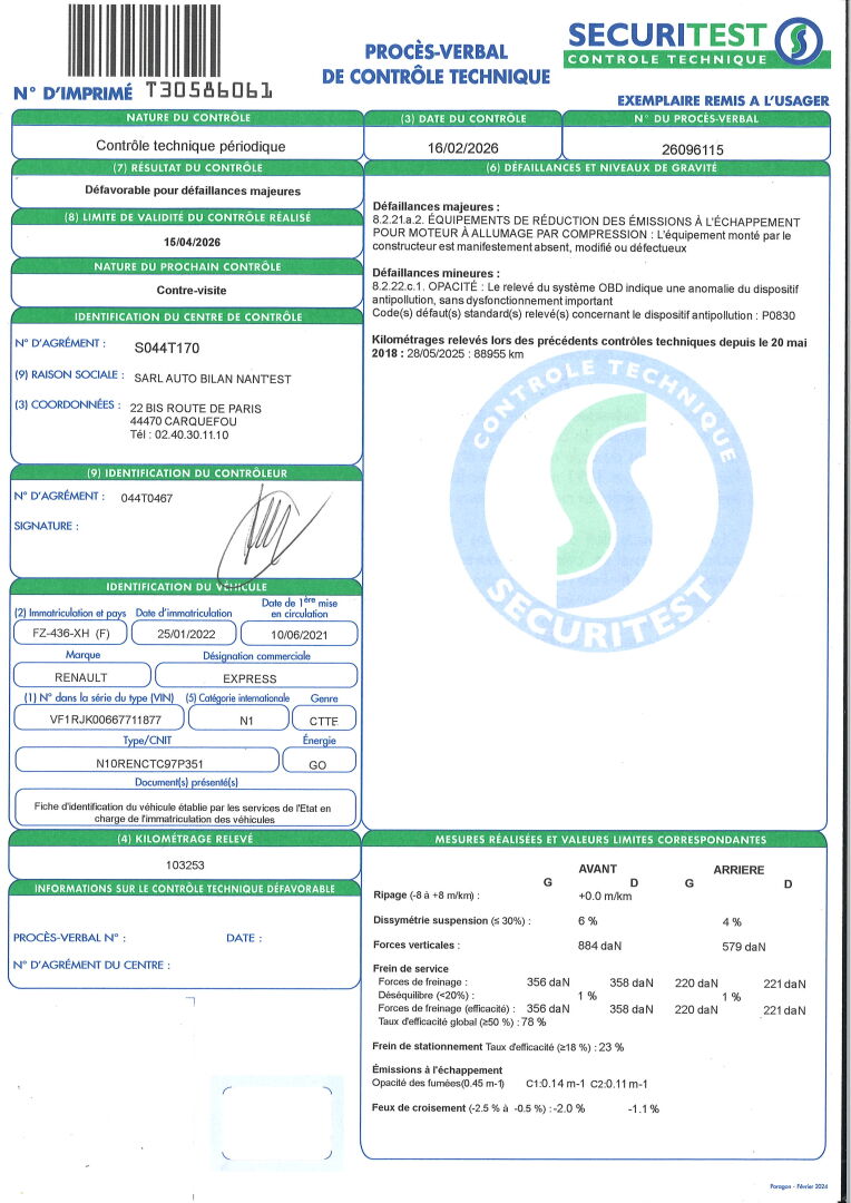 VEHICULE VENDU AVEC FIV ET NUMERO DE FORMULE. BVM6- CLIM- RADIO- VITRES ET RETROS ELECT- REGULATEUR DE VITESSES- RADAR DE RECUL- CAISSE BOIS AVEC RGT. SIEGES EN TISSU TACHES- MOISISSURE DANS L'HABITACLE. RAYURES D'USAGE. DEFAILLANCE MAJEURE: DEFAUT DE L'EQUIPEMENT DE REDUCTION DES EMISSIONS A L'ECHAPPEMENT. DEFAILLANCE MINEURE: DEFAUT D'OPACITE. FRAIS JUDICIAIRES: 11.9% HT.