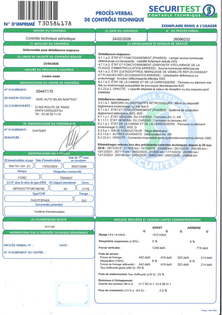 BVM5- RADIO- VITRES ET RETROS ELECT- CAISSE BOIS AVEC RGT- PUB ADH. SIEGES DECHIRES- PLASTIQUES RAYES ET TACHES. NOMBREUX ENFONCEMENTS ET FROTTEMENTS- CORROSION SUR LA CARROSSERIE- FEU ARD CASSE. DEFAILLANCES MAJEURES: VISIBILITE FORTEMENT REDUITE DU FEU AVG- ECLAIRAGE DE LA PLAQUE D'IMMAT AR DEFECTUEUX- CADIATROPE ARD DEFECTUEUX- CARROSSERIE AVD ENDOMMAGEE- DEFAUT D'OPACITE. DEFAILLANCES MINEURES: MIROIR DU RETRO D ENDOMMAGE- ECLAIRAGE AVG ET AVD DEFECTUEUX- CORROSION DU CHASSIS AV,C ET AR- CORROSION DU BERCEAU AV- CARROSSERIE G, ARD, AVD ET D ENDOMMAGEE- SIEGE CONDUCTEUR DEFECTUEUX- DETERIORATION DES OUVRANTS AV ET AR- DEFAUT D'OPACITE. FRAIS JUDICIAIRES/ 11.9% HT.