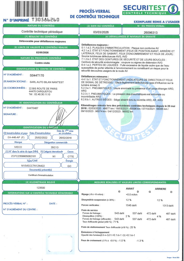BVM6- CLIM- RADIO- VITRES ET RETROS ELECT- REGULATEUR DE VITESSES- ATTELAGE REMORQUE MIXTE. PTAC = 3.5T / RIDELLES ACIER / CABINE 7 PLACES / DOUBLE ESSIEUX . SIEGES EN TISSU TACHES- SIEGE CONDUCTEUR DECHIRE- PLASTIQUES RAYES ET TACHES- ( BANQUETTE AR DEMONTEE ET DEPOSEE DANS LA BENNE). PARE CHOCS AV CASSE- CHOCS SUR LES RIDELLES- FROTTEMENT SUR LA RIDELLE COTE. DEFAILLANCES MAJEURES: PLAQUE D'IMMAT AV NON CONFORME- DEFAUT D'ECLAIRAGE DES FEUX AVG ET AVD- CEINTURE DE SECURITE AVG ENDOMMAGEE- FUITE D'HUILE. DEFAILLANCES MINEURES: GLACE DEFECTUEUSE DU FEU DE DETRESSE- G- USURE ANORMALE DES PNEUS ARD ET ARG- SIEGE AR ABSENT FRAIS JUDICIAIRES: 11.9% HT.