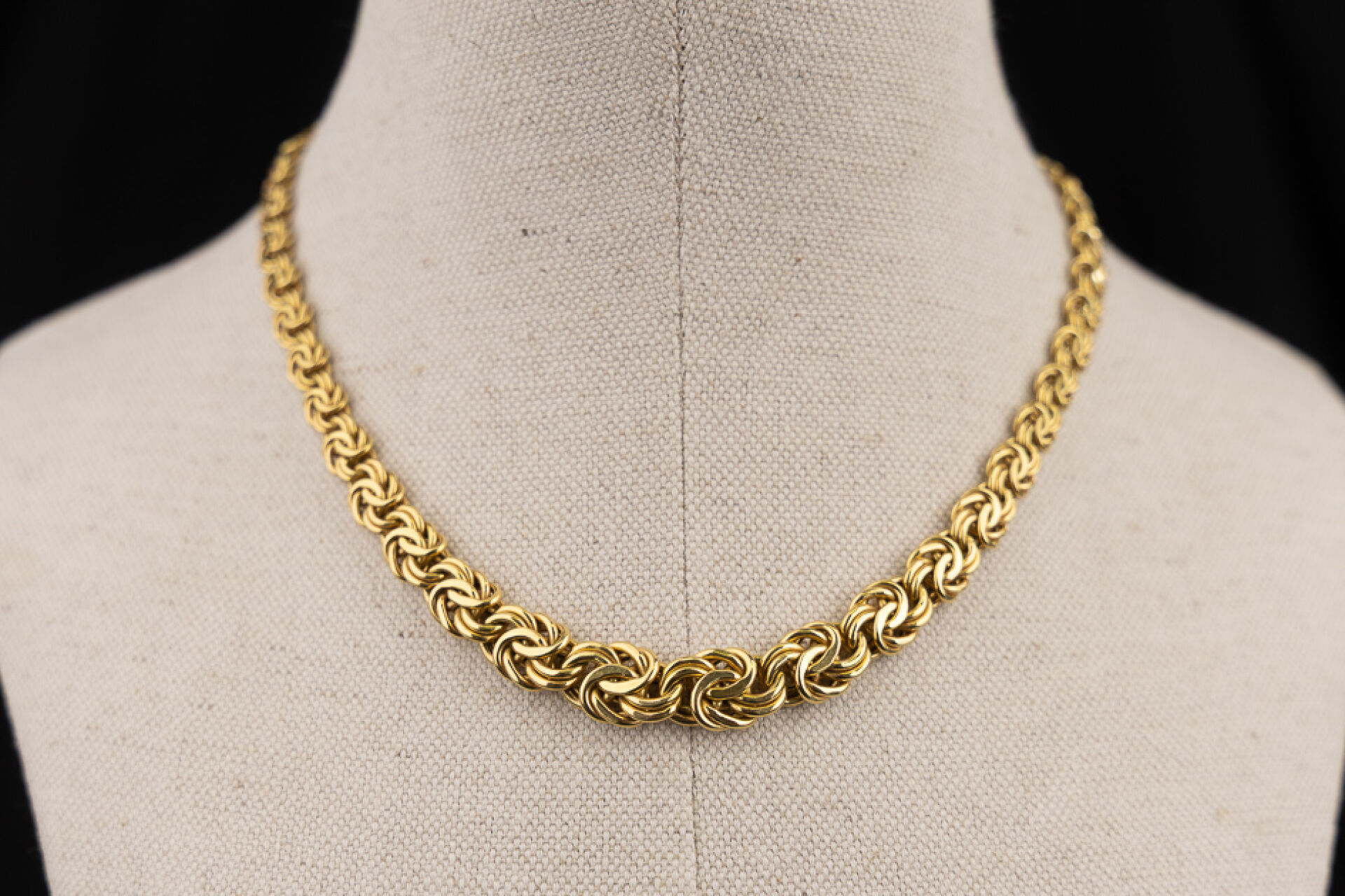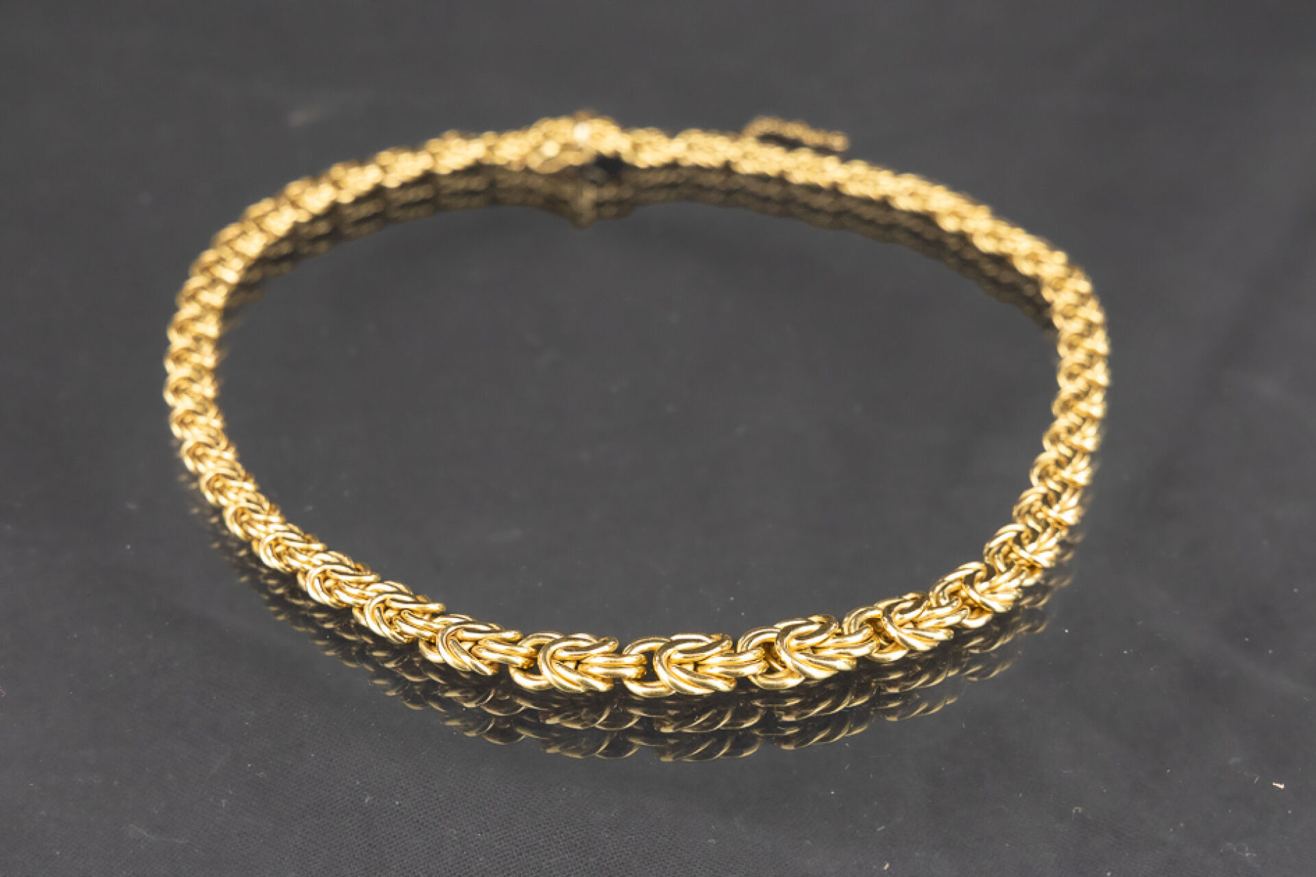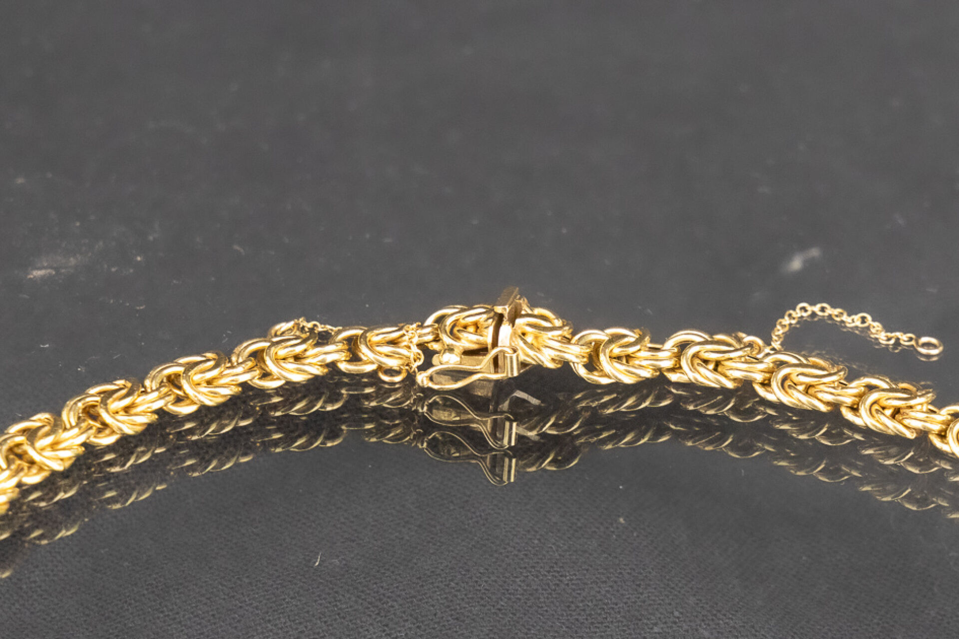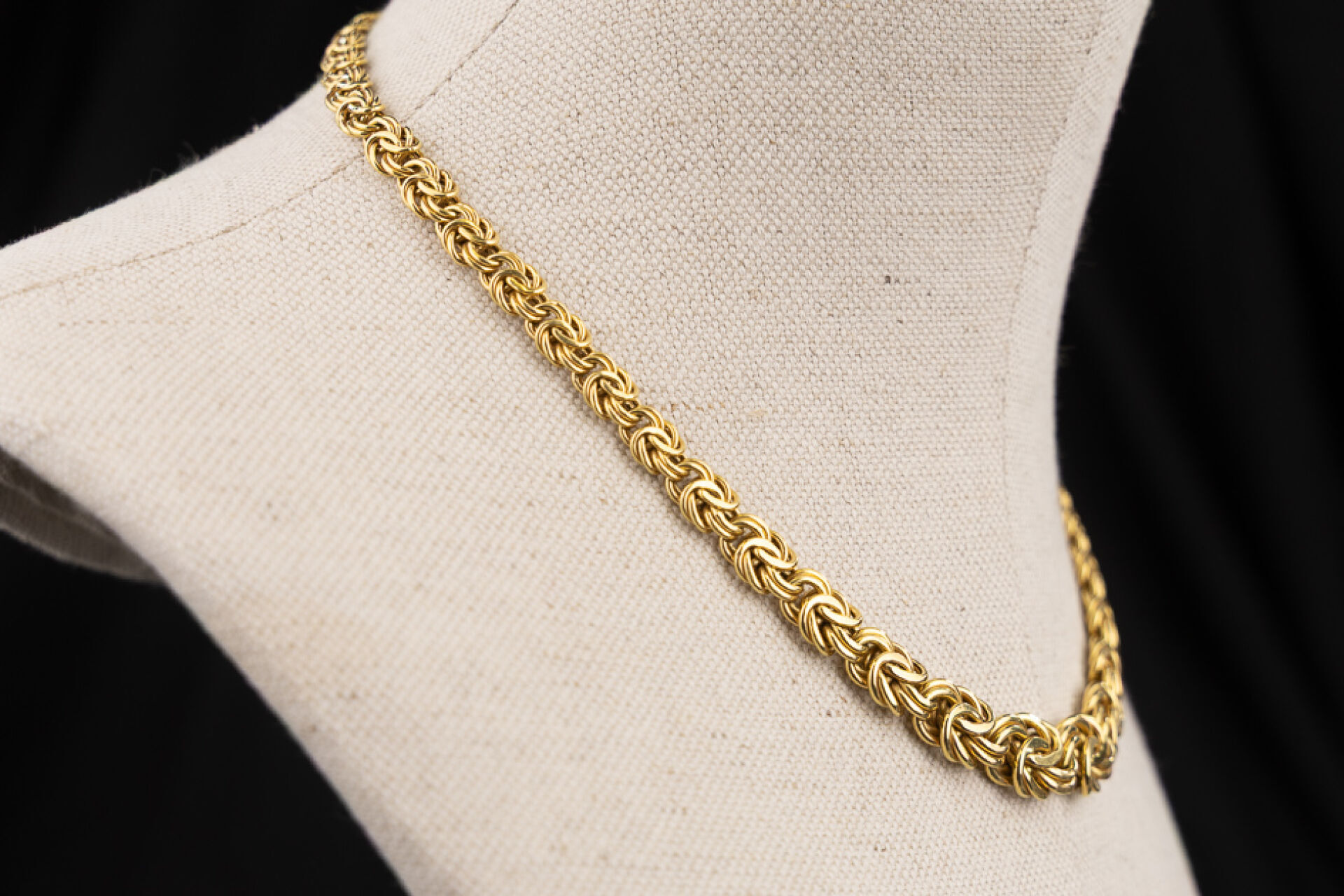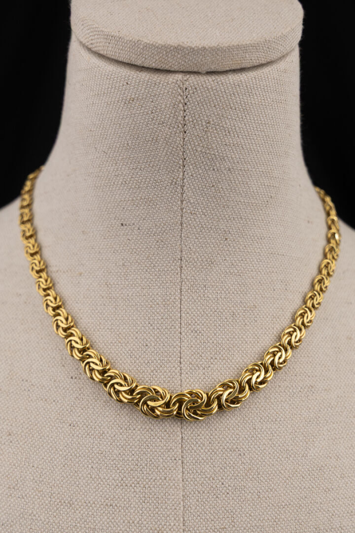 Collier en or jaune 18k (750 millièmes) à mailles mêlées, fermoir avec chainette et huit de sécurité Long. : 46.5 cm - Prof. : 26.9 gr