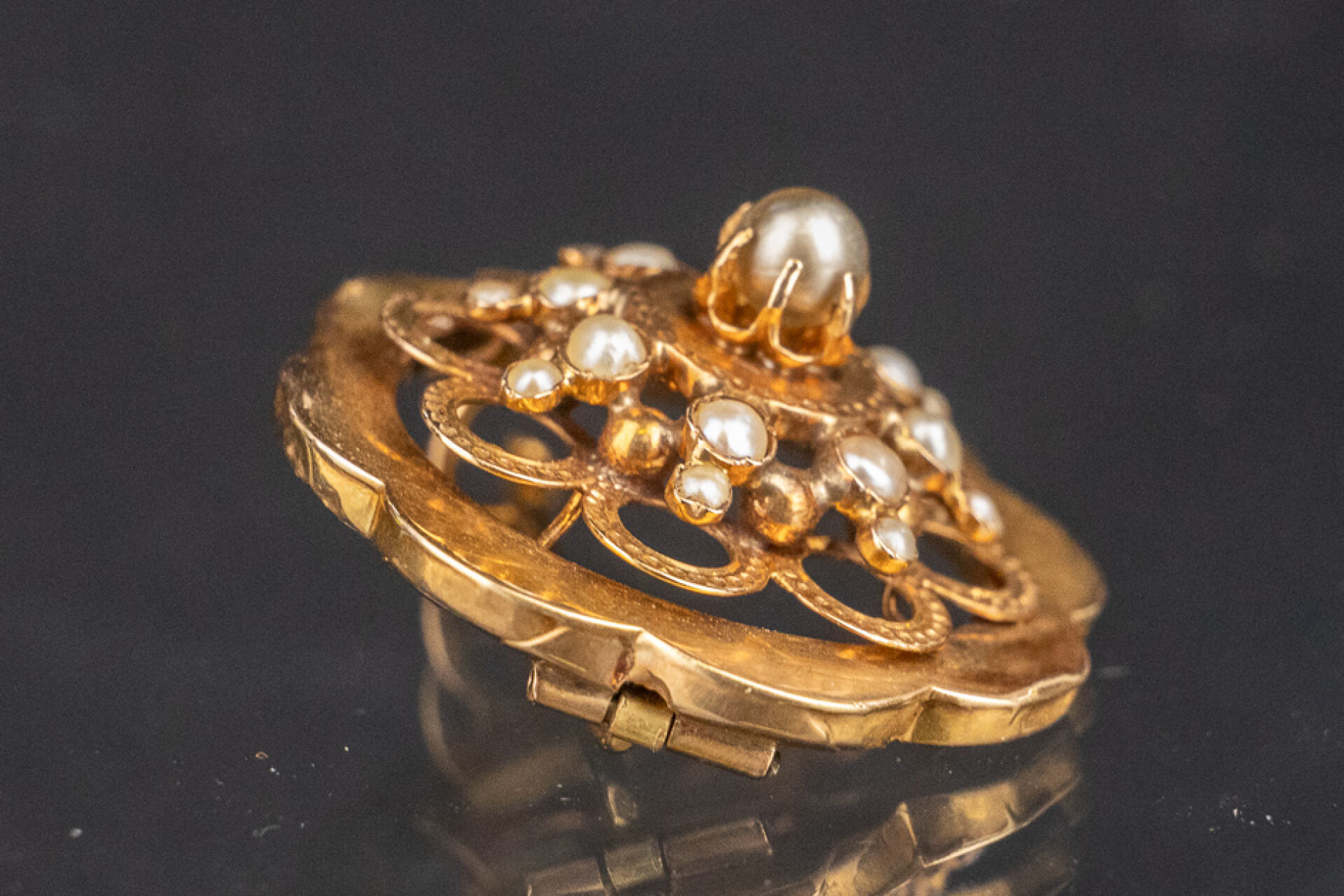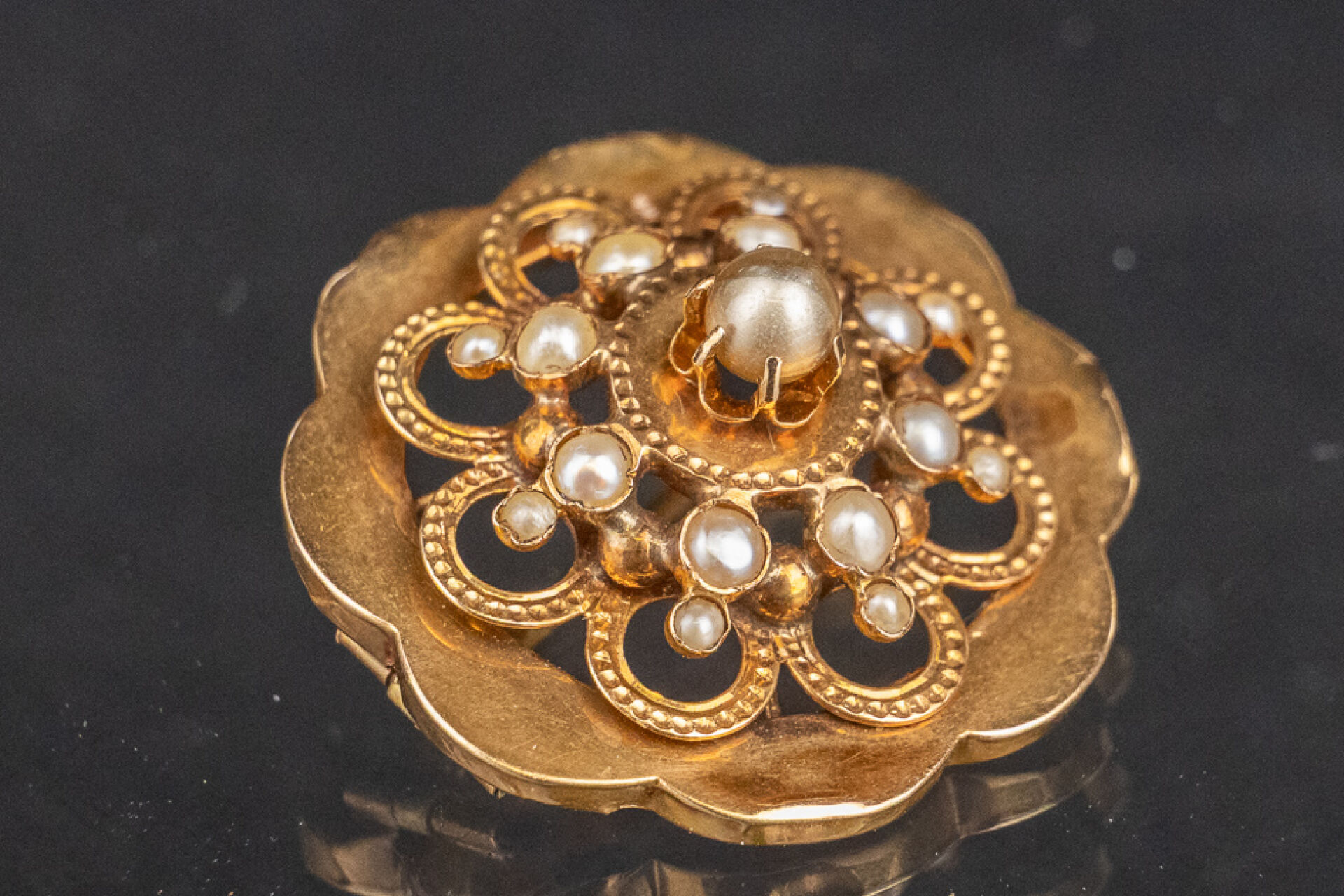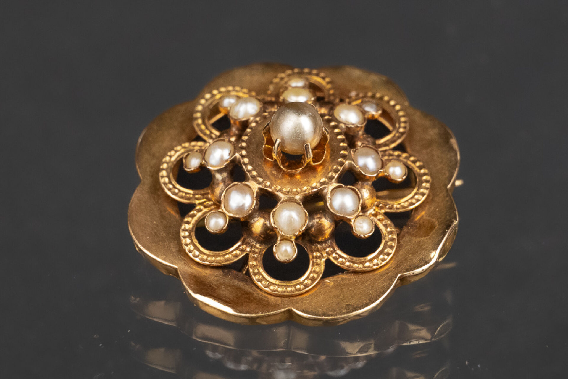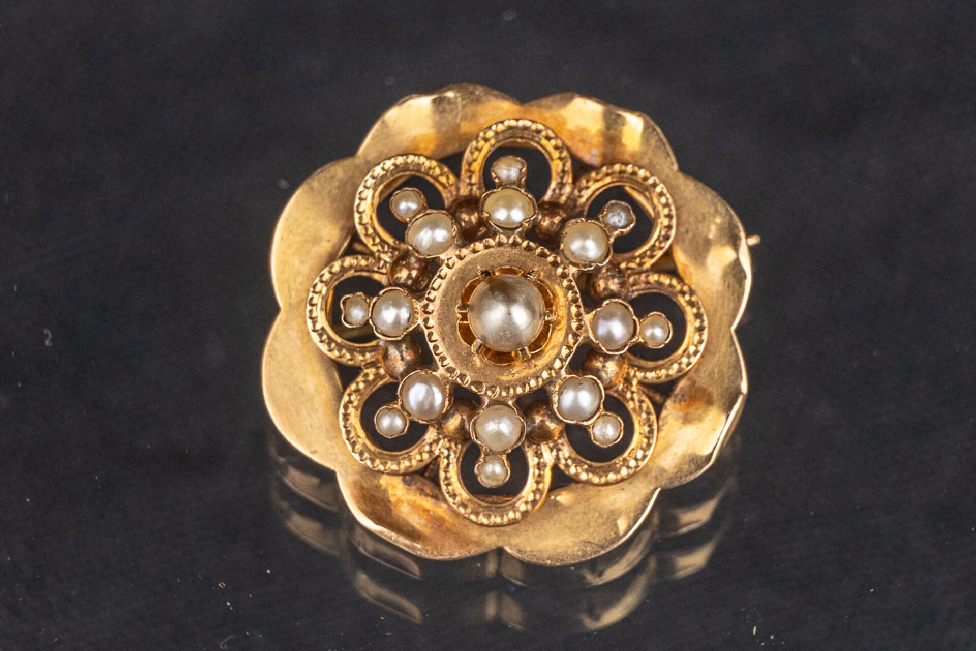 Broche en or rose 18k (750 millièmes) polylobé ajouré rehaussée de perles. Diam. : 3 cm - Poids brut : 3.2 gr
