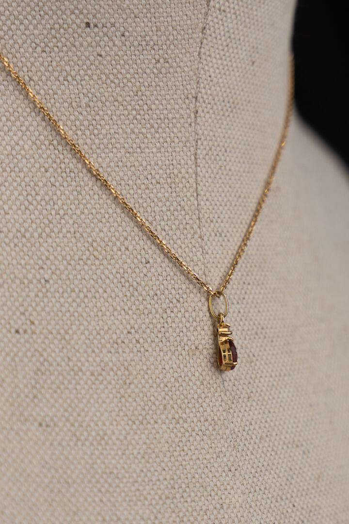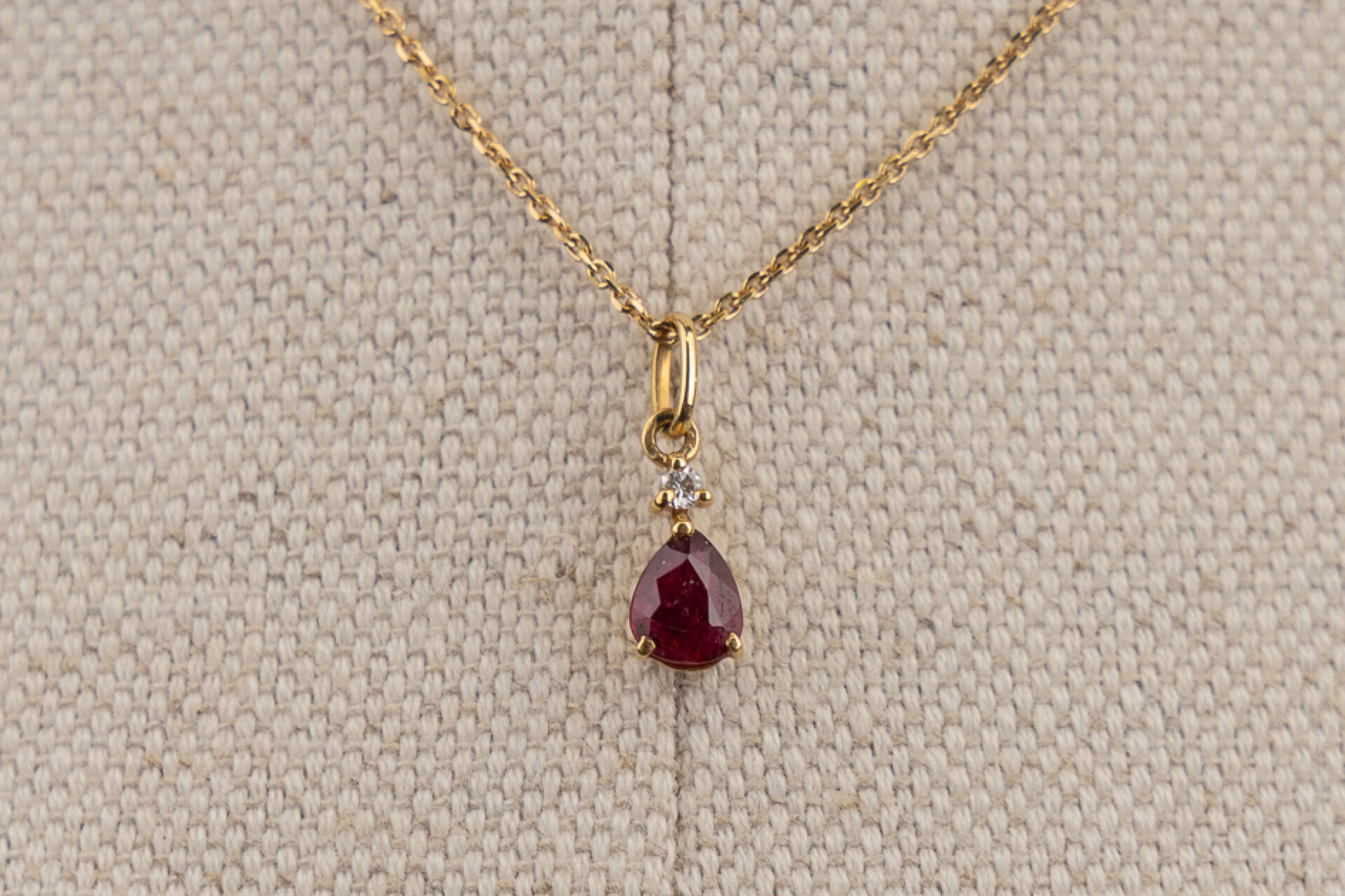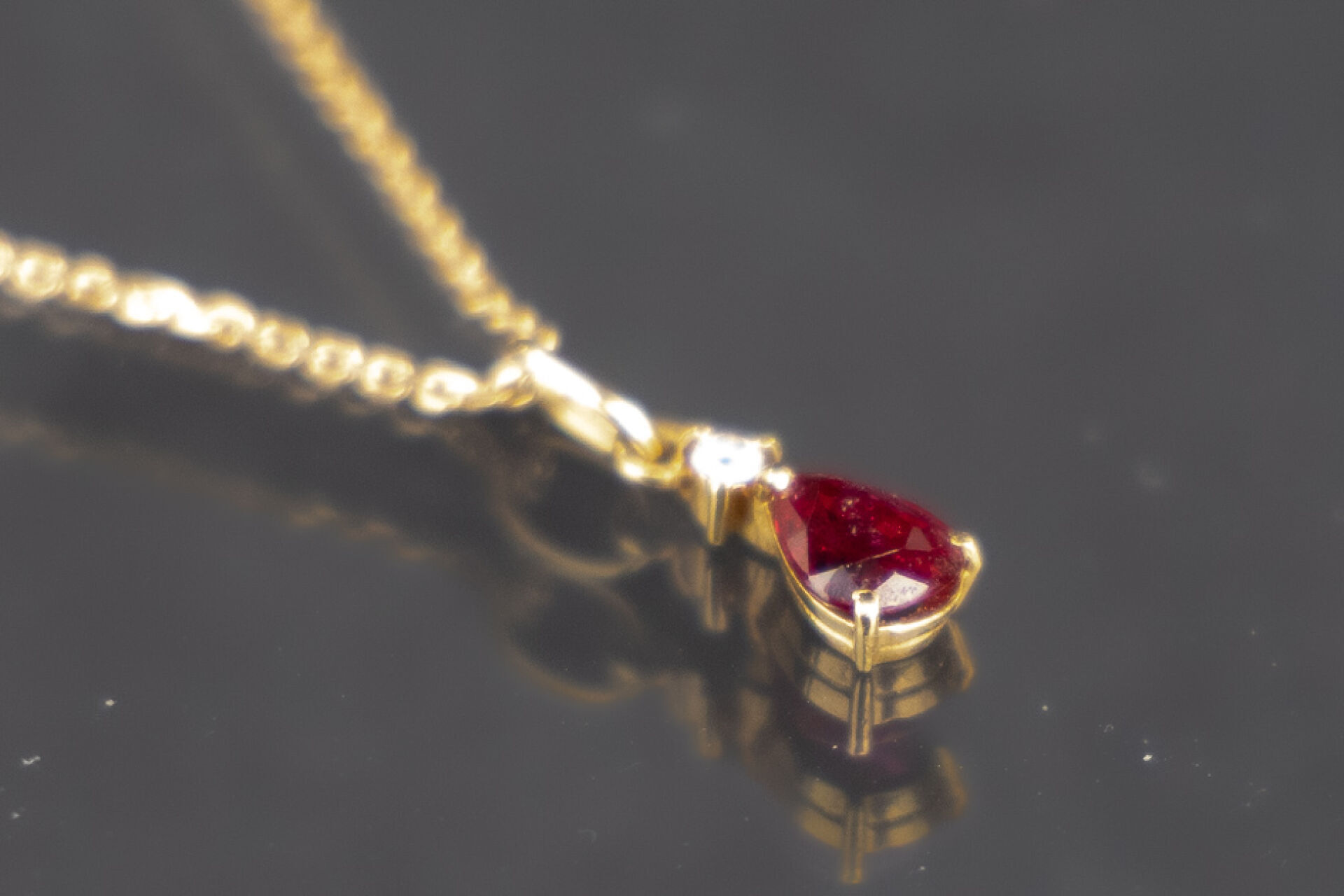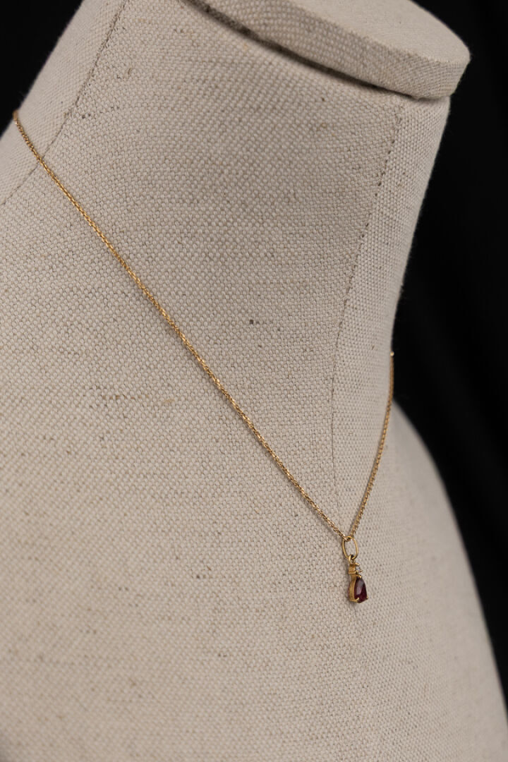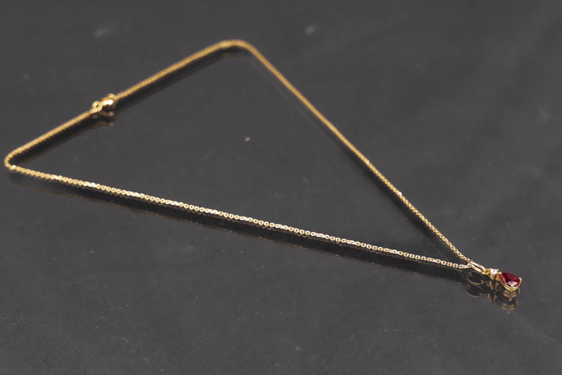 Chaine en or jaune 18k (750 millièmes) retenant une pierre rouge surmonté d'un brillant. Poids brut 3 gr - Long. : 40 cm